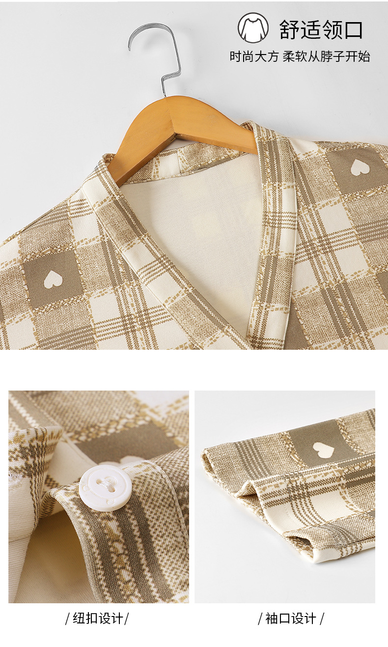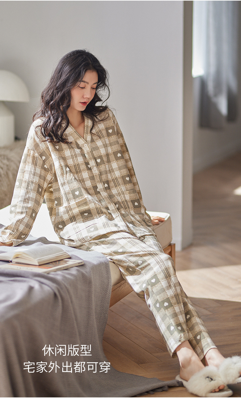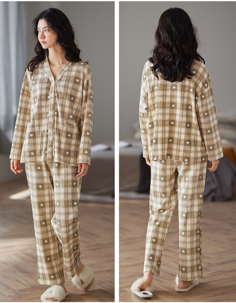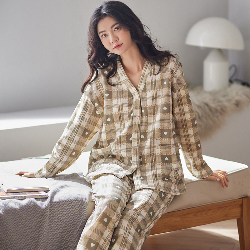 봄과 가을 새로운 긴 소매 양면 순면 부드러운 귀여운 잠옷 여성의 달콤한 느슨한 기모노 칼라 격자 홈 옷 세트스토어 가기