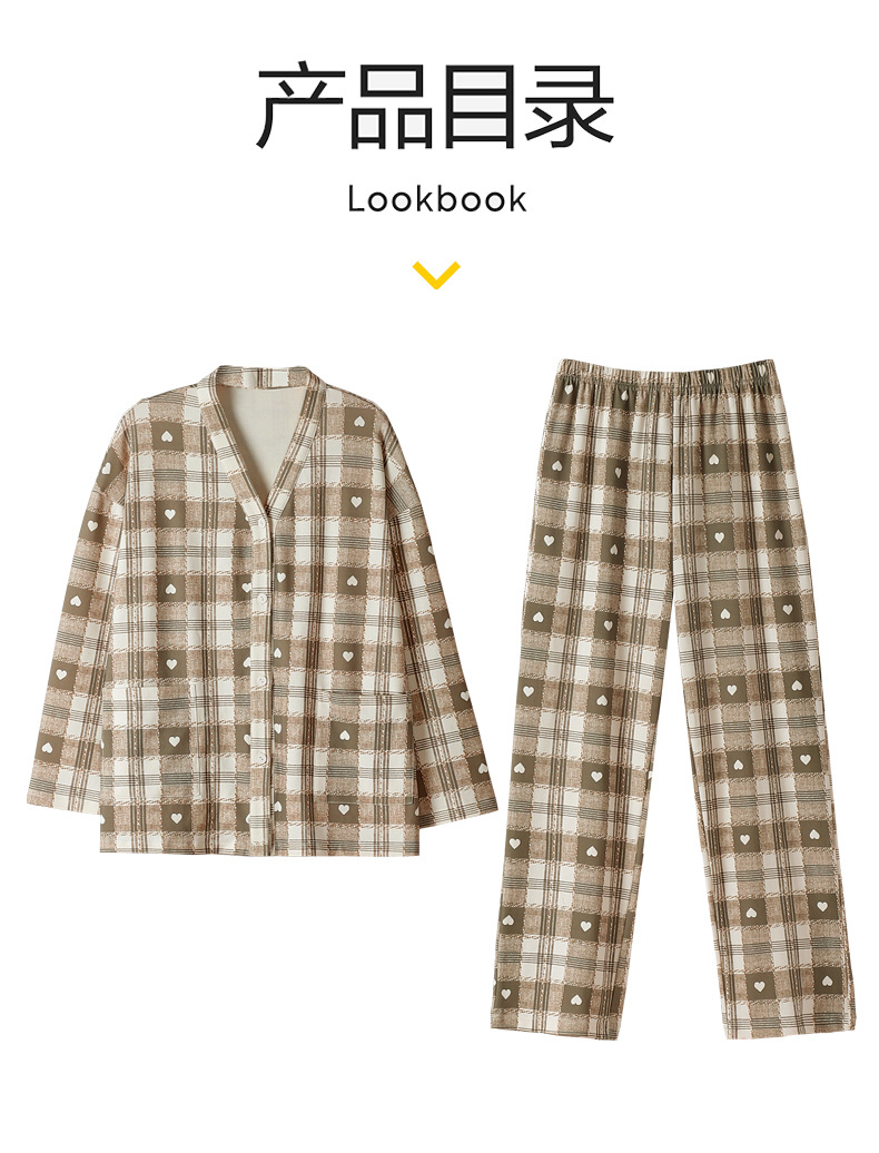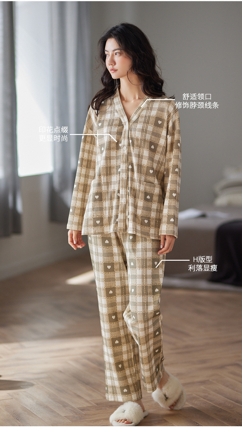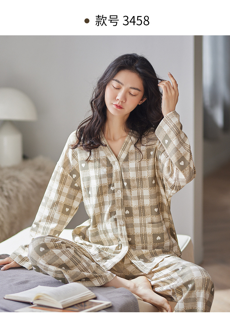 봄과 가을 새로운 긴 소매 양면 순면 부드러운 귀여운 잠옷 여성의 달콤한 느슨한 기모노 칼라 격자 홈 옷 세트스토어 가기