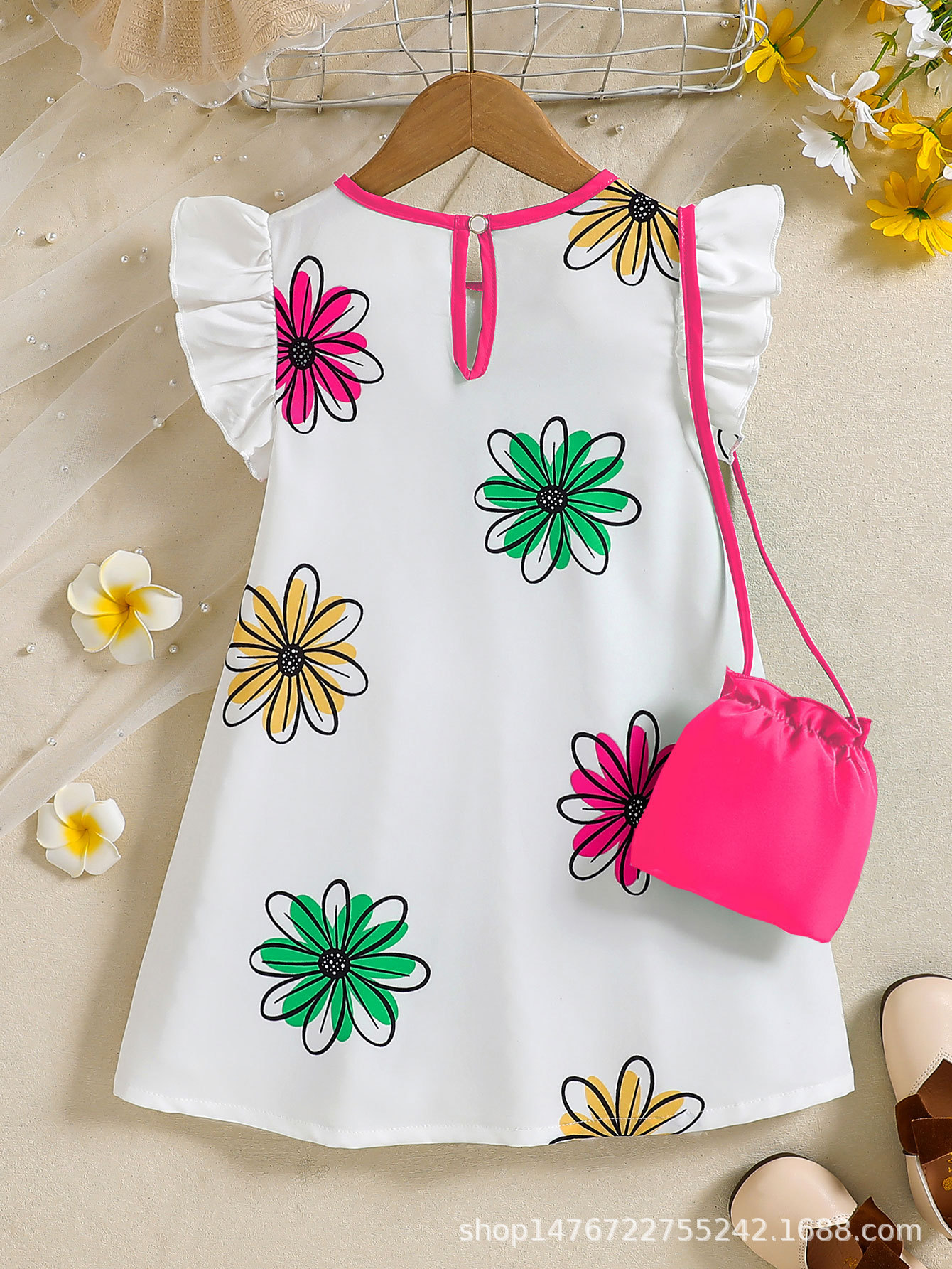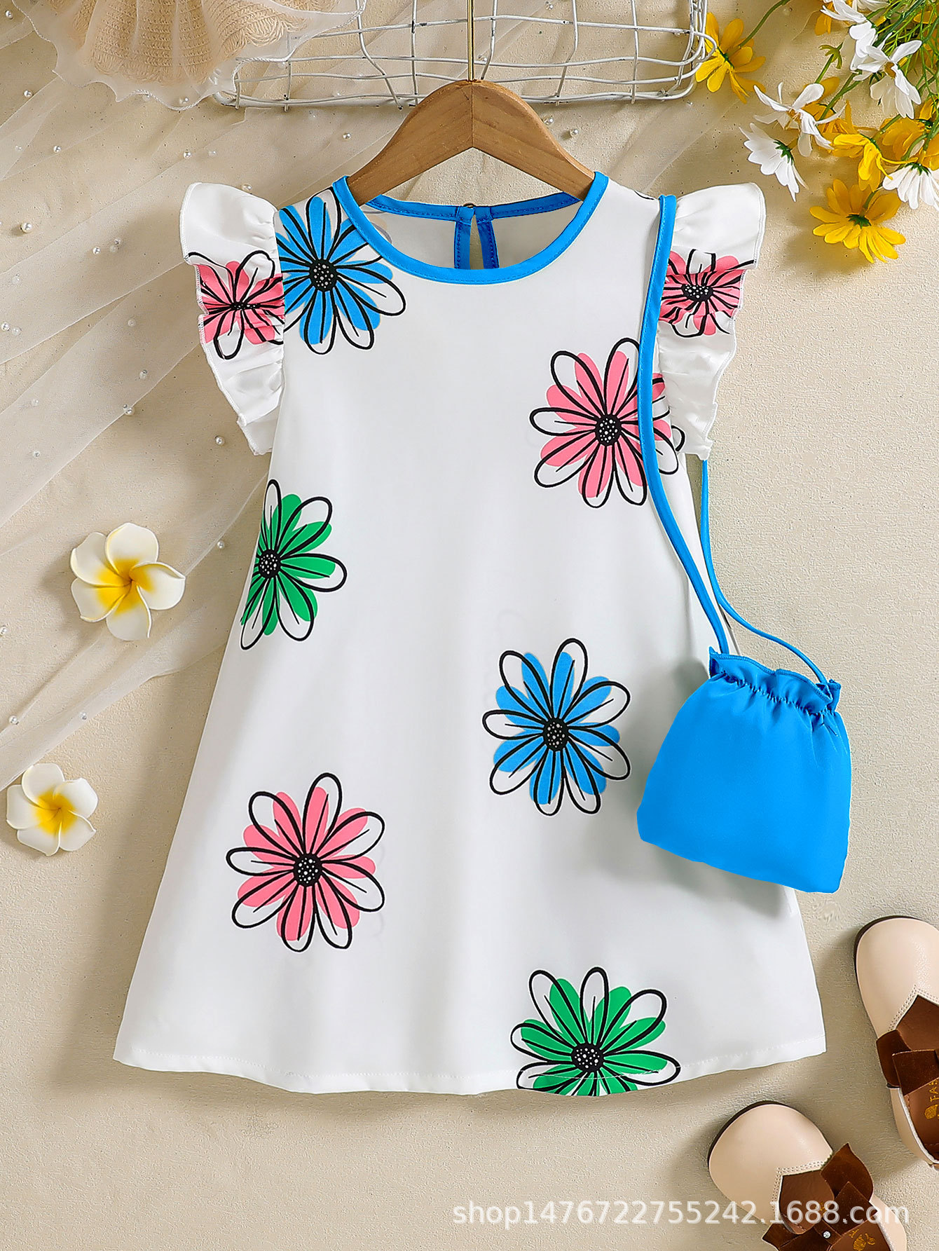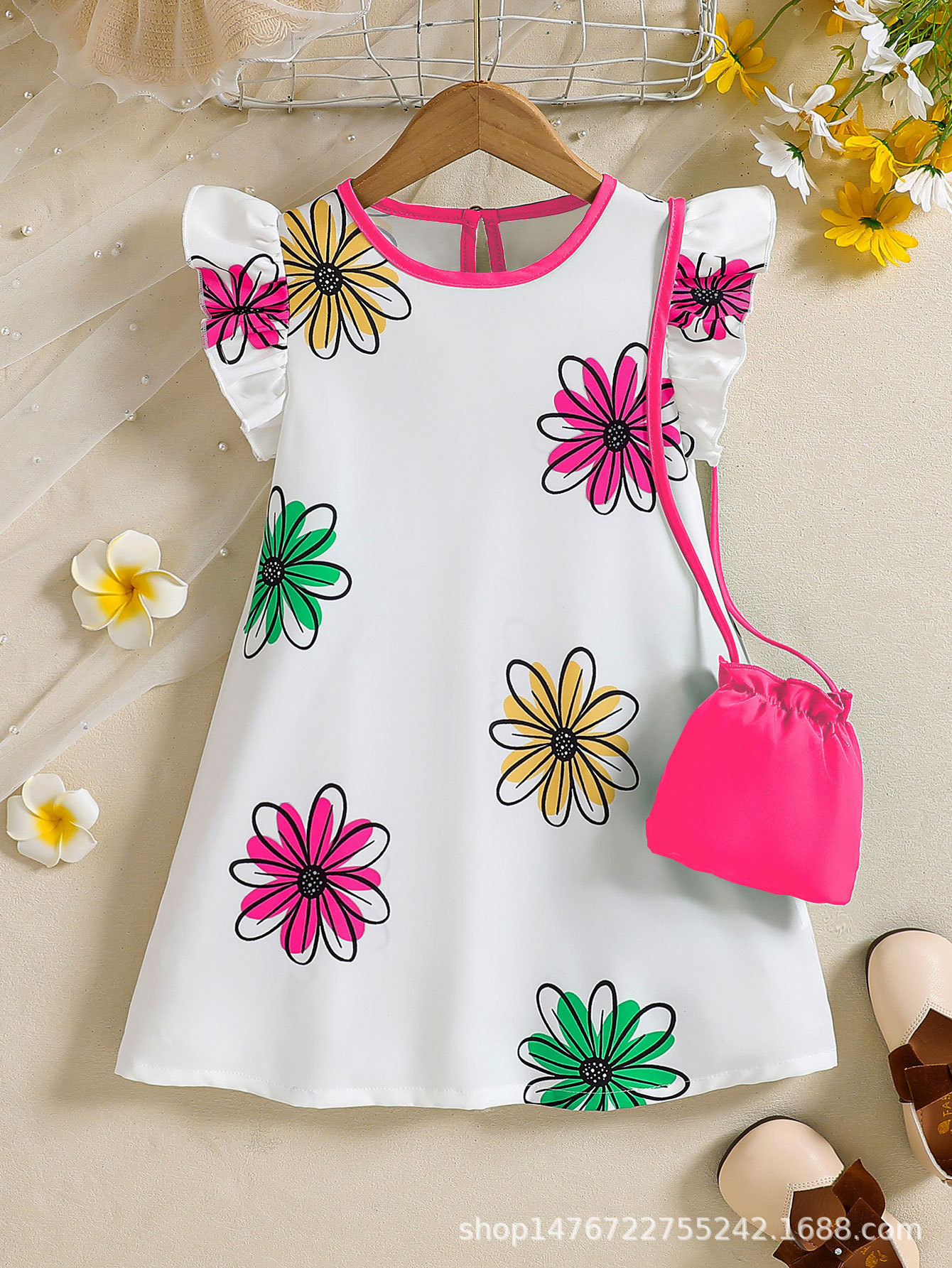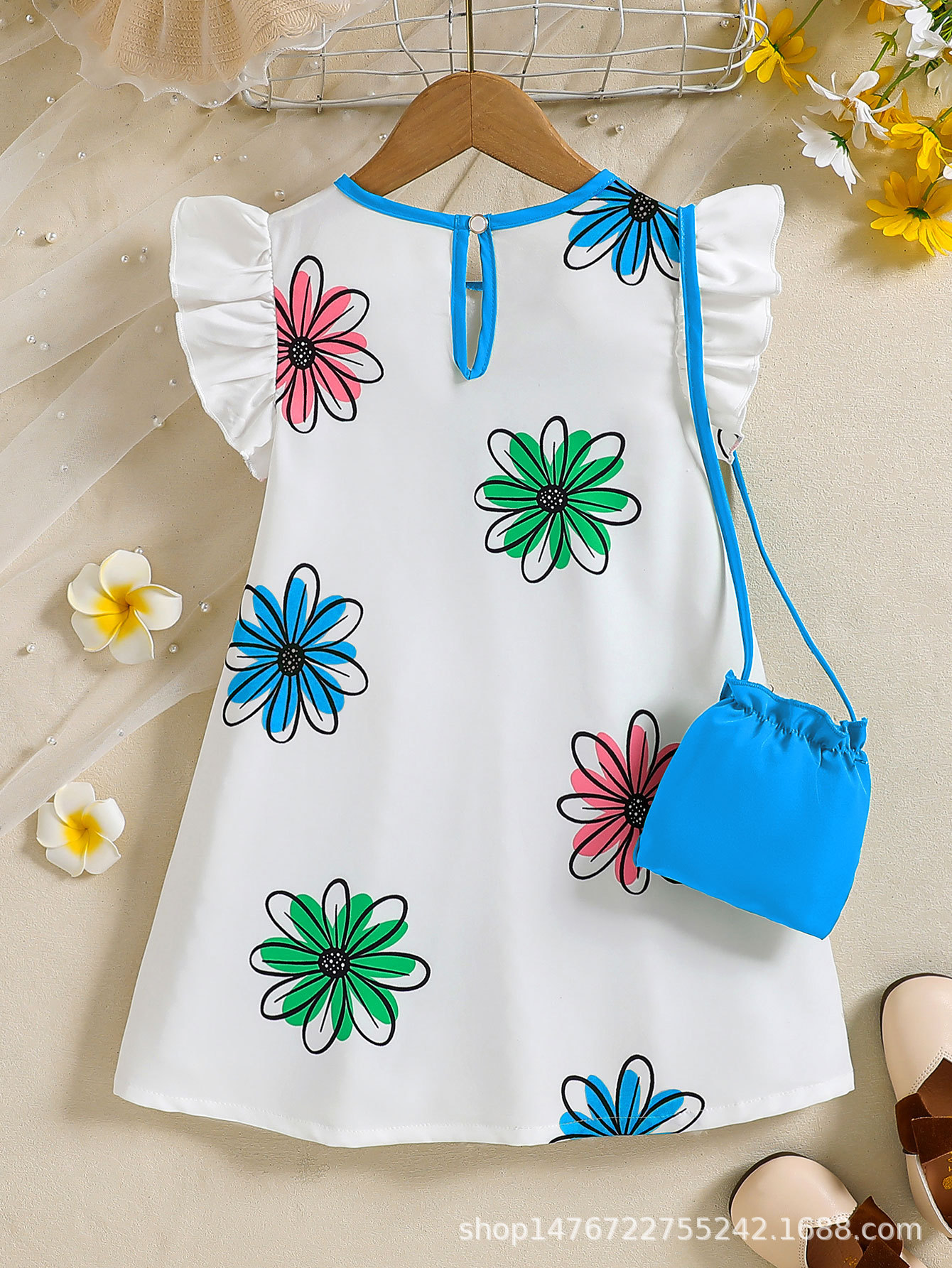 국경 간 유럽과 미국의 소녀 컬러 꽃 인쇄 작은 비행 소매 리어 칼라 워터 드롭 버클 캐주얼 느슨한 원피스스토어 가기