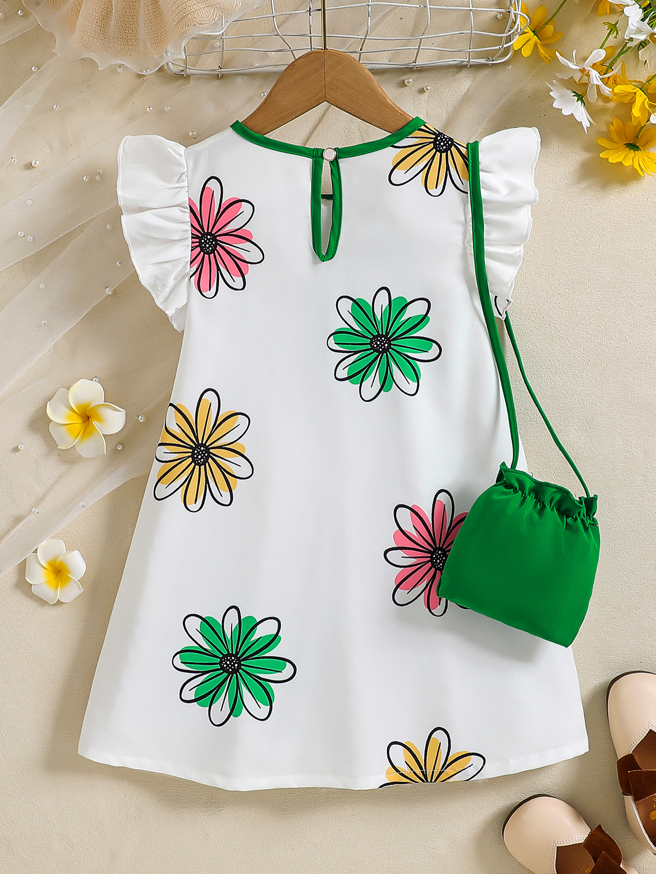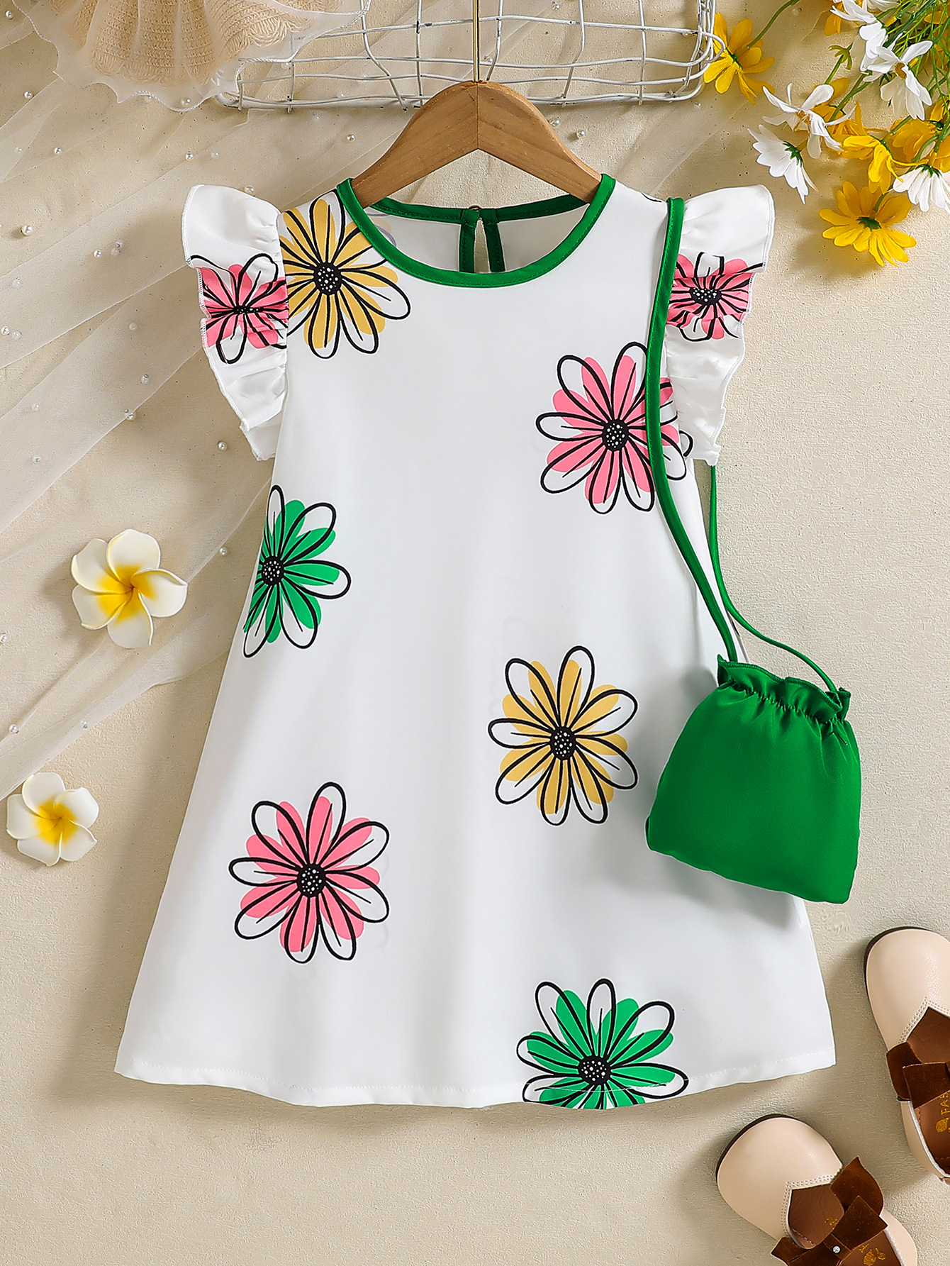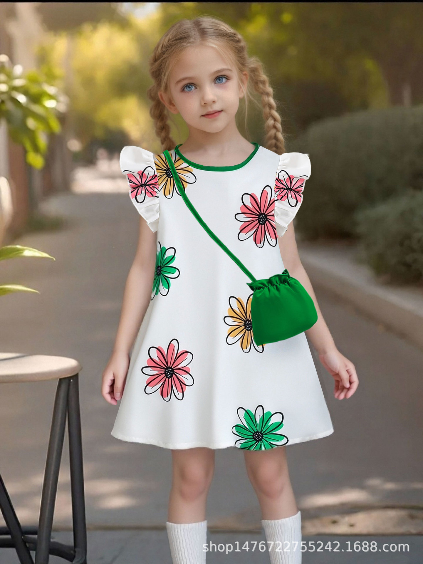 국경 간 유럽과 미국의 소녀 컬러 꽃 인쇄 작은 비행 소매 리어 칼라 워터 드롭 버클 캐주얼 느슨한 원피스스토어 가기