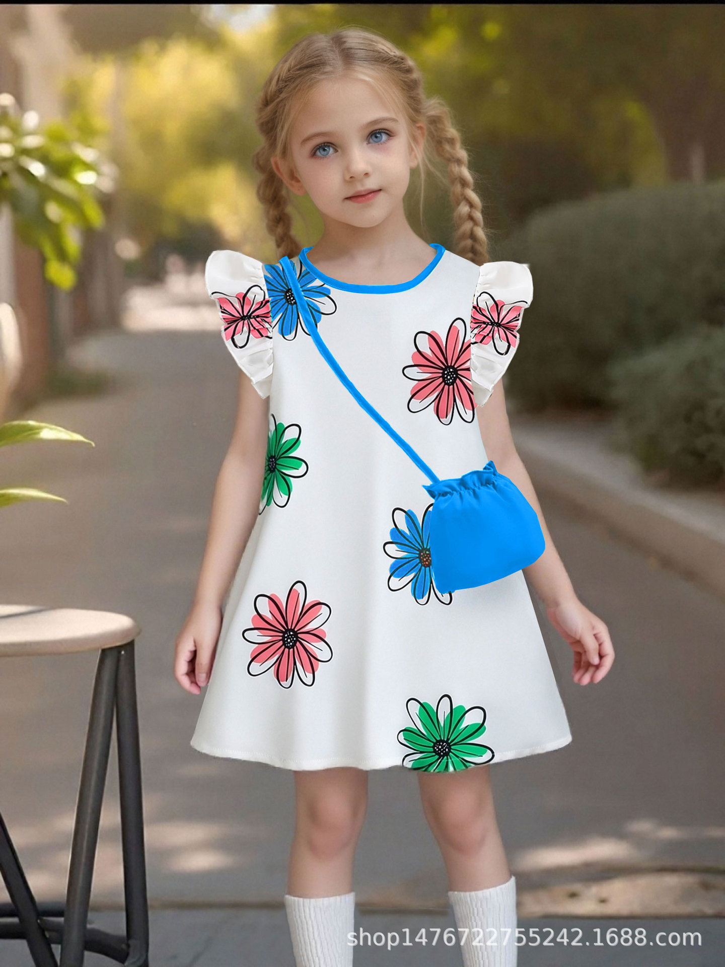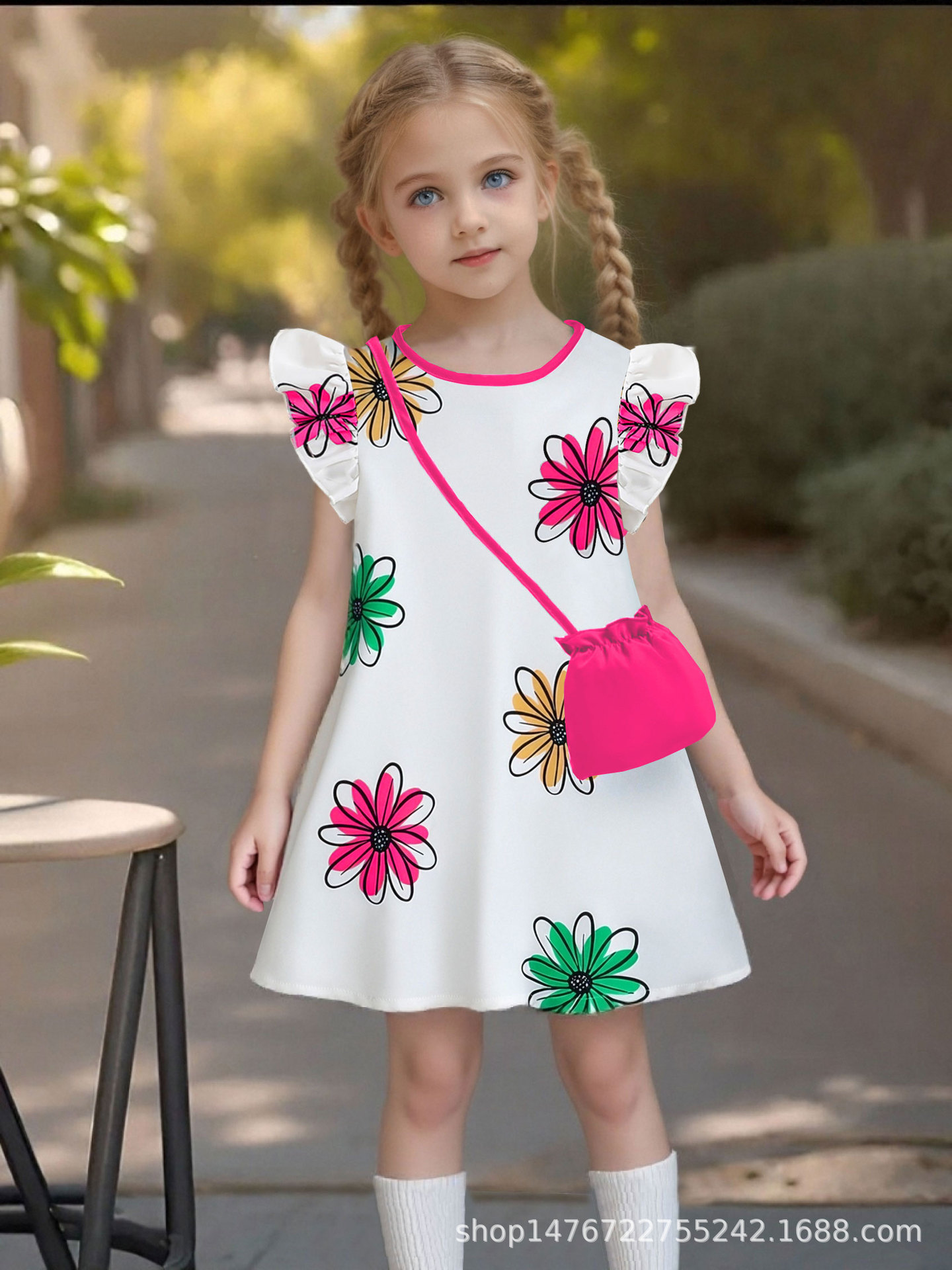 국경 간 유럽과 미국의 소녀 컬러 꽃 인쇄 작은 비행 소매 리어 칼라 워터 드롭 버클 캐주얼 느슨한 원피스