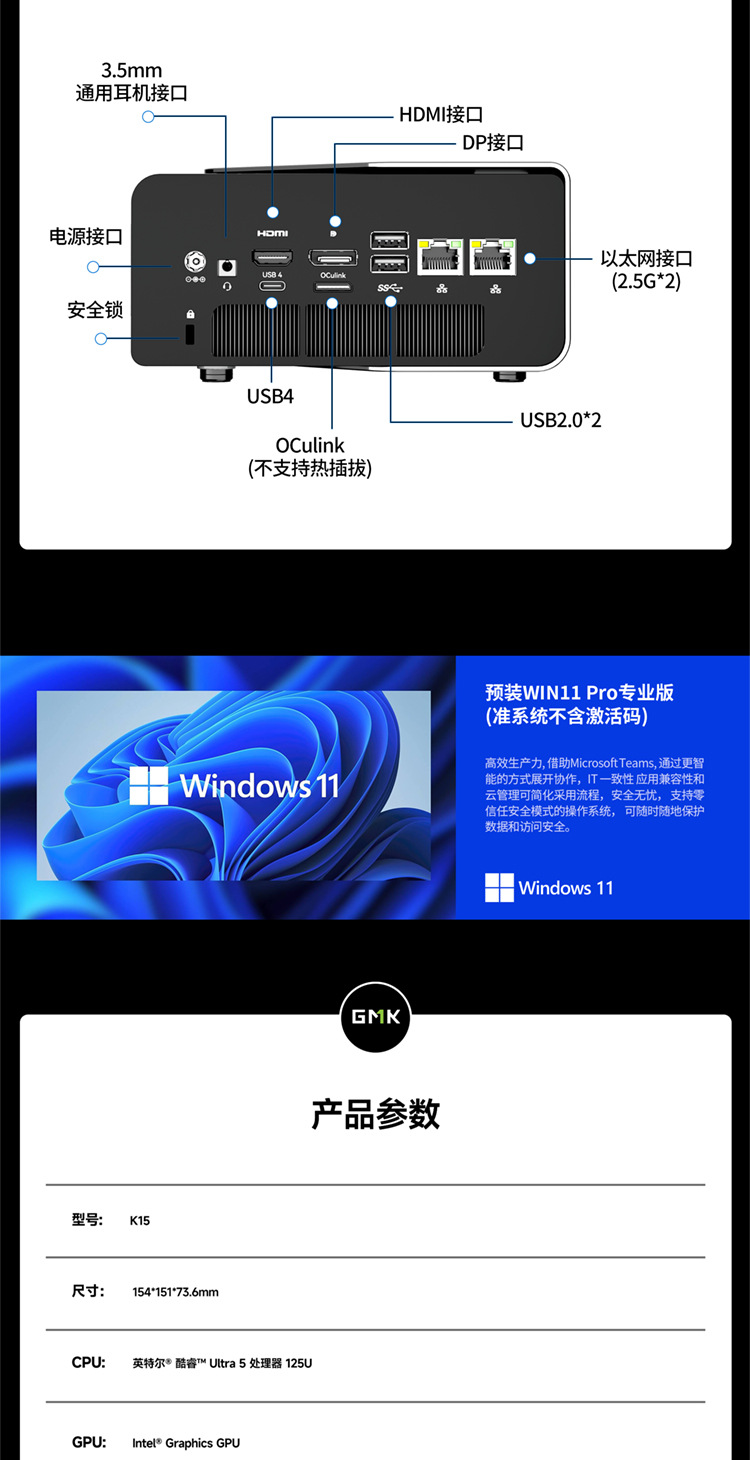 지모커 K15 Ultra5 125U 고성능 미니 컴퓨터 게임용 사무용 AI 초고속 데스크탑 컴퓨터