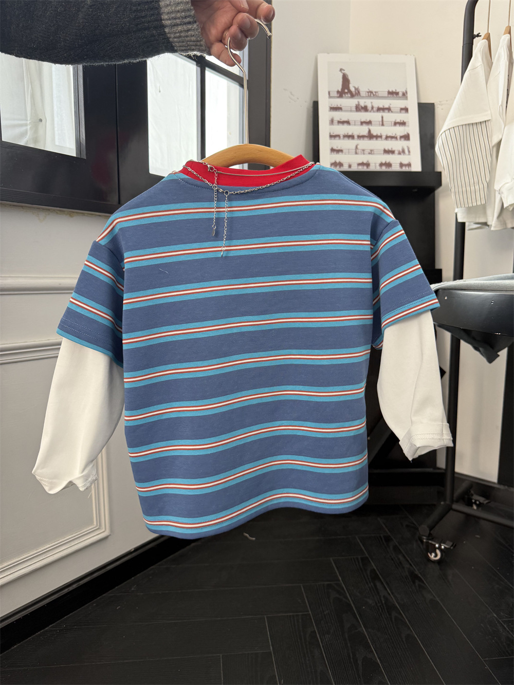 2025 봄 새 소년 ruffian 잘 생긴 붉은 파란색 줄무늬 색상 일치하는 가짜 두 티셔츠 어린이 밝은 색상 바느질 긴 소매