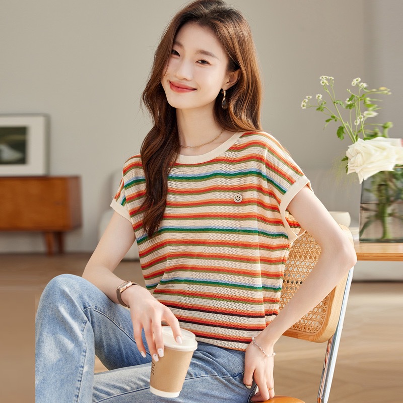 레인보우 스트라이프 라운드 넥 반팔 티셔츠 여성용 어깨 여름 2025 새로운 스타일 얇은 고급 아이스 실크 니트 탑