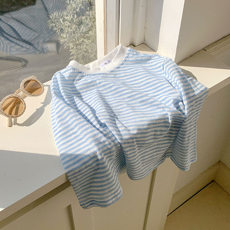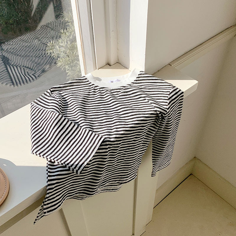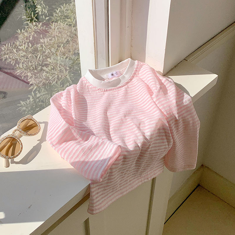 한국식 선 스크린 옷 어린이 옷 새로운 세련 된 소년들과 소녀들의 유행 느슨한 긴팔 줄무늬 티셔츠 탑스토어 가기