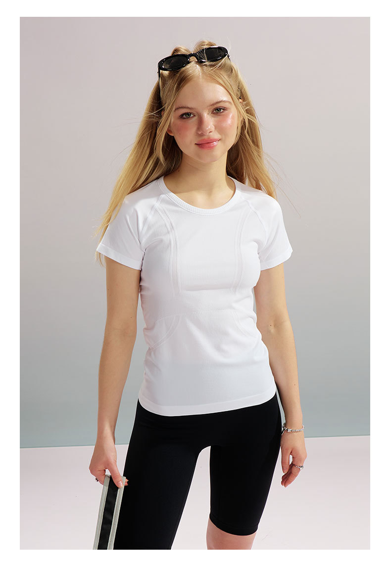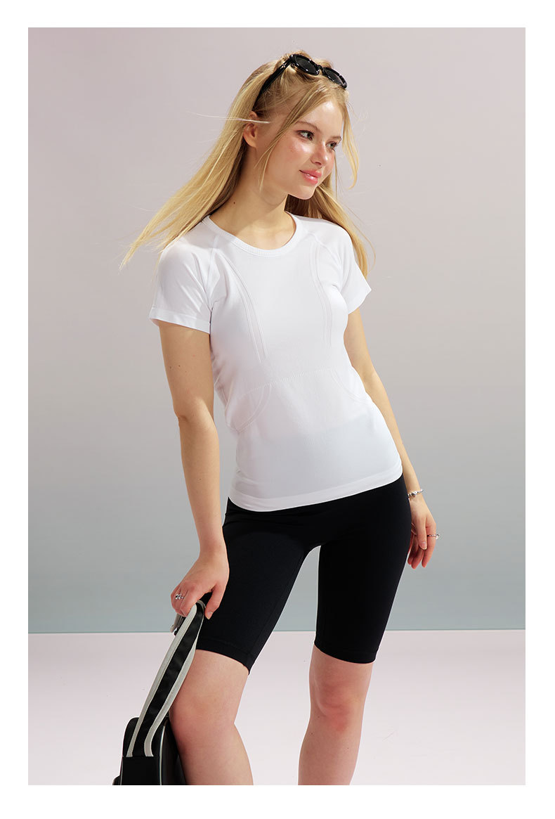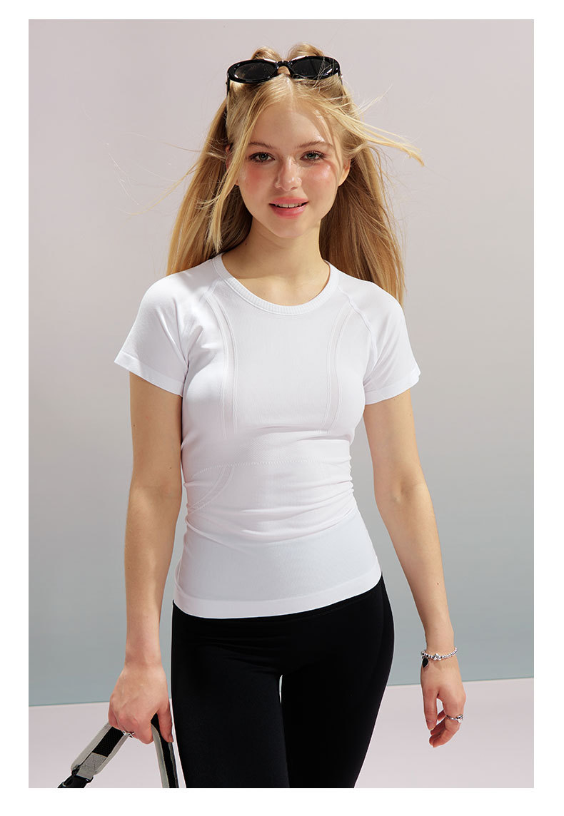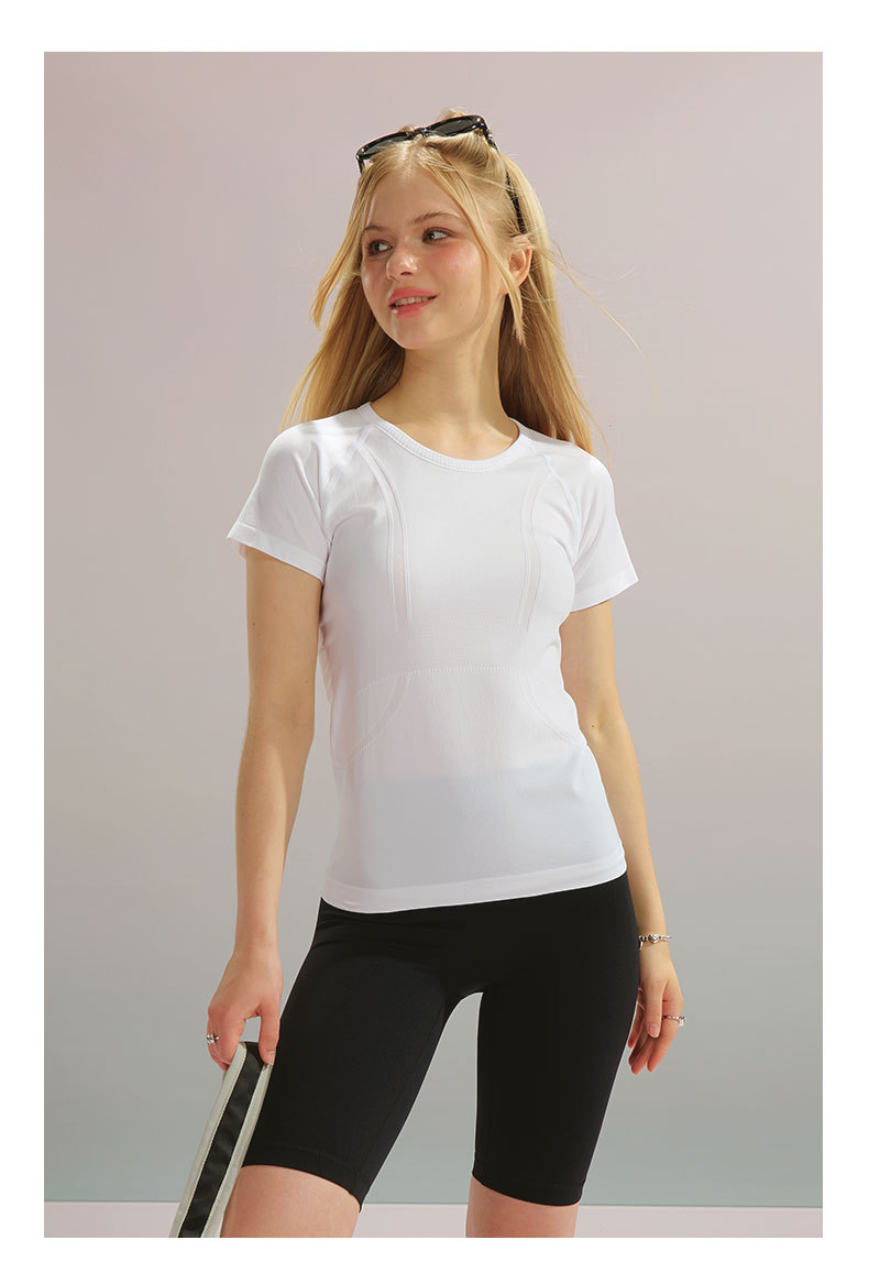 봄과 여름 여성의 벌거 벗은 감각에 맞는 슬림핏 달리기 피트니스 라운드 넥 높은 탄성 요가 짧은 소매를위한 두 배의시 원활한 요가 세트