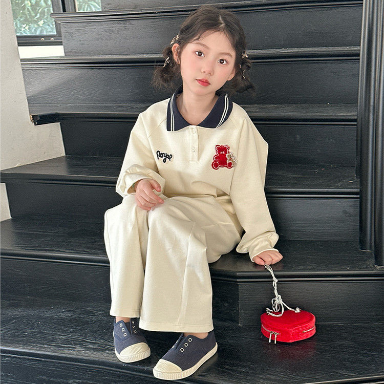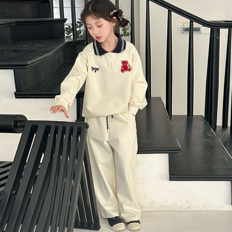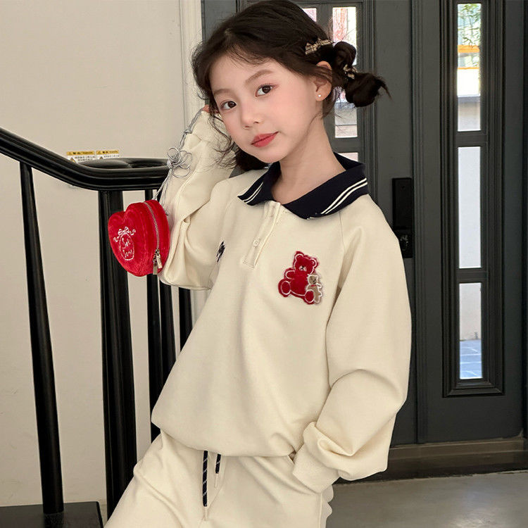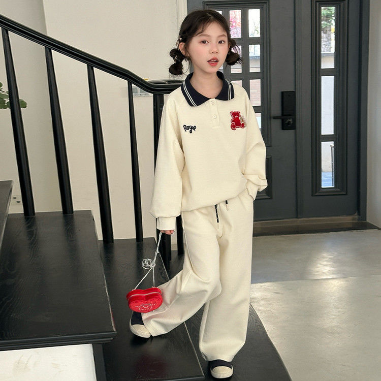 한국 여자 세트 봄 2025 새로운 유행 어린이 봄 캐주얼 느슨한 서양식 땀 바지 투피스 세트