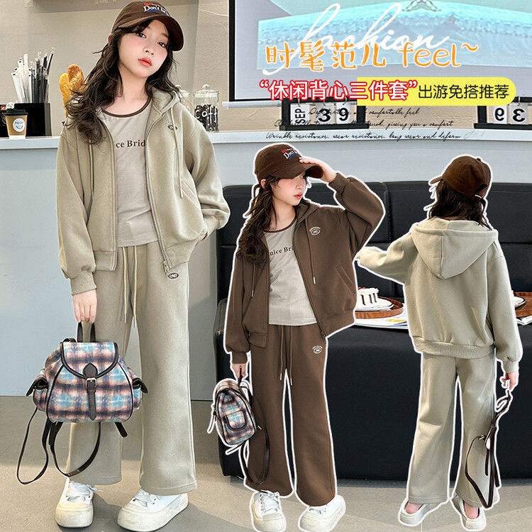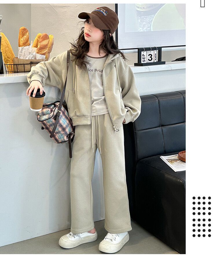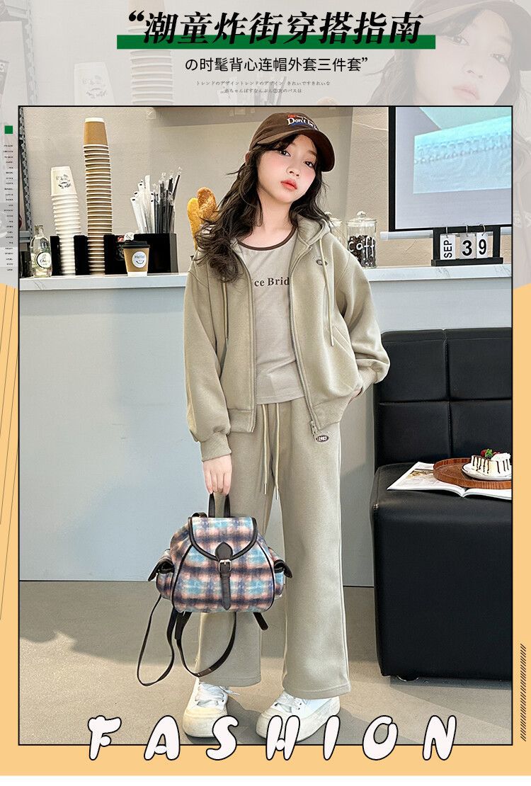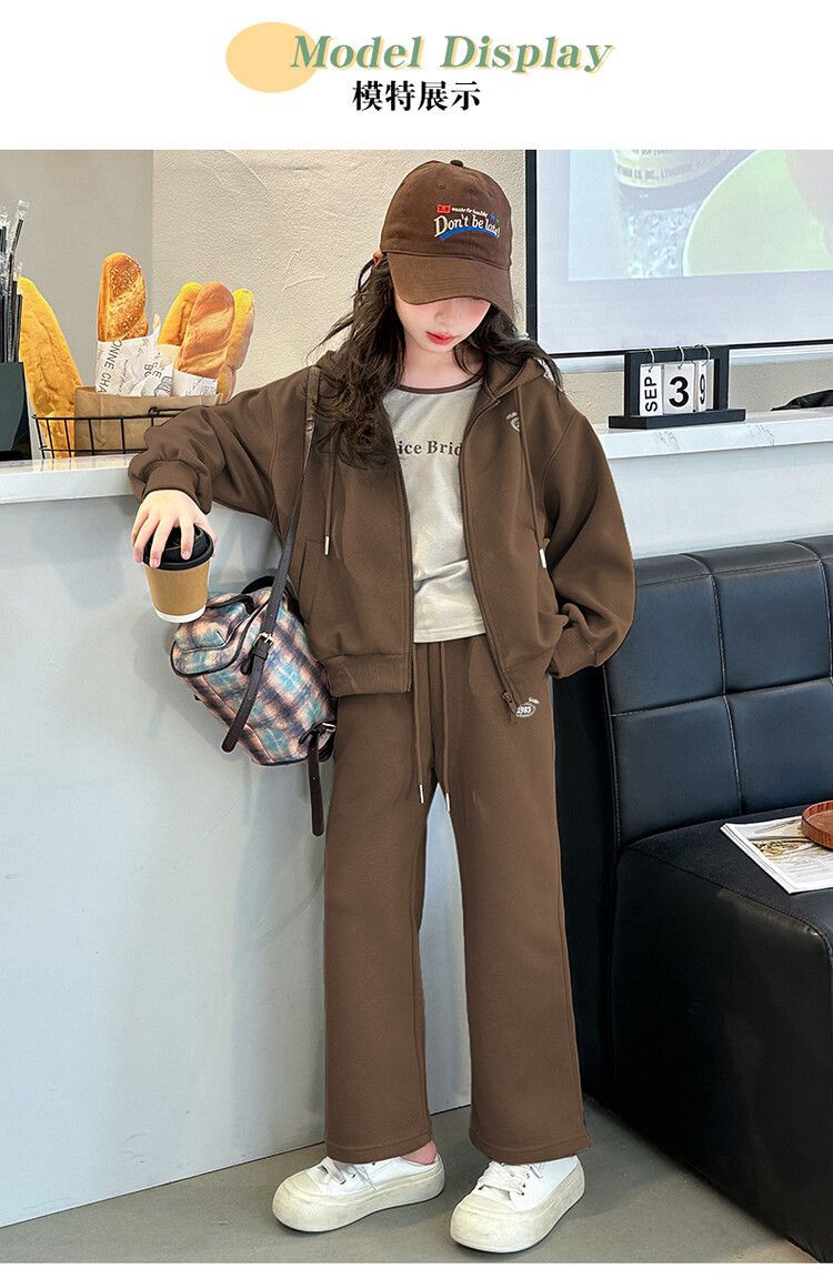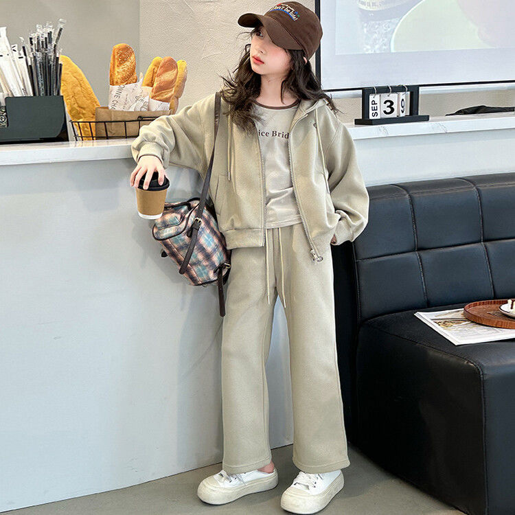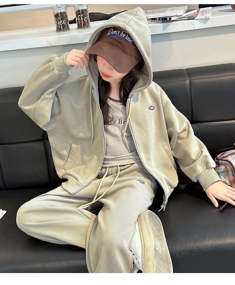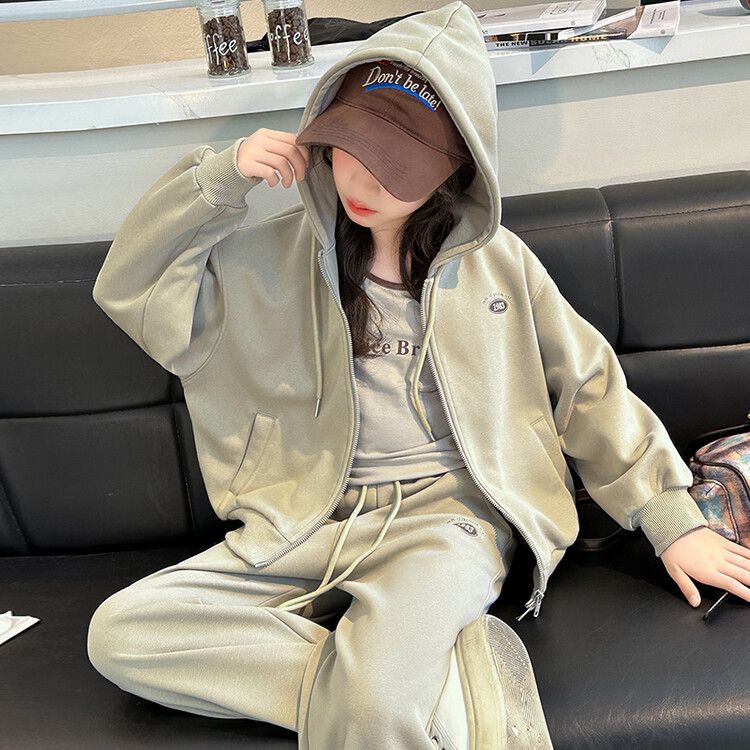 소녀 세트 2024 가을 후드 더블 지퍼 재킷 소녀의 패션 유행 캐주얼 패션 3 피스 세트스토어 가기