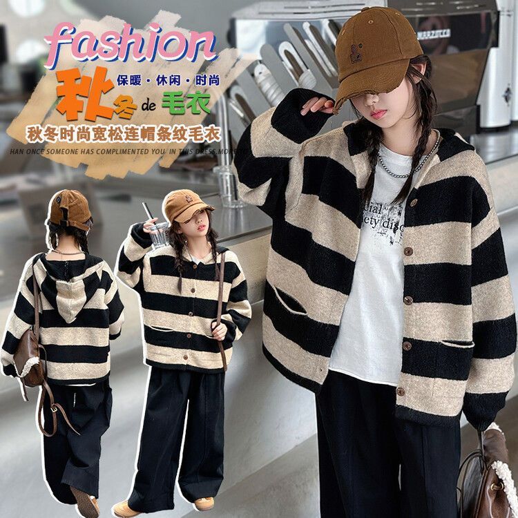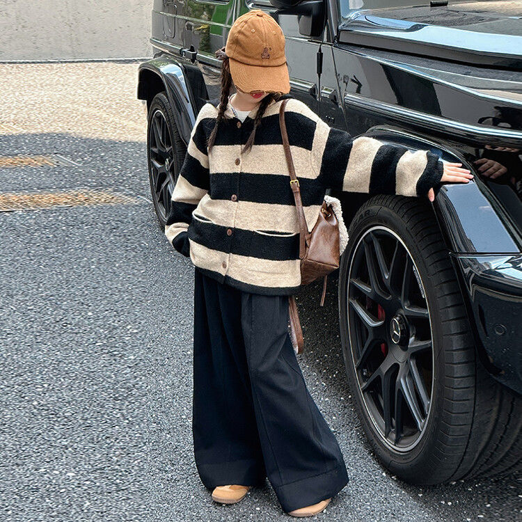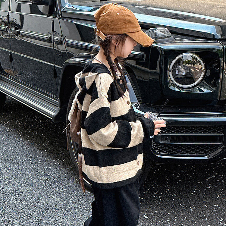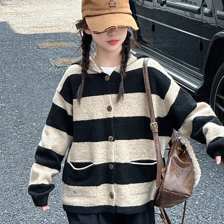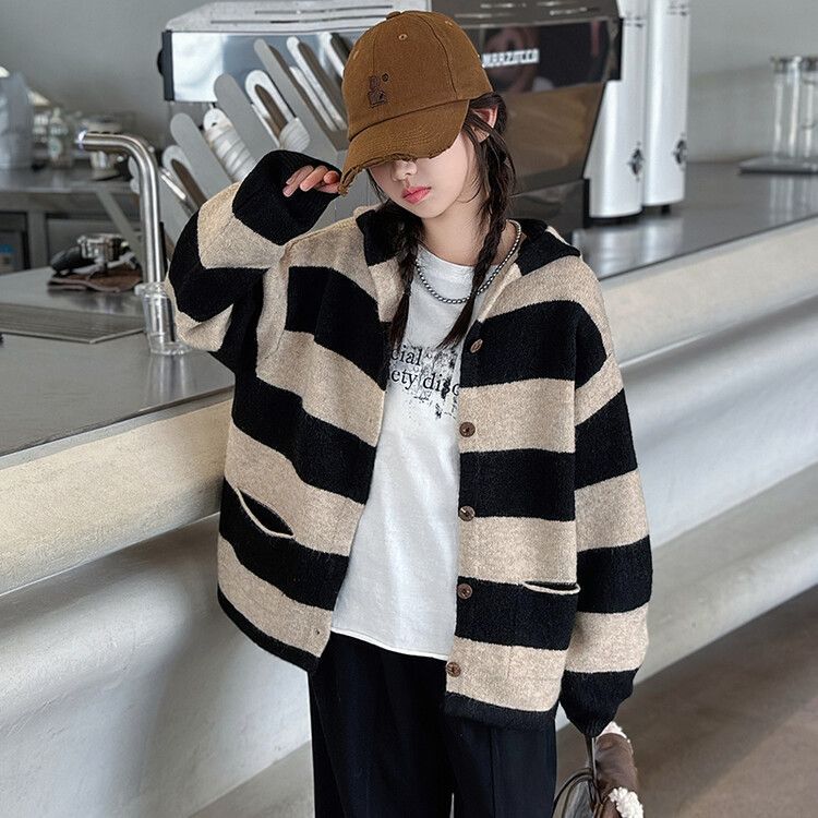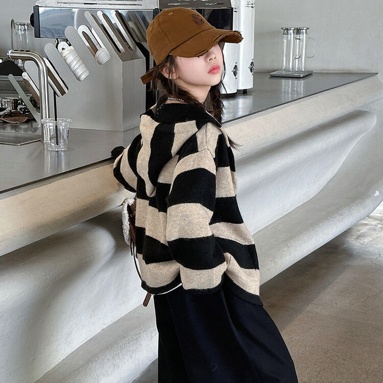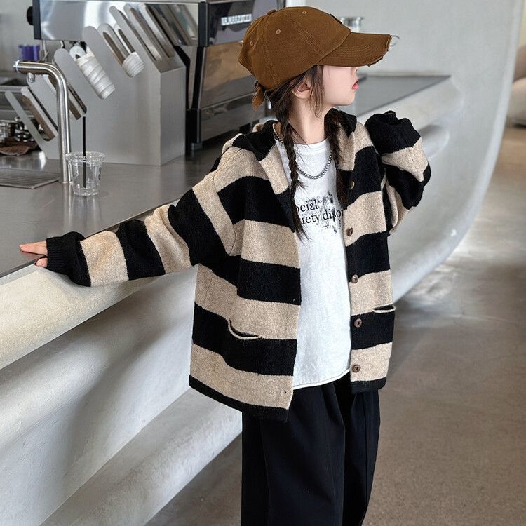 프랑스 소녀의 니트 코트 2024 새로운 도착 소녀의 큰 소년 봄과 가을 스타일 줄무늬 스웨터 카디건 탑