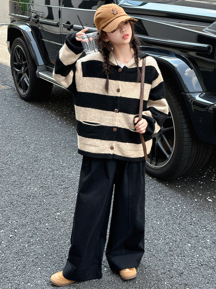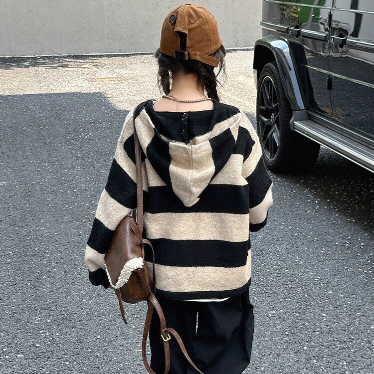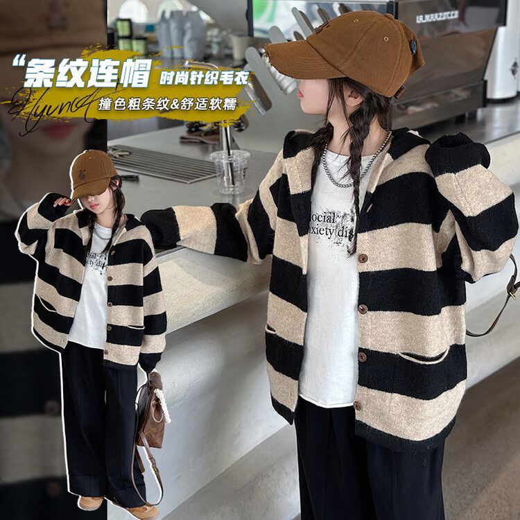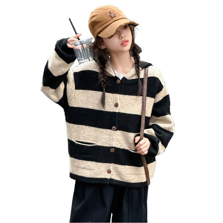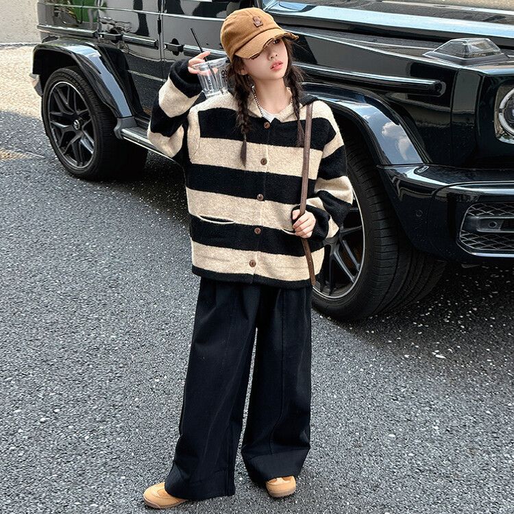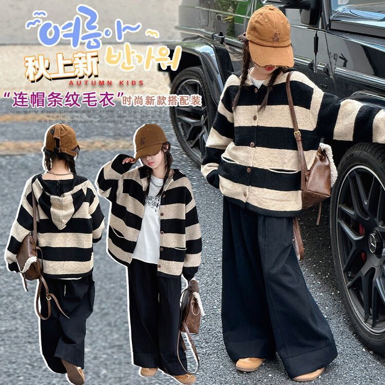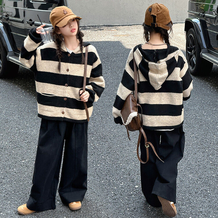 프랑스 소녀의 니트 코트 2024 새로운 도착 소녀의 큰 소년 봄과 가을 스타일 줄무늬 스웨터 카디건 탑