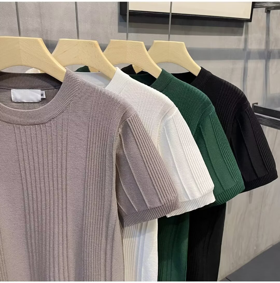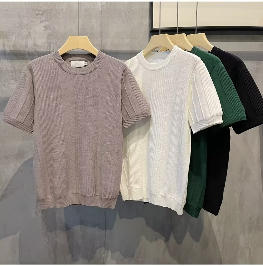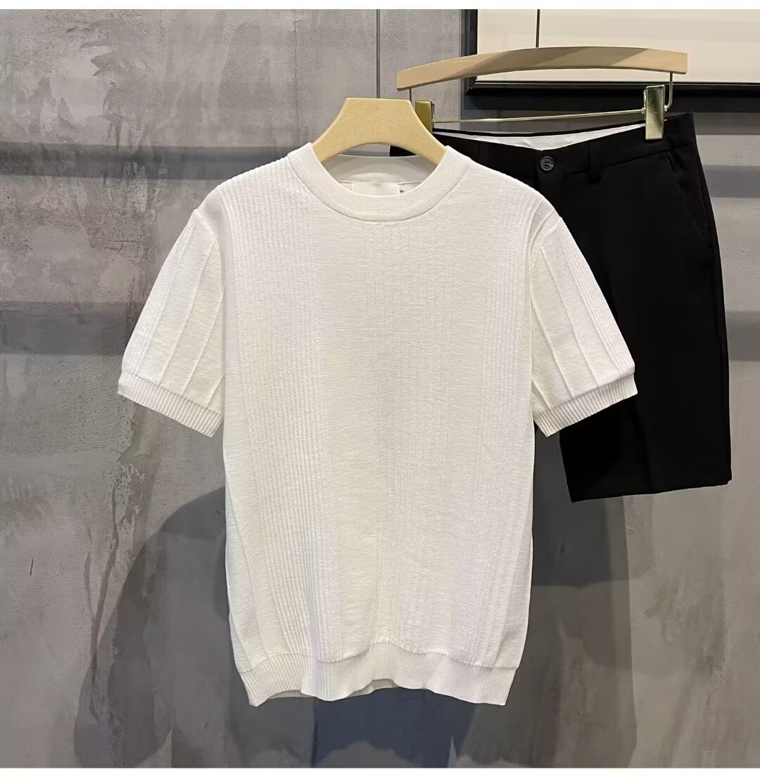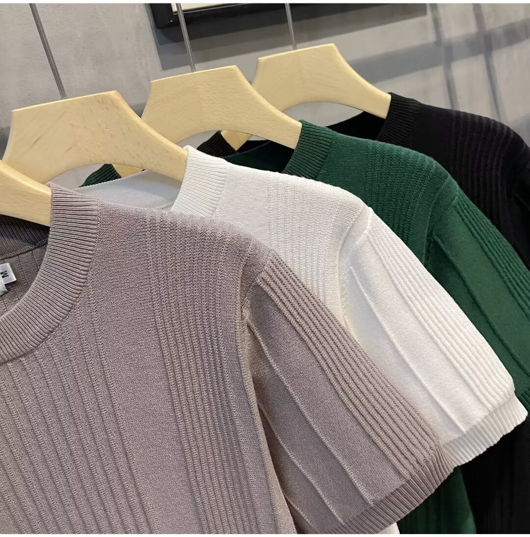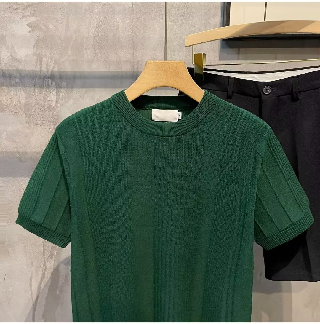 니트 반팔 티셔츠 남성용 솔리드 컬러 수직 줄무늬 여름 Ins 유행 캐주얼 반소매 탑 넥 비즈니스 베이스 셔츠스토어 가기