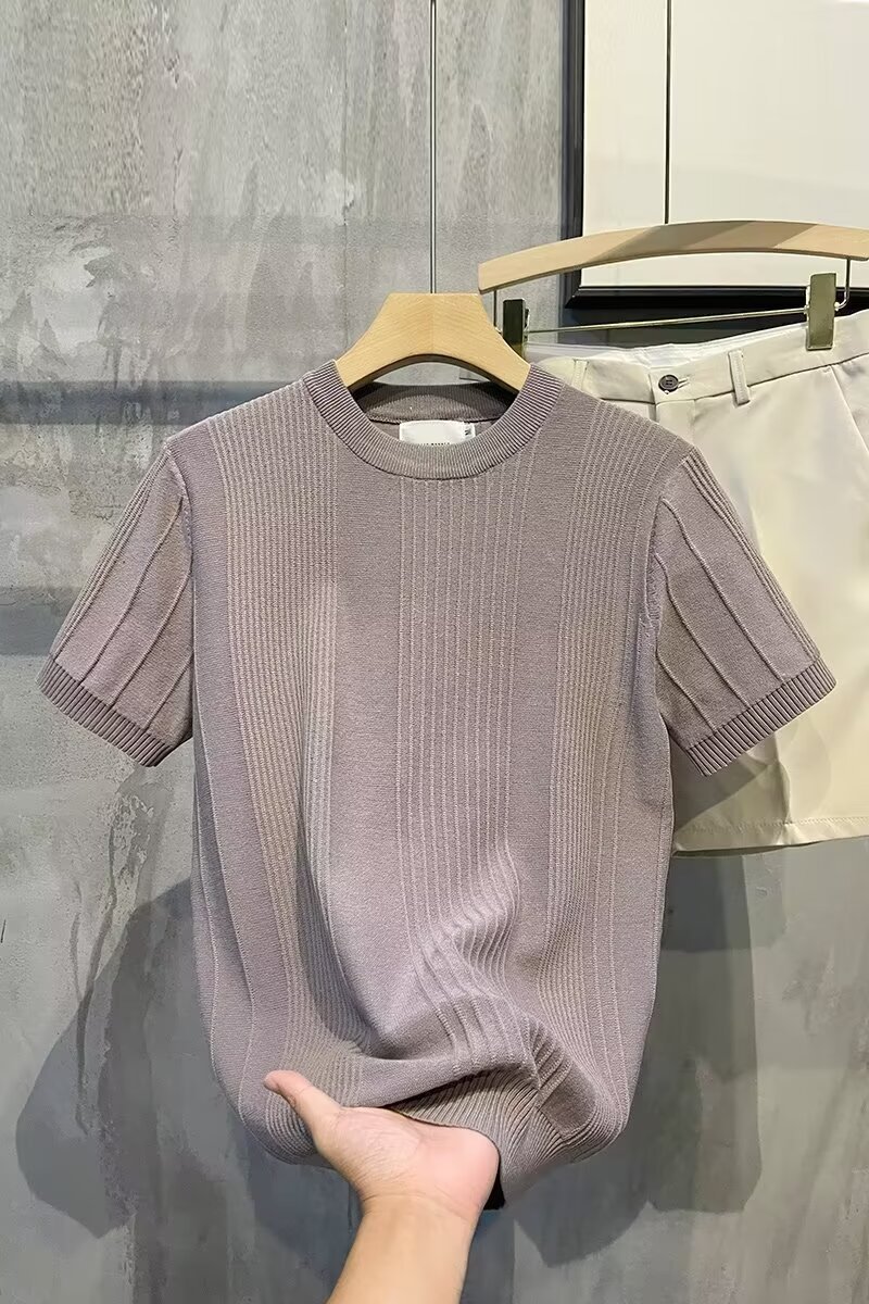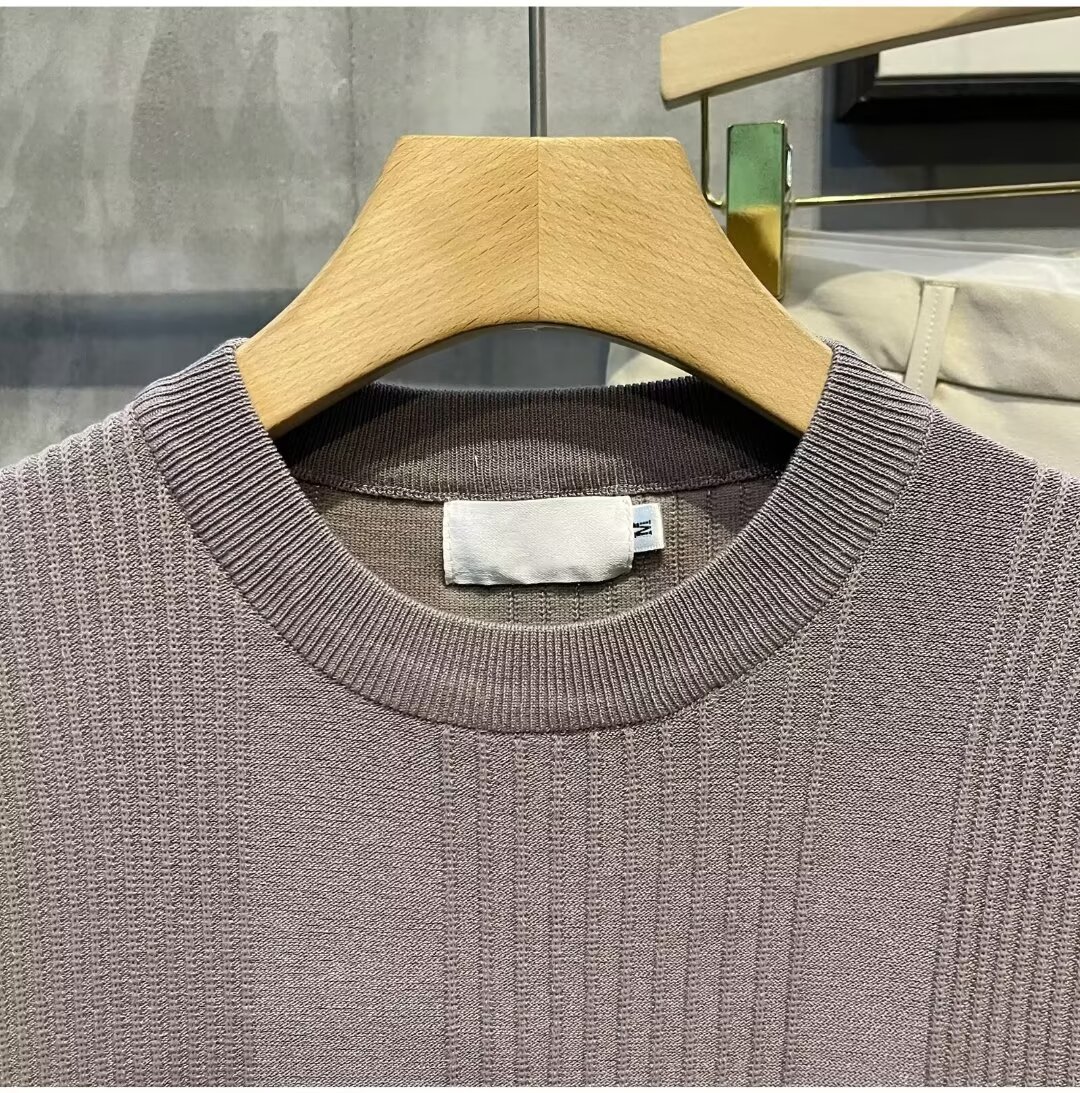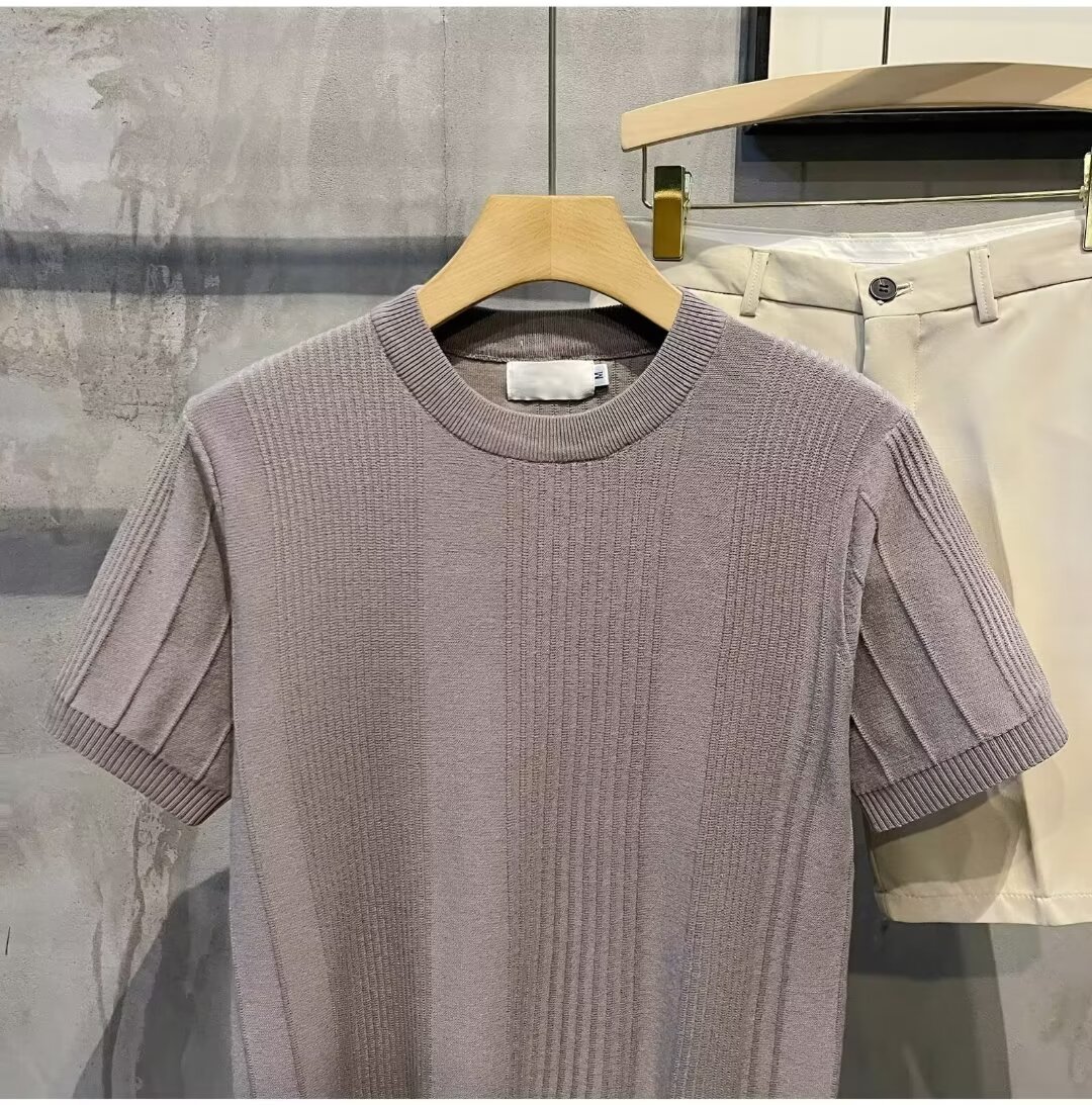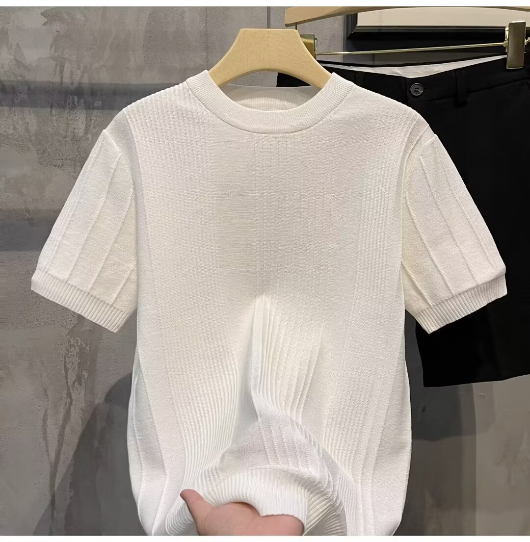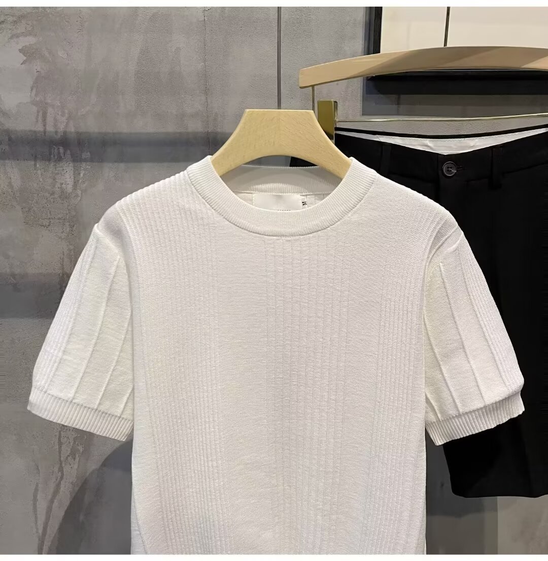 니트 반팔 티셔츠 남성용 솔리드 컬러 수직 줄무늬 여름 Ins 유행 캐주얼 반소매 탑 넥 비즈니스 베이스 셔츠스토어 가기