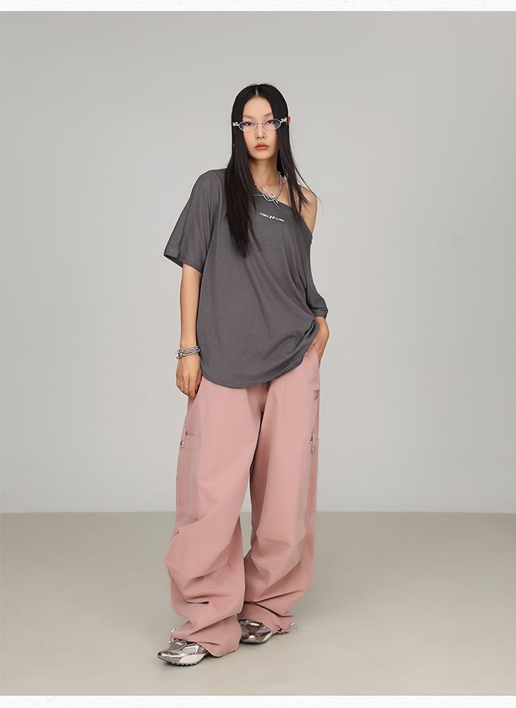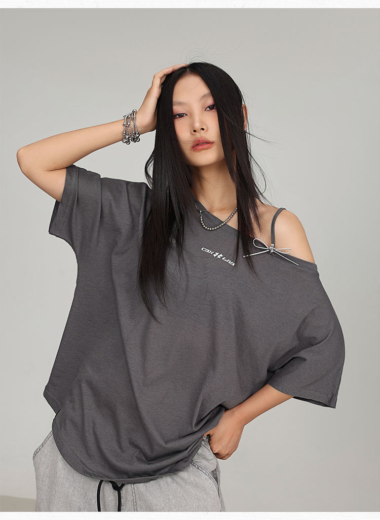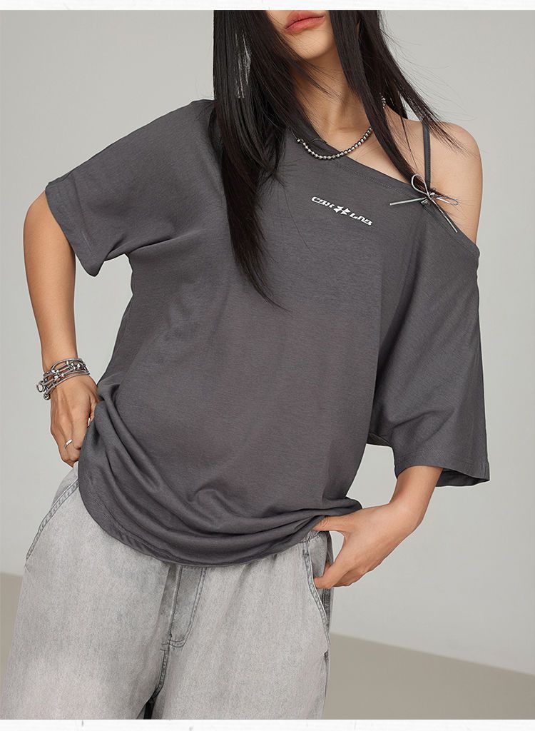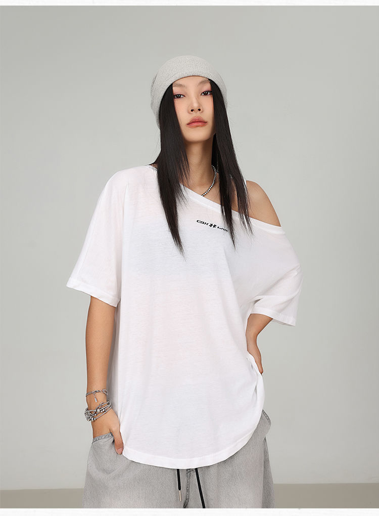 숄더 스트랩 티셔츠 여성용 kpop 댄스용 통기성 원단 루즈핏 반팔 스트리트 댄스 트렌디 브랜드 재즈 힙합 탑 오프숄더
