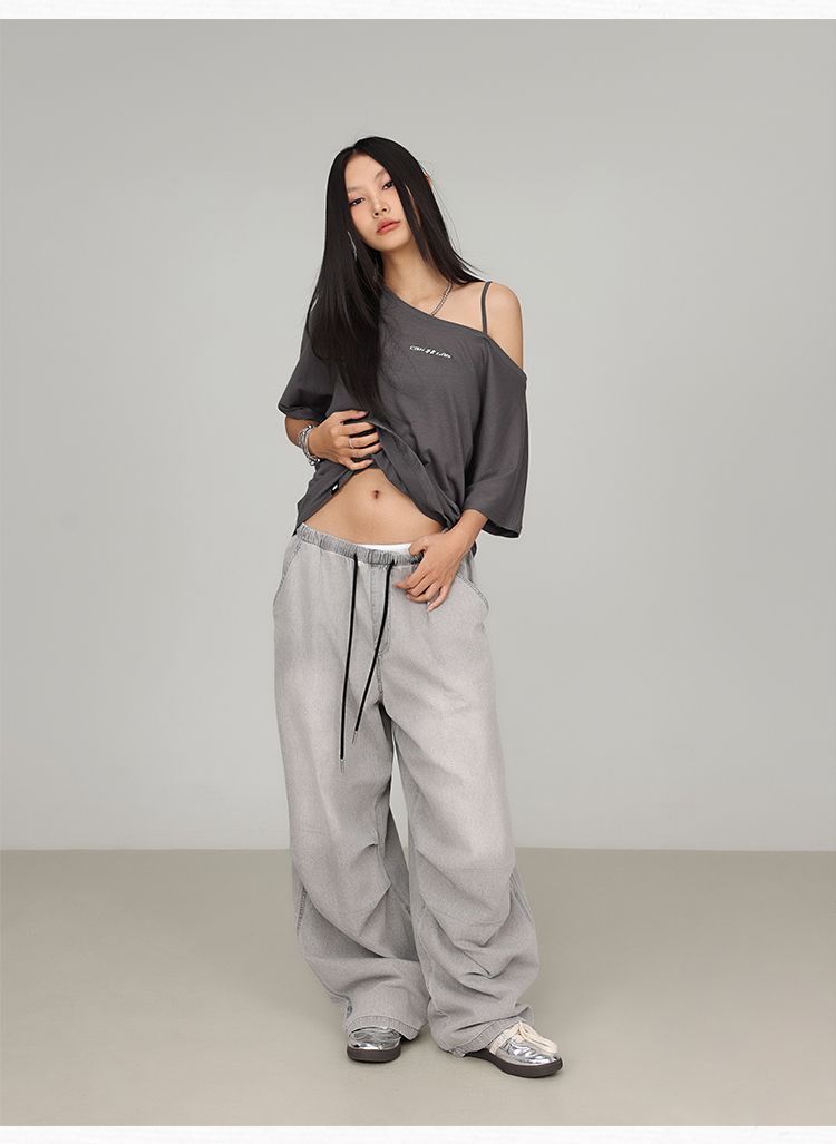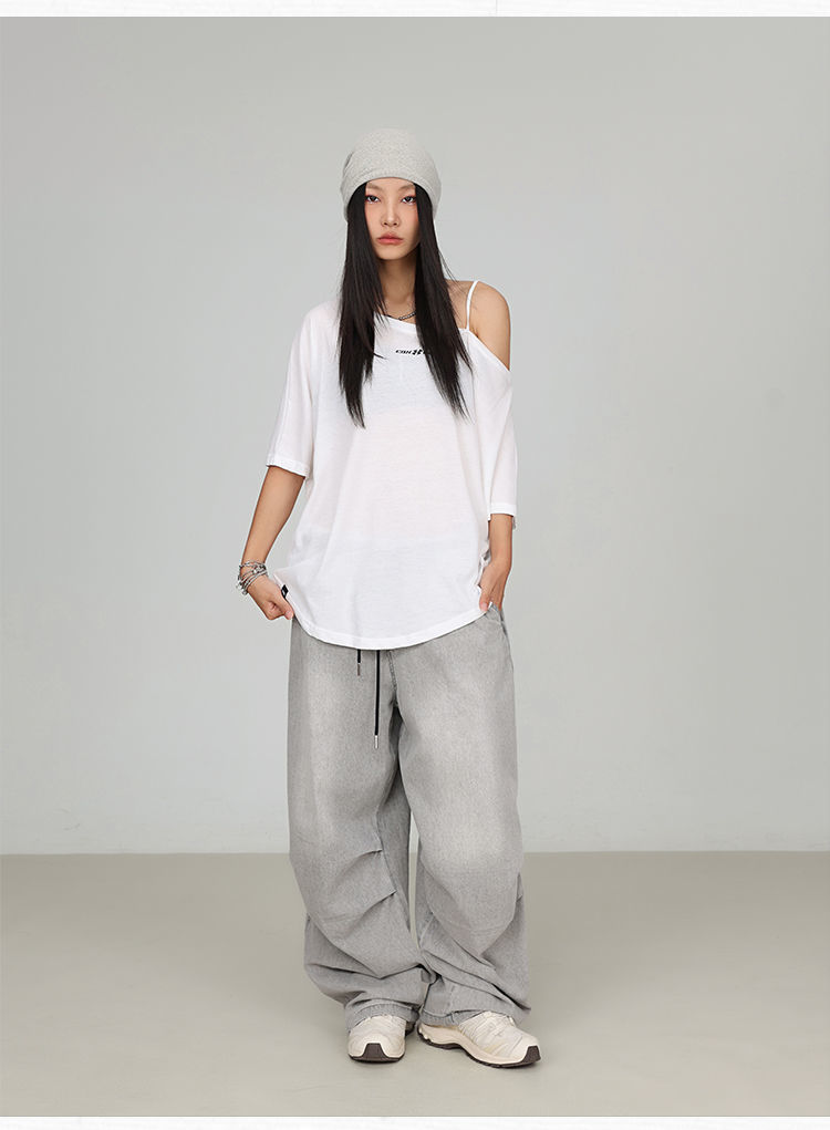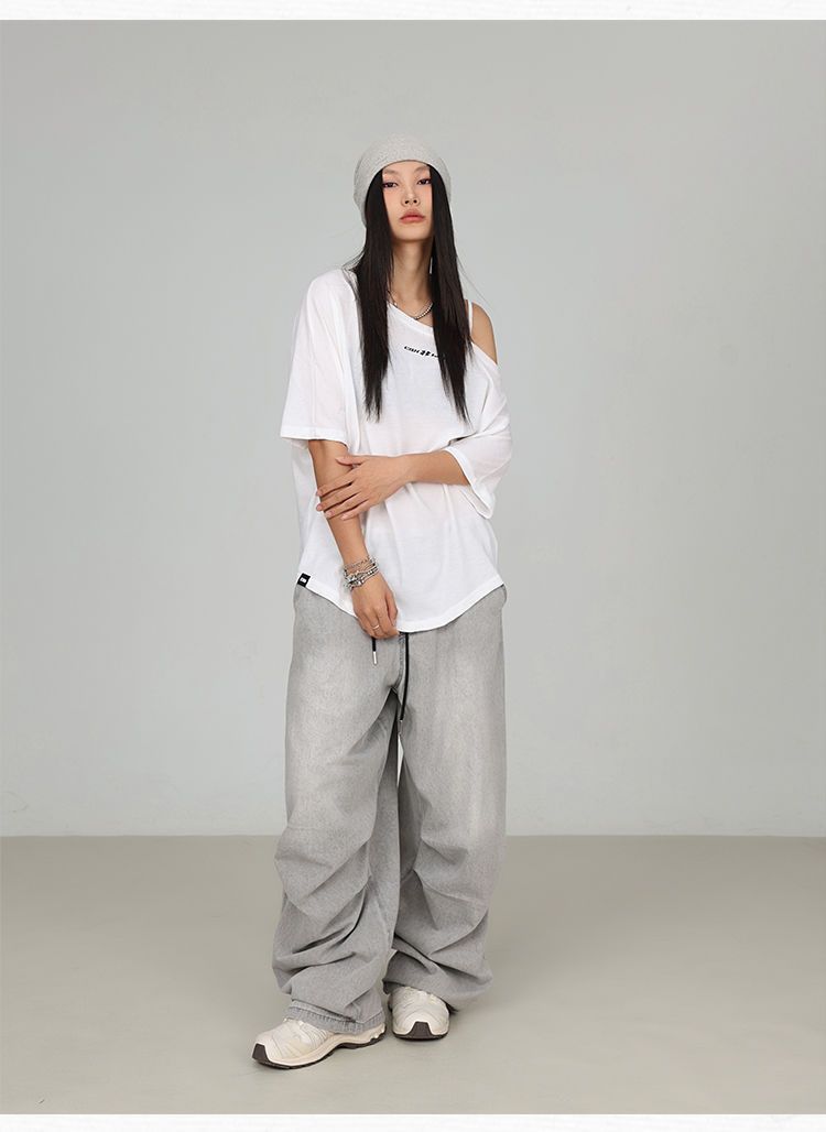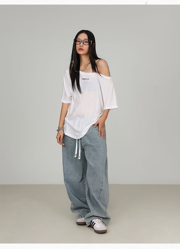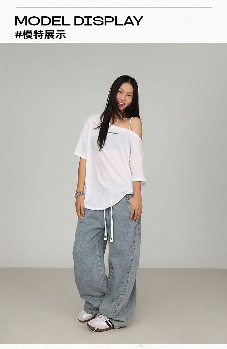 숄더 스트랩 티셔츠 여성용 kpop 댄스용 통기성 원단 루즈핏 반팔 스트리트 댄스 트렌디 브랜드 재즈 힙합 탑 오프숄더스토어 가기
