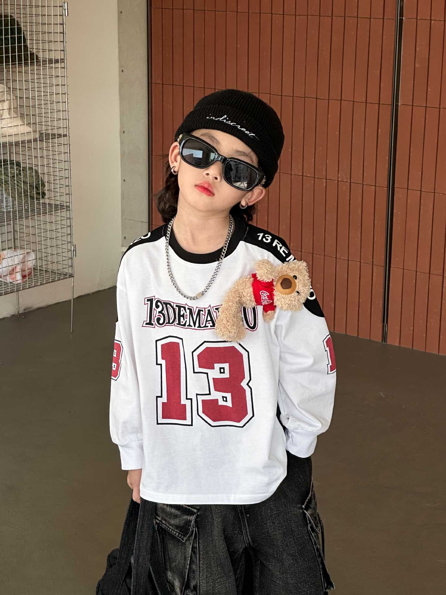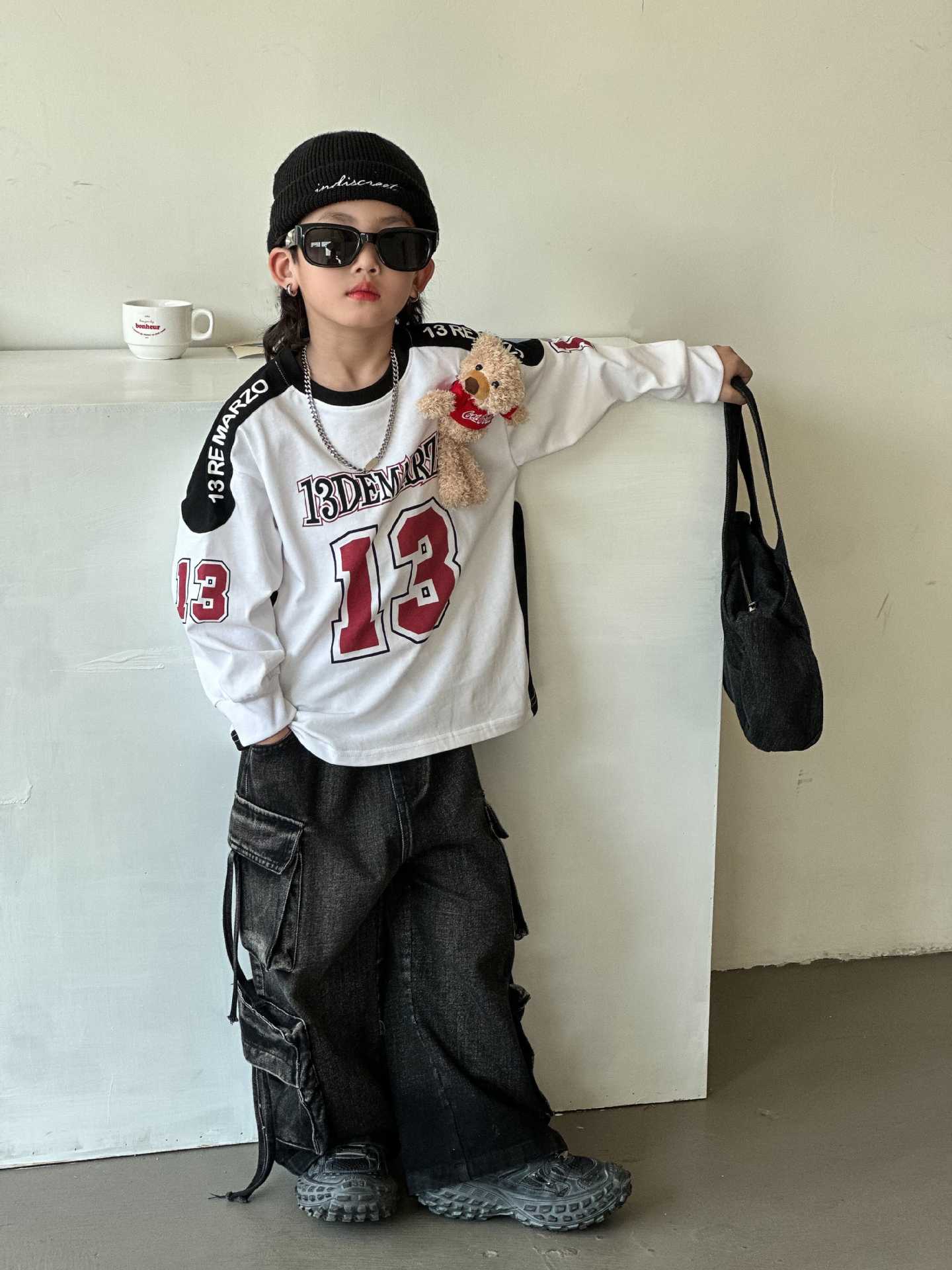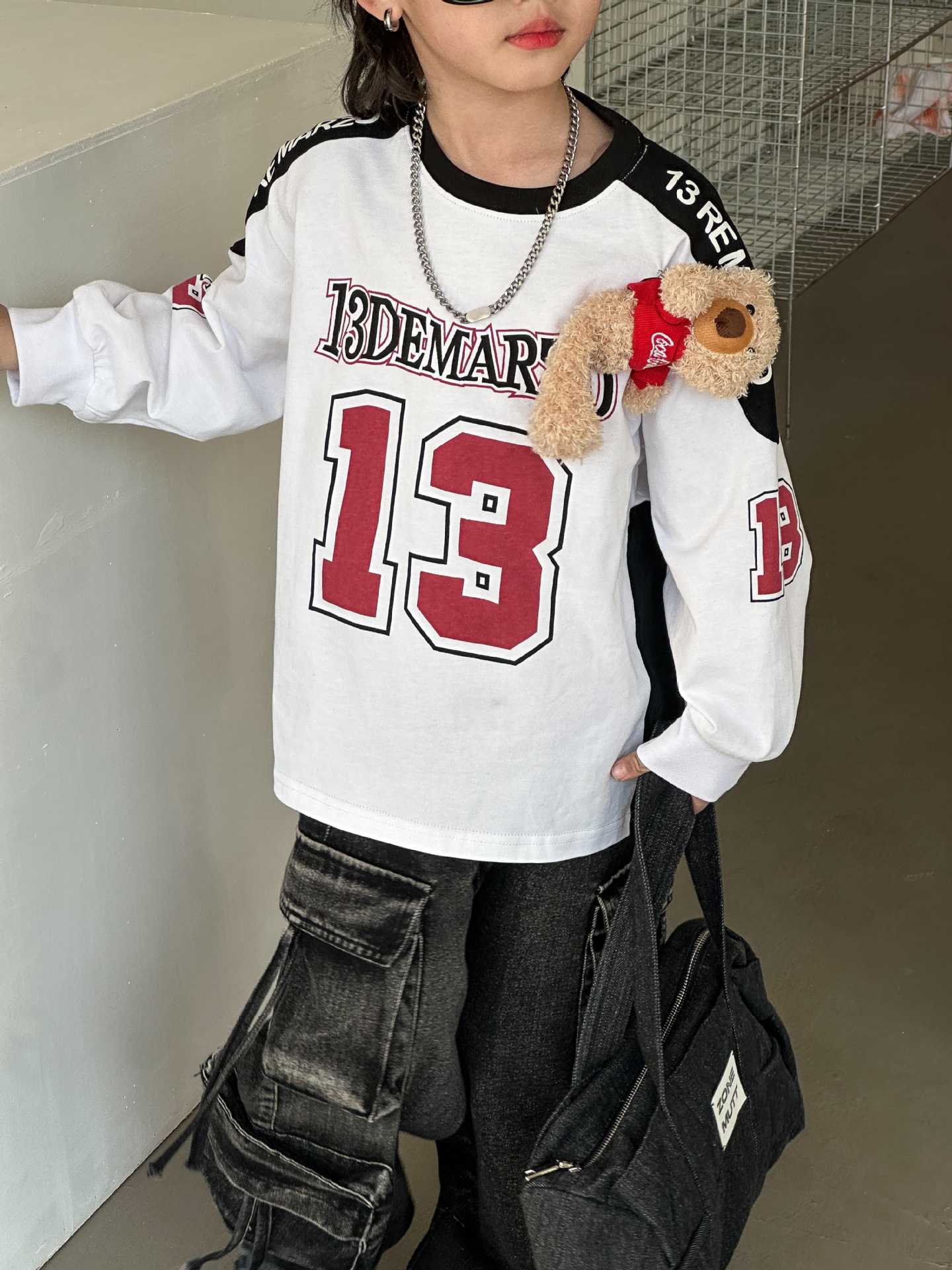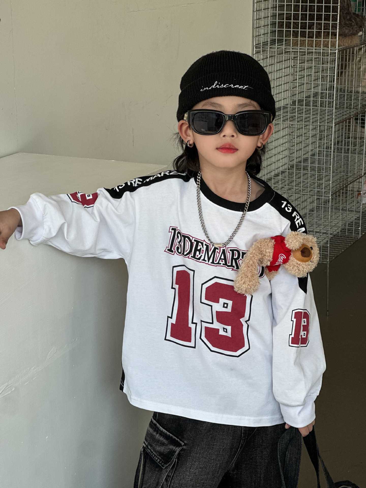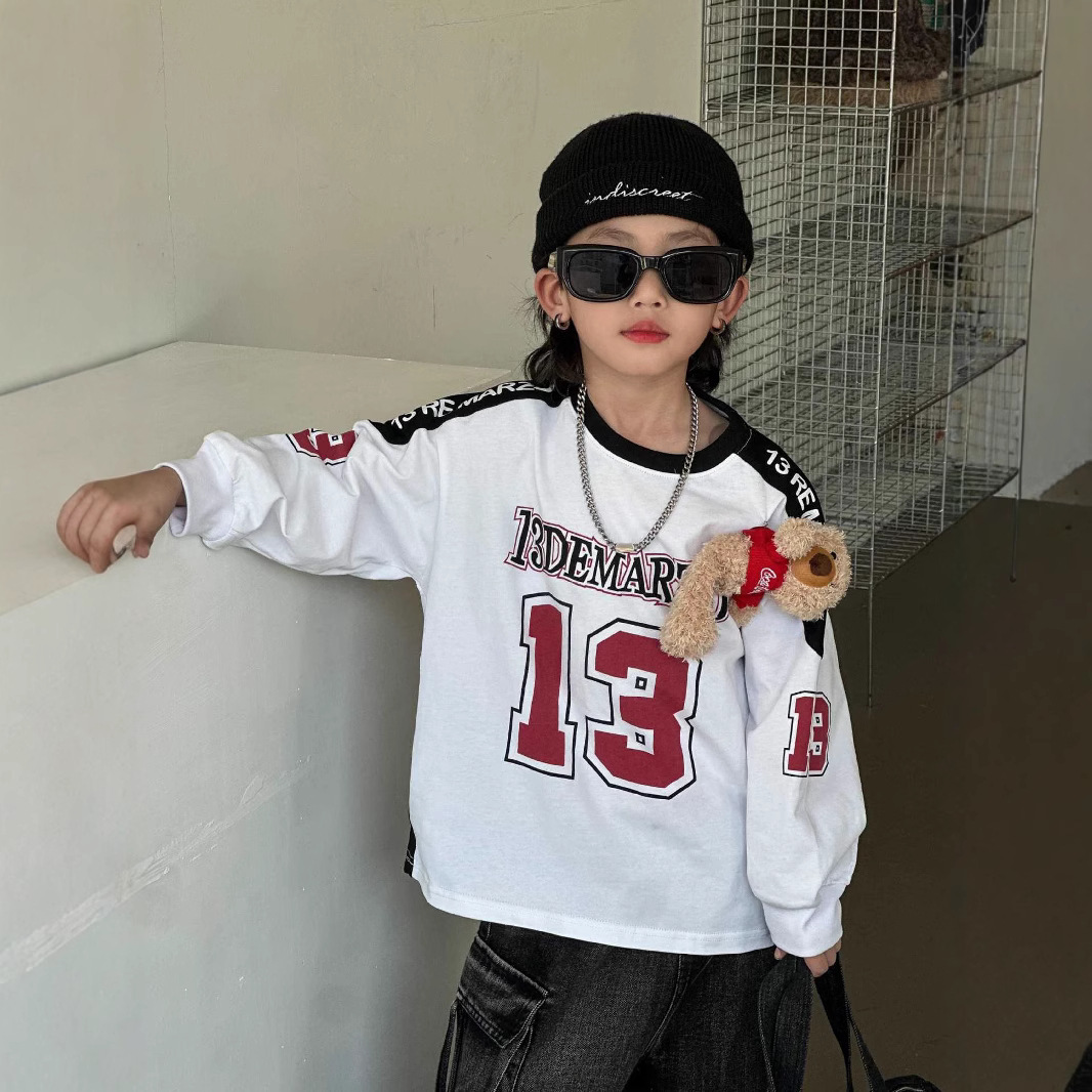 2025 년 봄 새로운 어린이 티셔츠 소년 곰 긴 소매 최고 패션 다목적 한국 버전의 근원으로 돌아 가기
