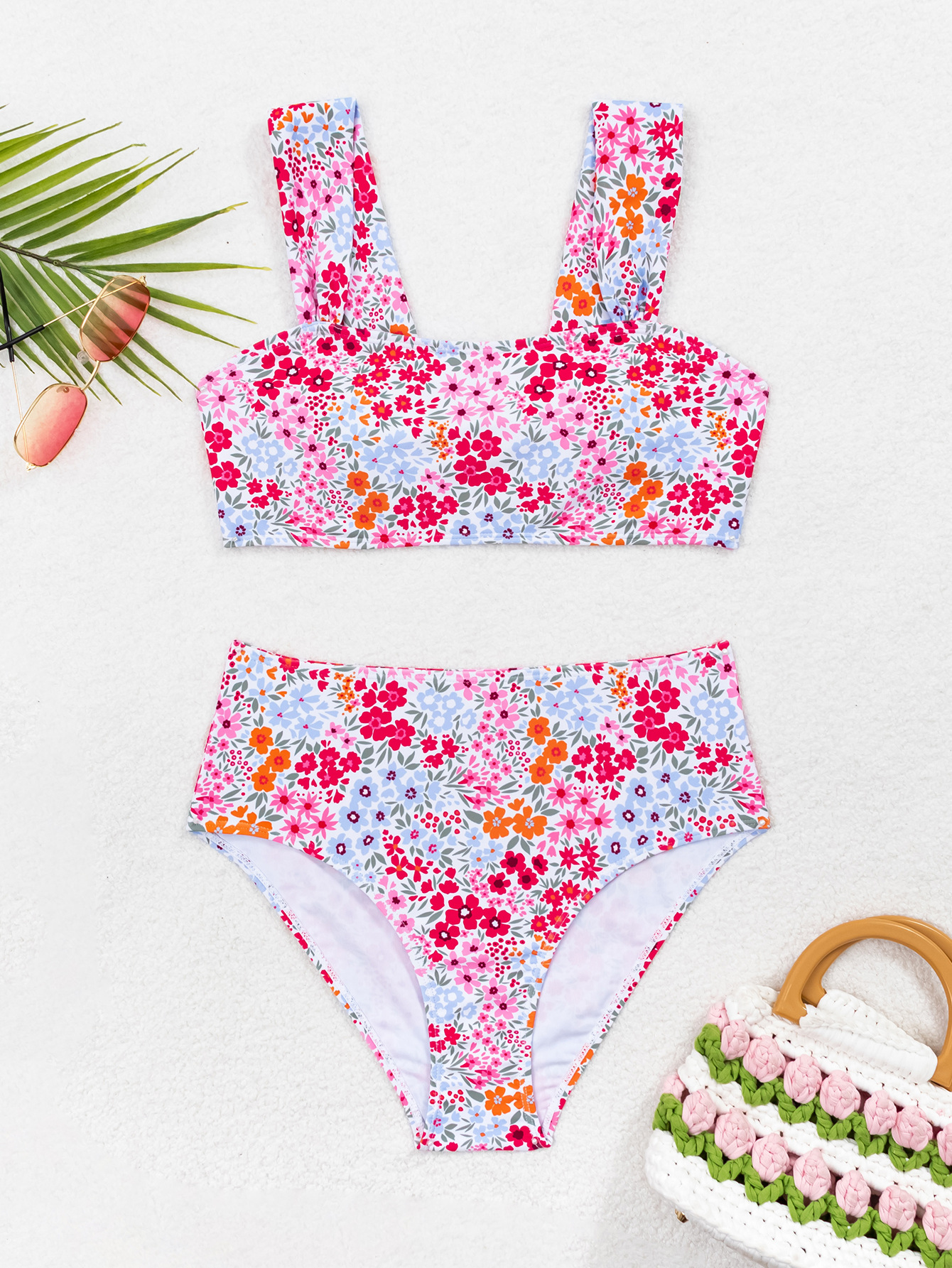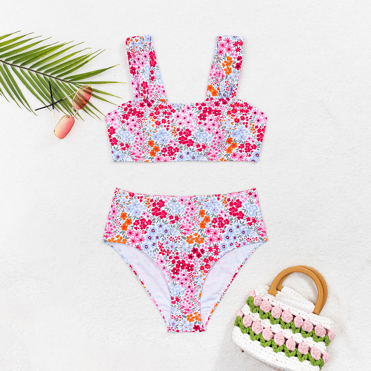 유럽과 미국의 국경 간 여성 패션 작은 꽃 전신 프린트 확장 어깨 끈 팬티 스플릿 비키니 수영복