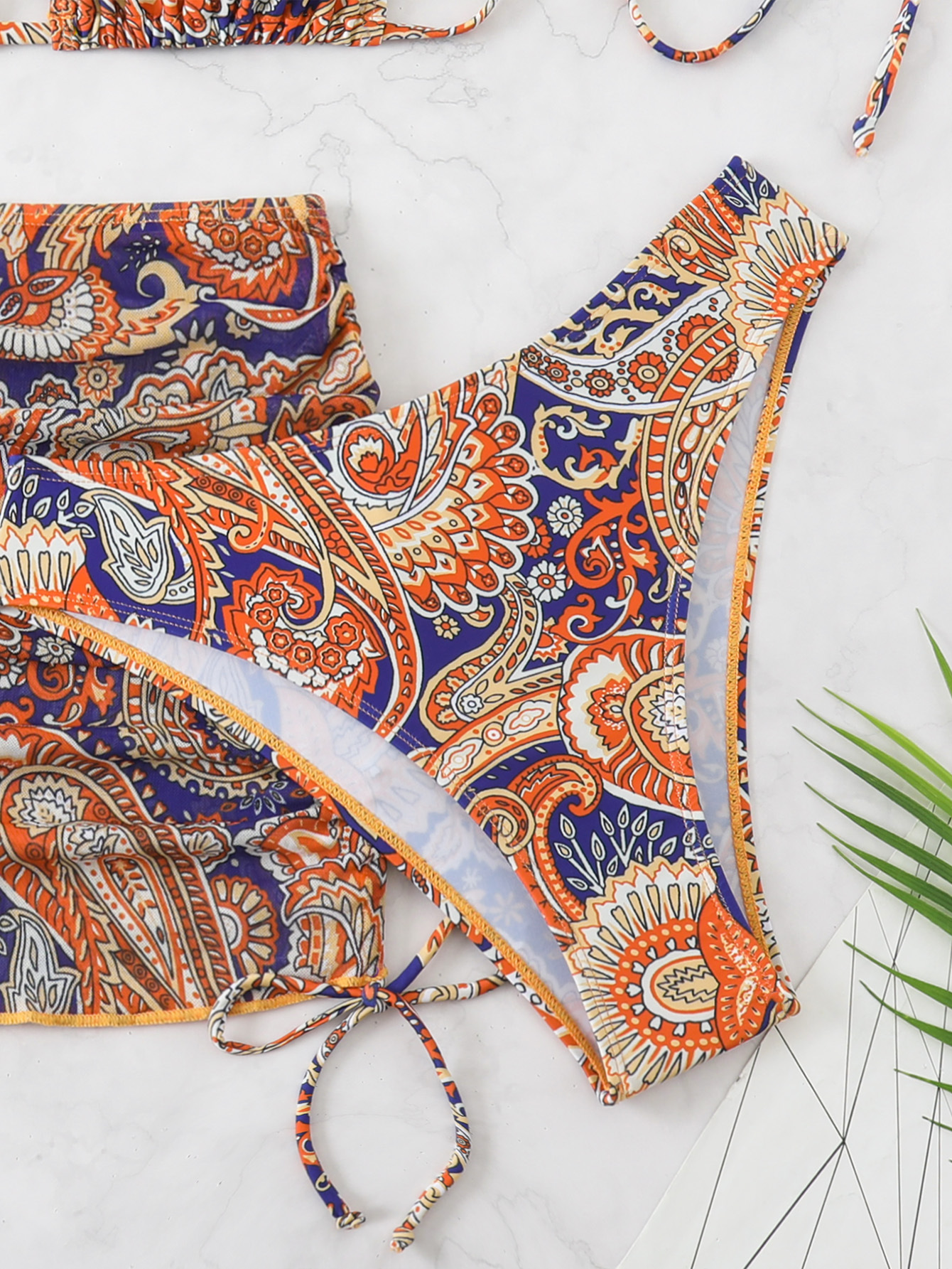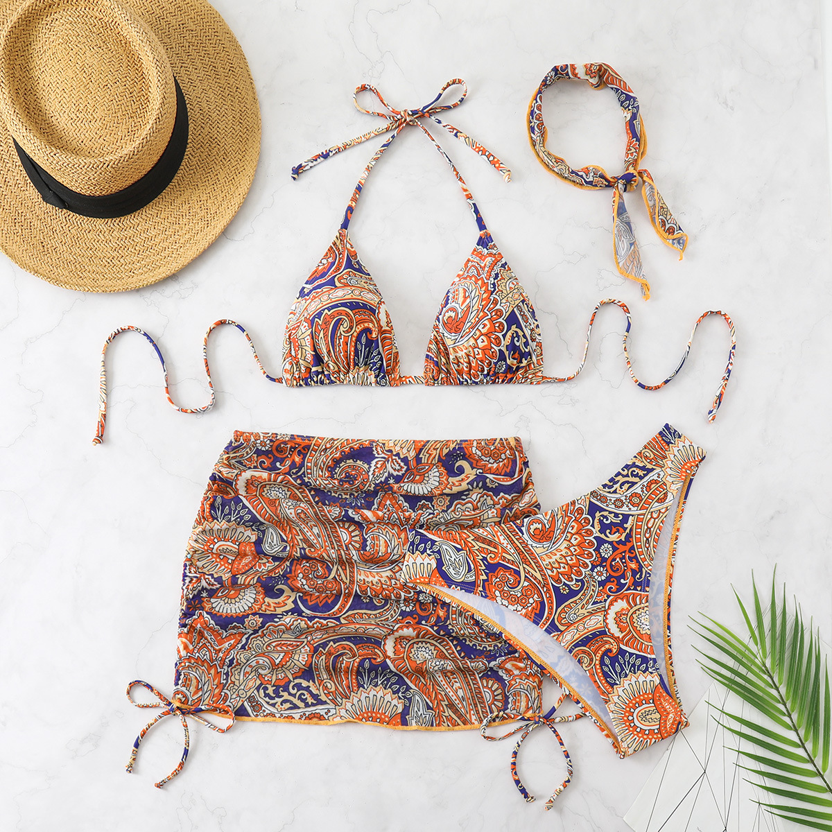 유럽과 미국의 국경 간 인기 여성 민족 스타일 프린트 섹시한 비키니 메쉬 스커트 하프 스커트 터번 4피스 세트스토어 가기
