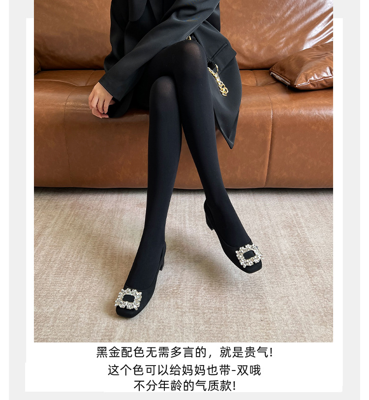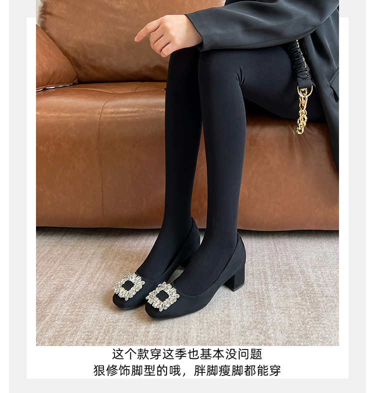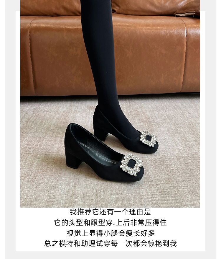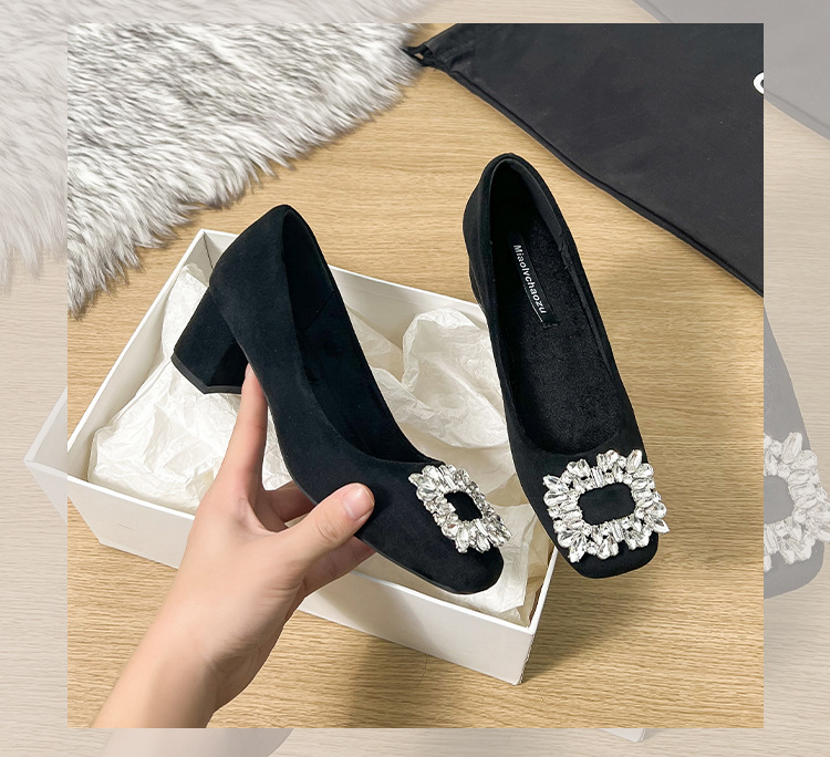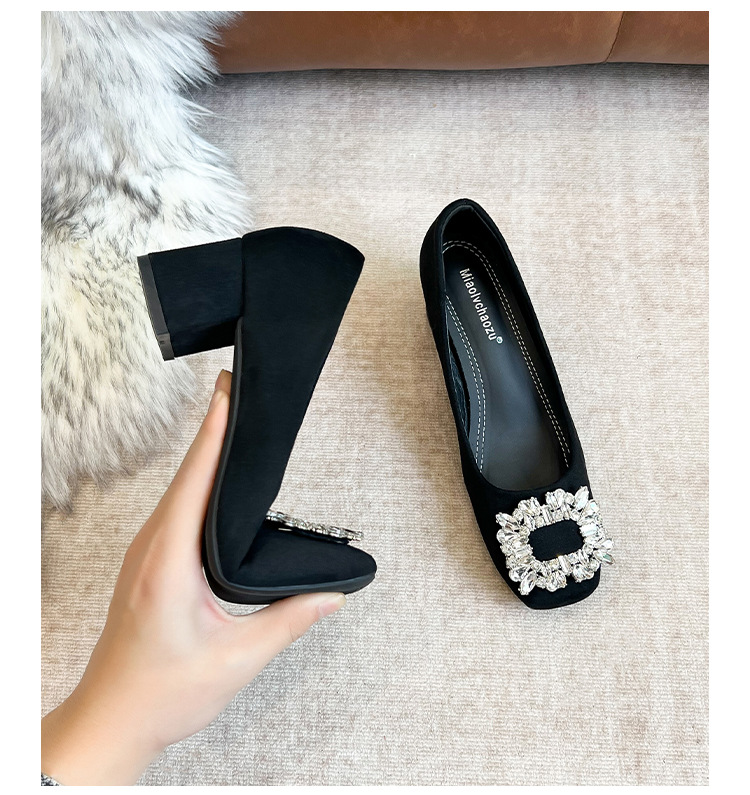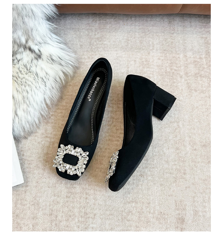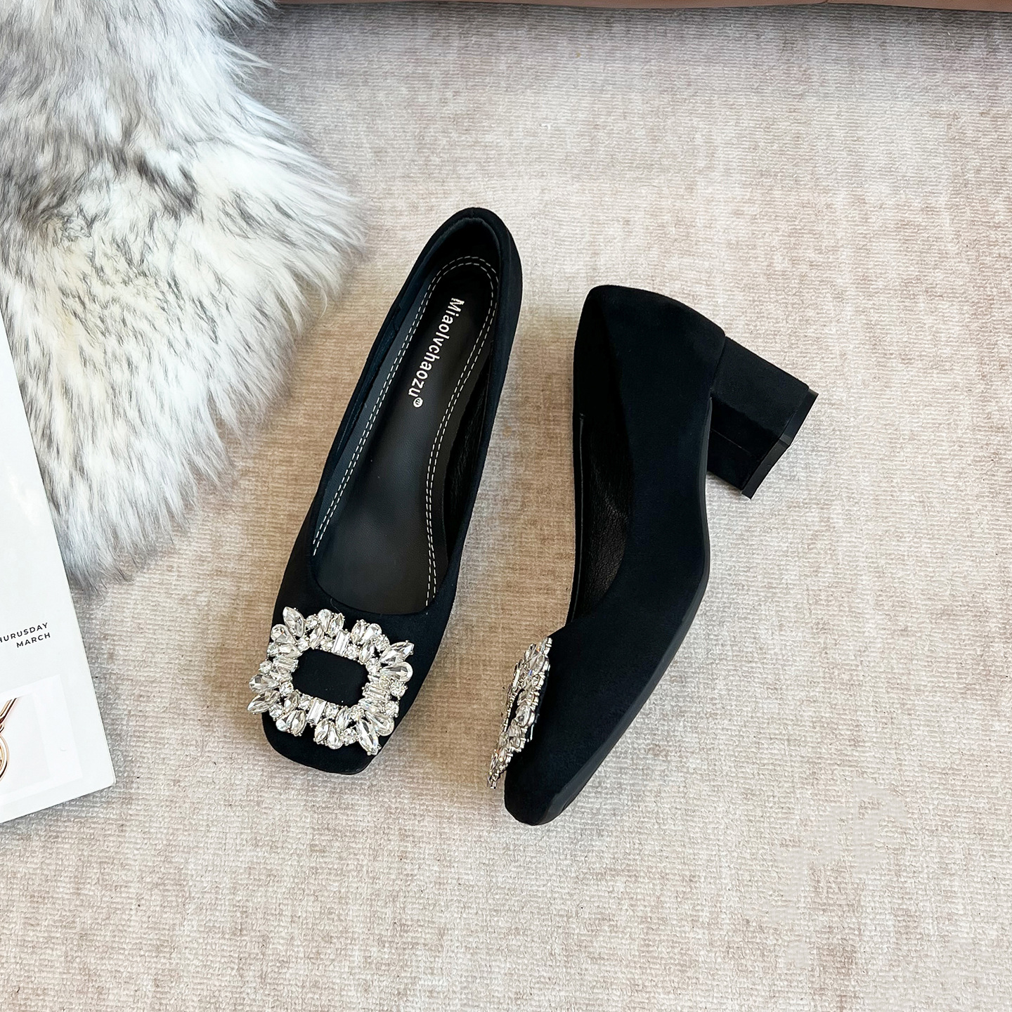 여성용 블랙 하이힐 2026년 봄/가을 신상 두꺼운 굽 블랙 미학 스타일 사각코 워터다이아몬드 여성화 얕은 입구의 전문직용 굵은 굽 싱글 슈즈스토어 가기