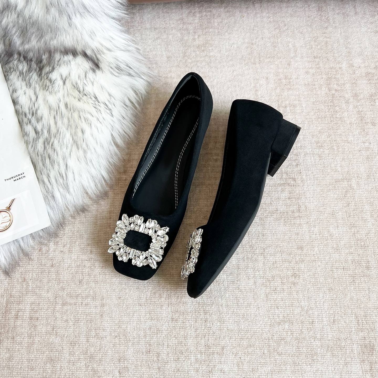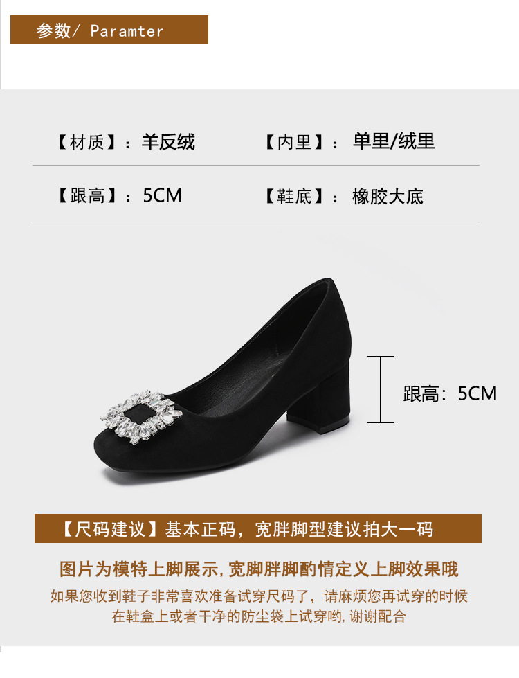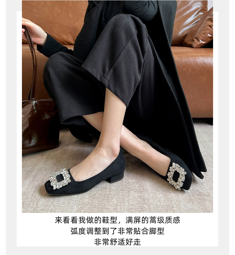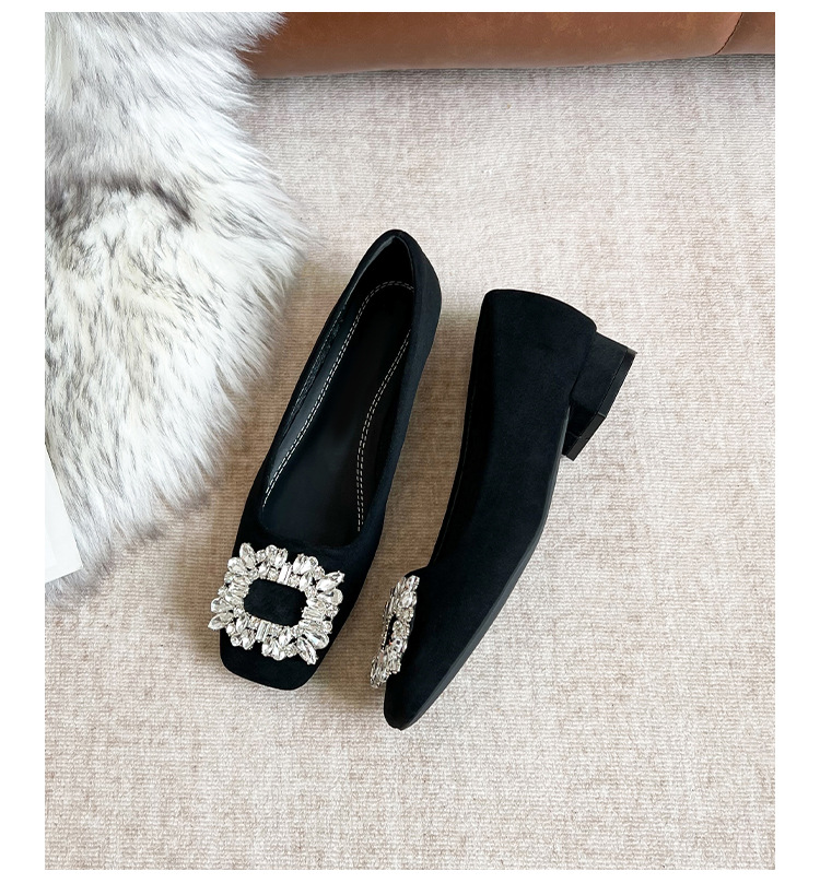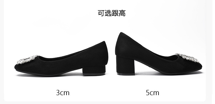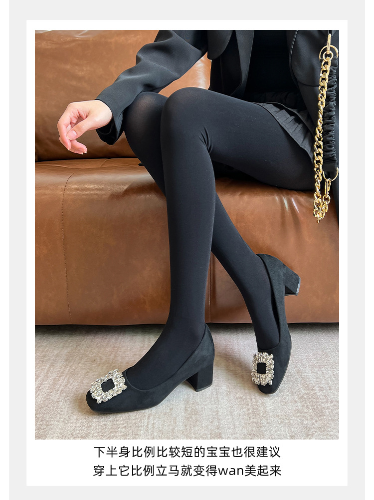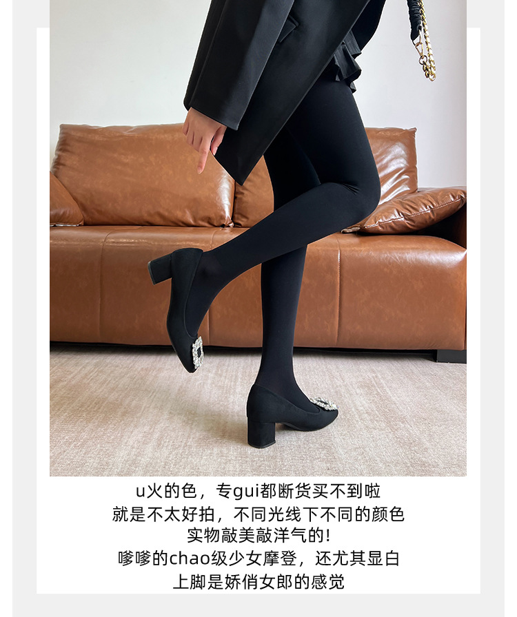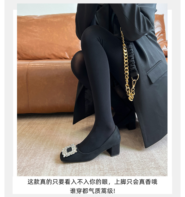 여성용 블랙 하이힐 2026년 봄/가을 신상 두꺼운 굽 블랙 미학 스타일 사각코 워터다이아몬드 여성화 얕은 입구의 전문직용 굵은 굽 싱글 슈즈스토어 가기
