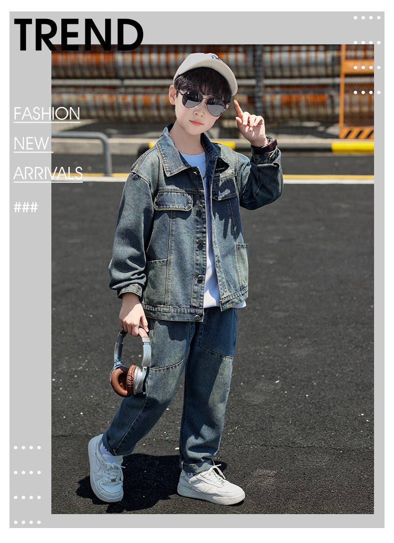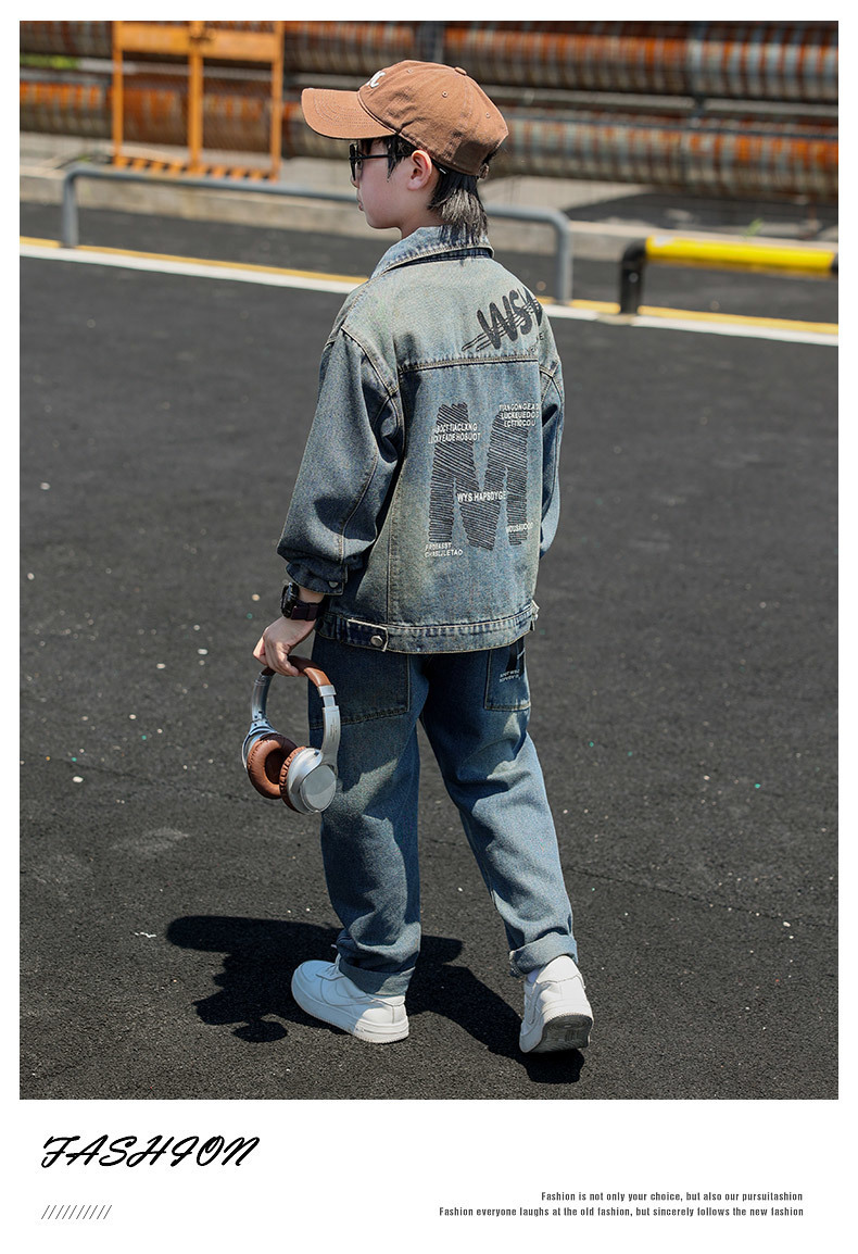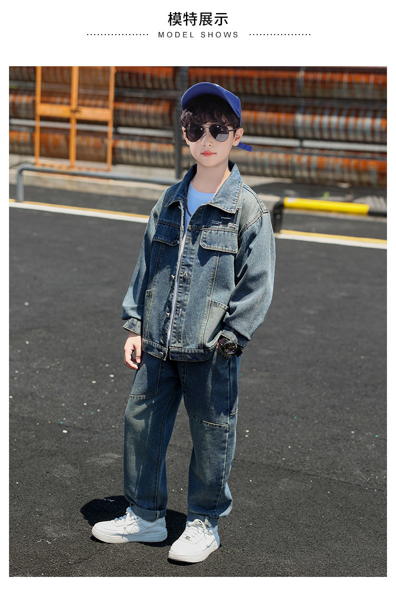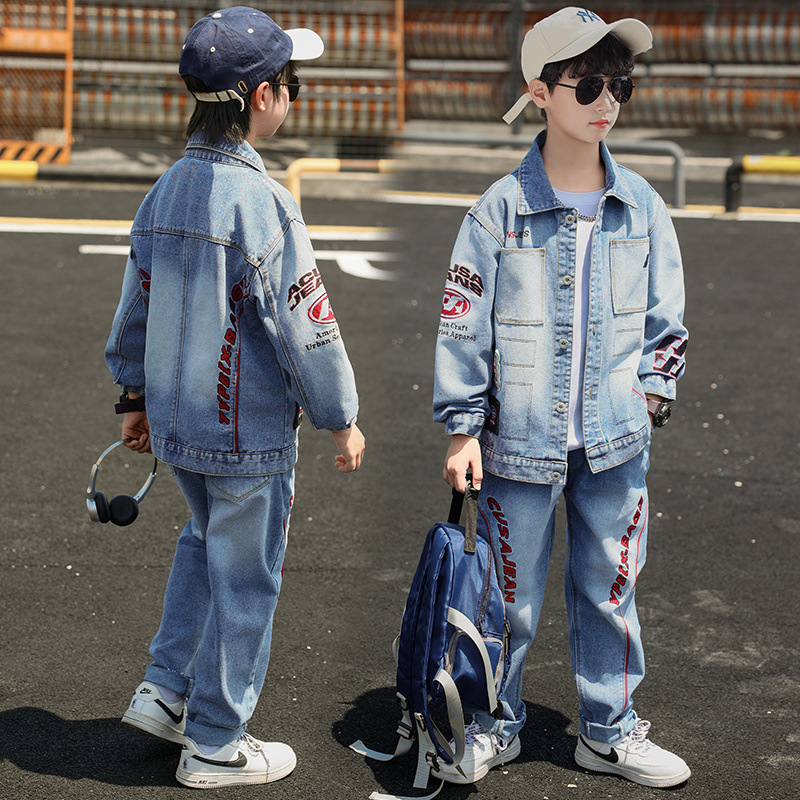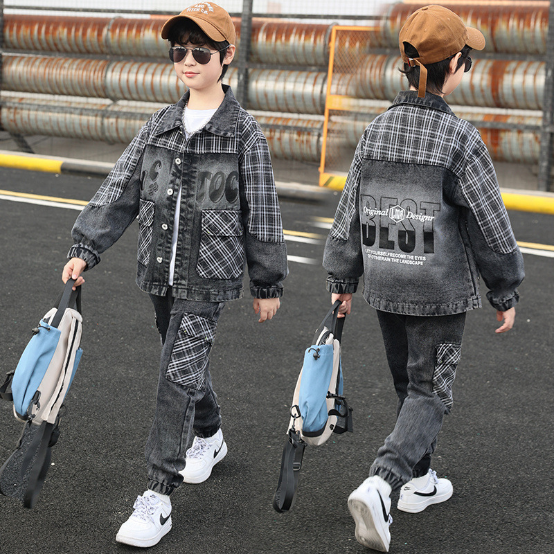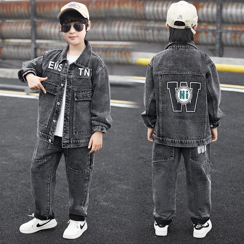어린이와 소년의 가을 원피스 세트 2024 새로운 스타일 대형 어린이 서양식 10 소년 2 피스 세트 봄과 가을 데님 소년 패션스토어 가기