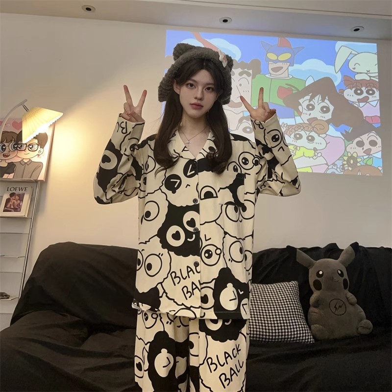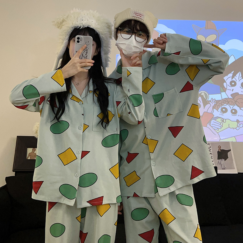 커플 잠옷 남자와 여자의 봄과 가을 긴 소매 기하학적 일본 스타일 샤오신 같은 스타일 홈 의류 투피스 세트스토어 가기