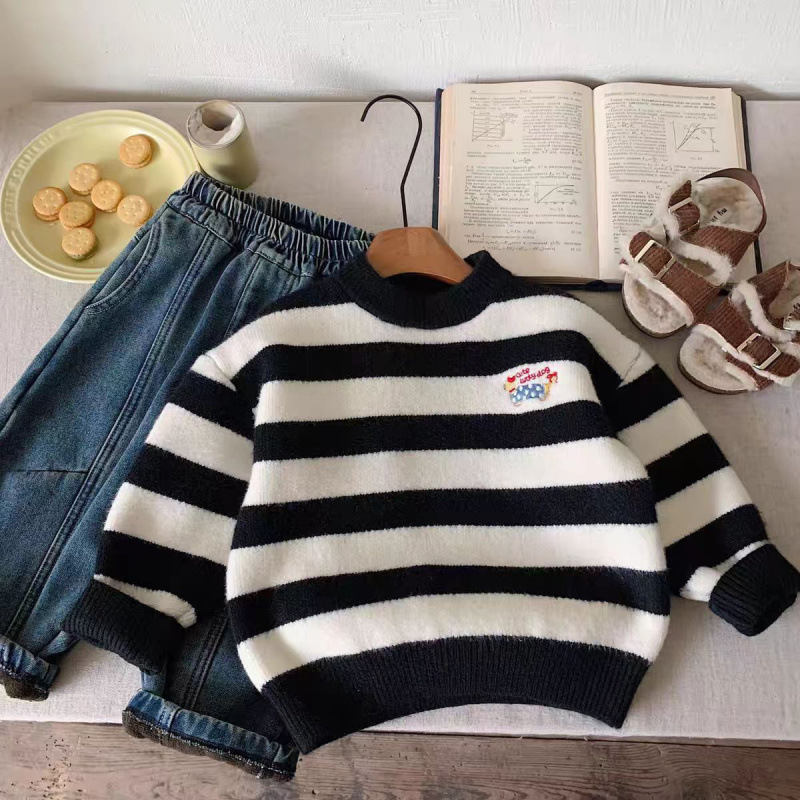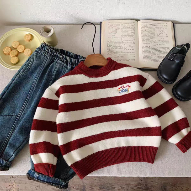 어린이 스웨터 레드 기모 두꺼운 소녀 새로운 서양식 니트 스웨터 아기 어린이 줄무늬 풀오버 베이스스토어 가기