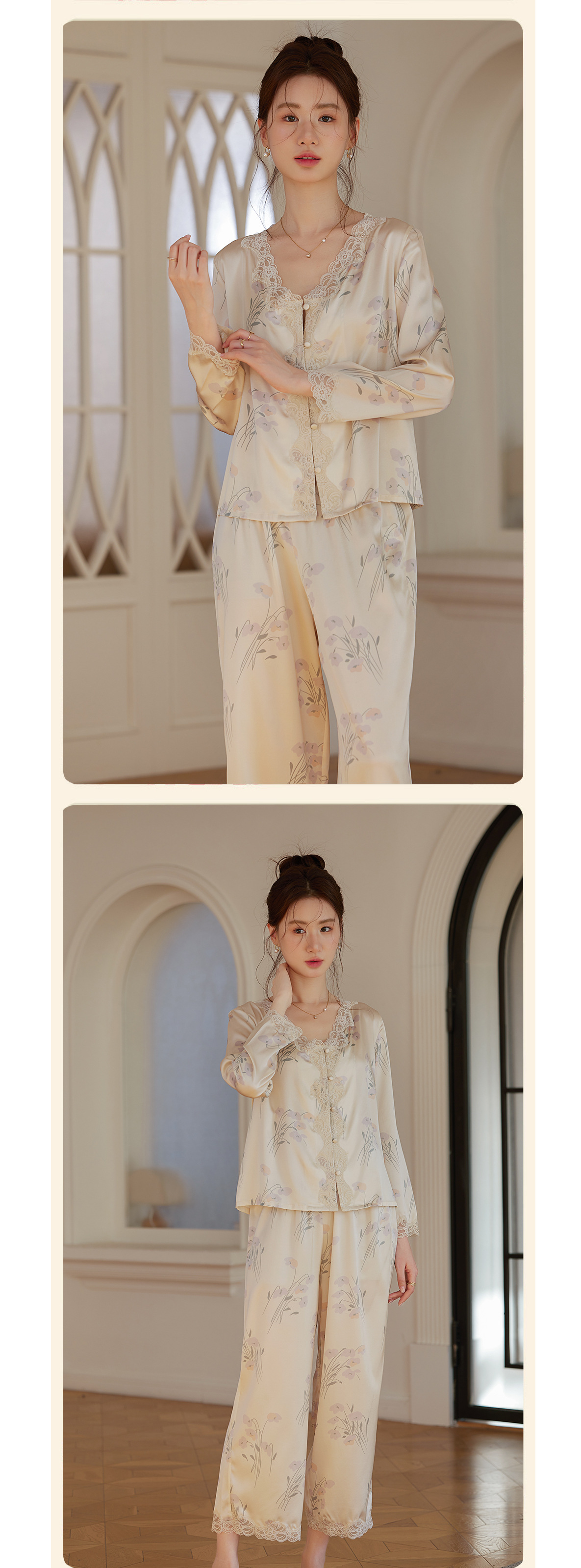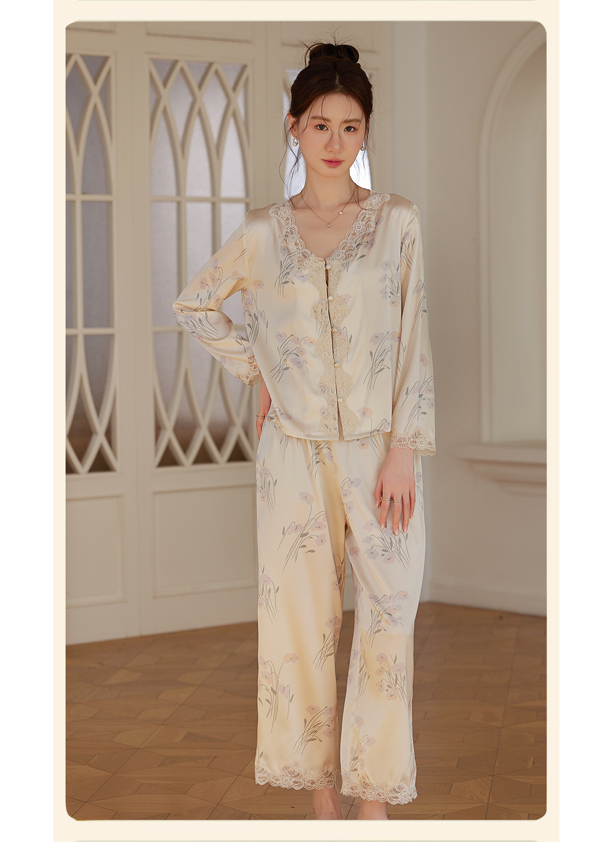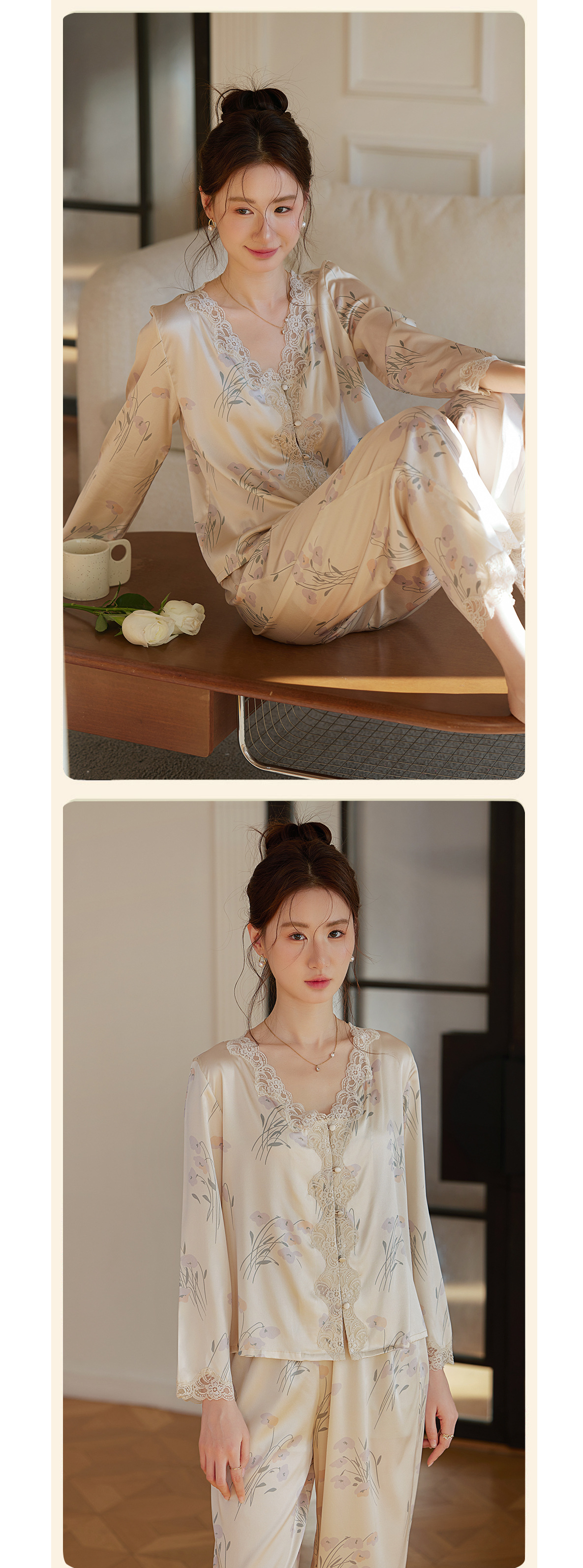 2025 이른 봄 새로운 중국 스타일 가벼운 럭셔리 파자마 여성 봄 국가 스타일 레이스 V-넥 긴 소매 바지
