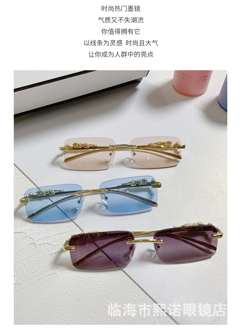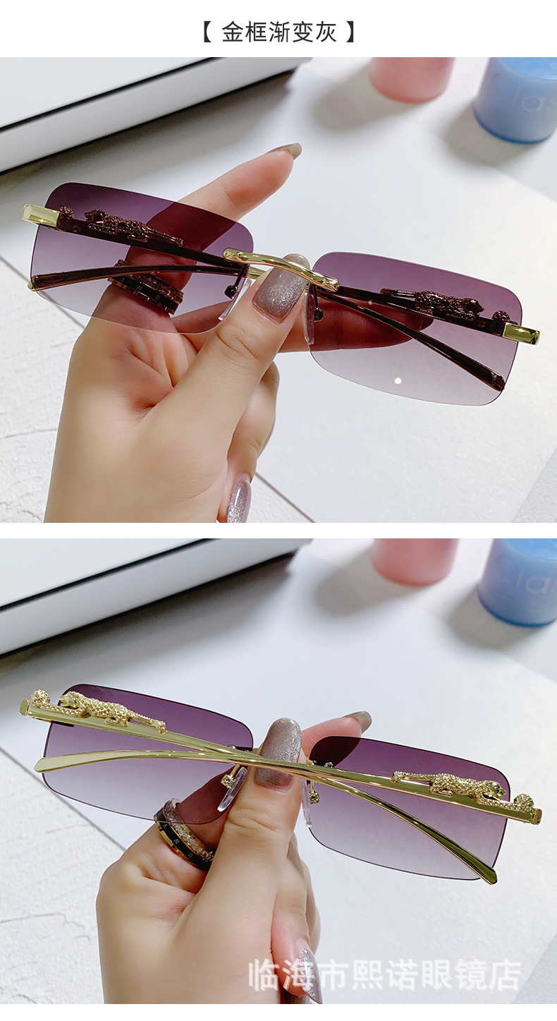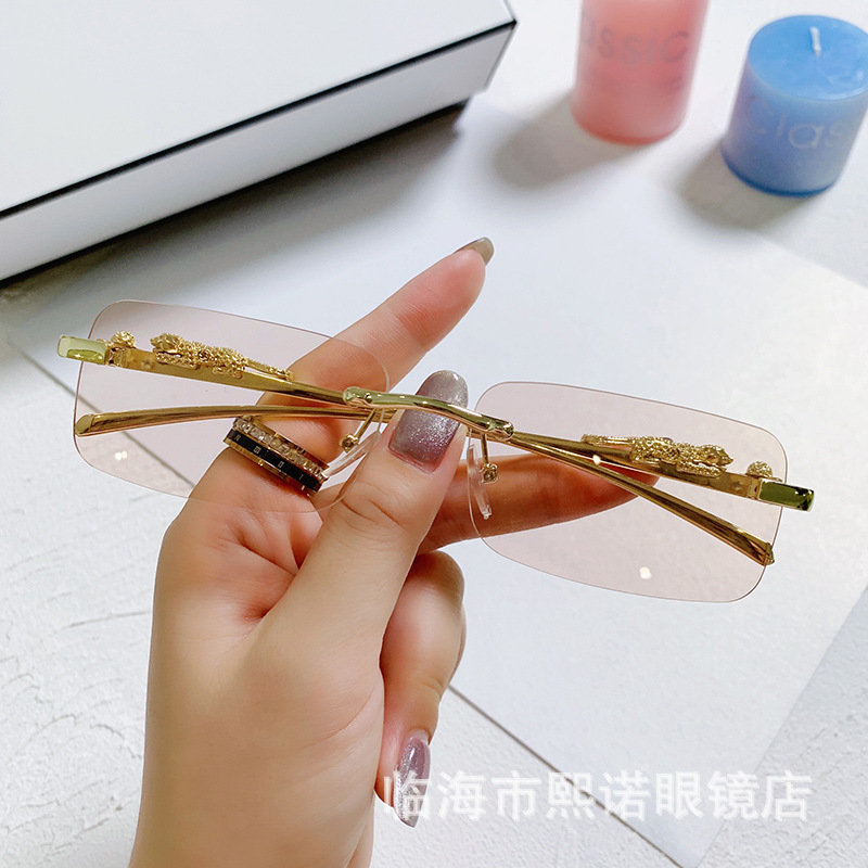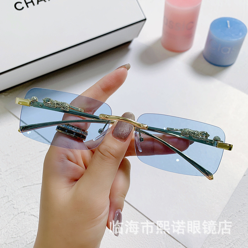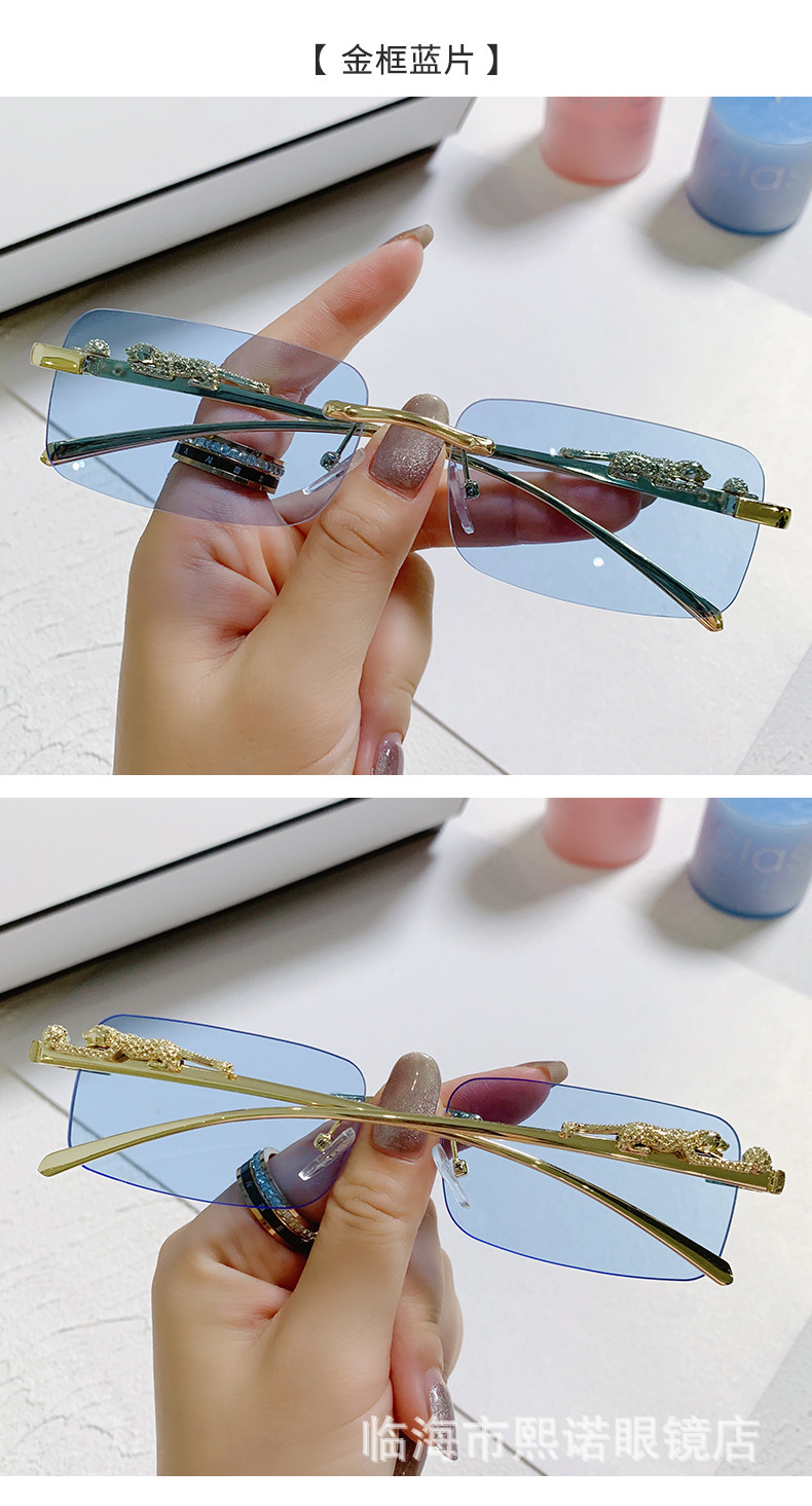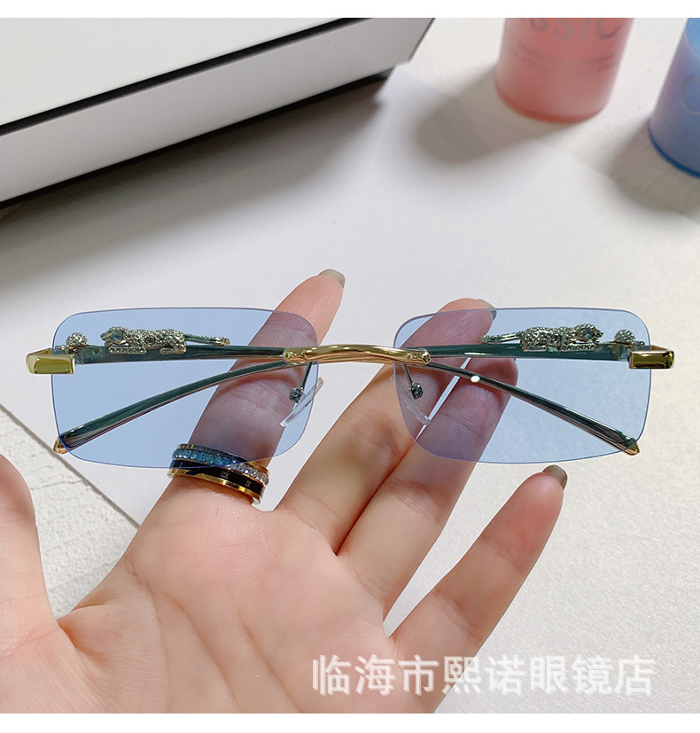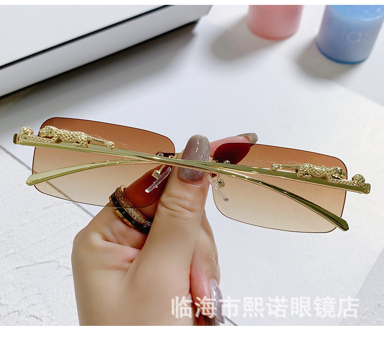 국경 간 치타 장식 프레임없는 사각형 선글라스 컬러 남성과 여성 복고풍 표범 머리 금속 선글라스 국경 도매스토어 가기