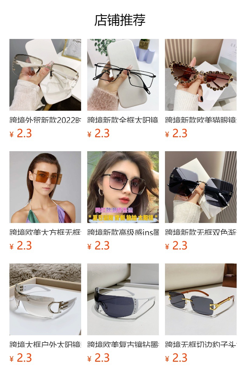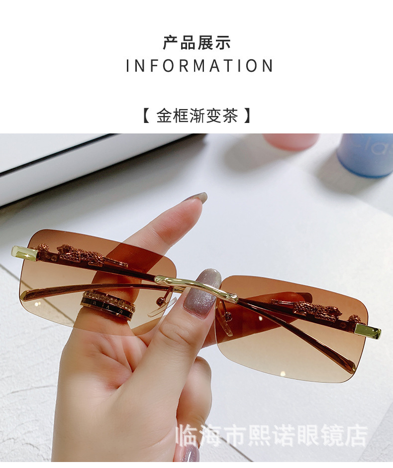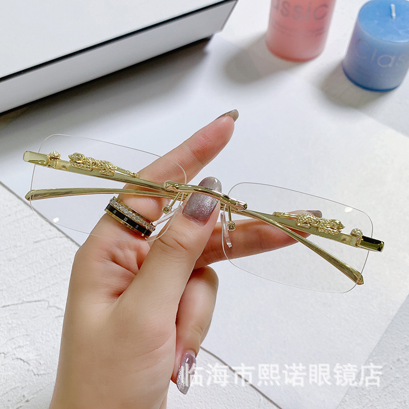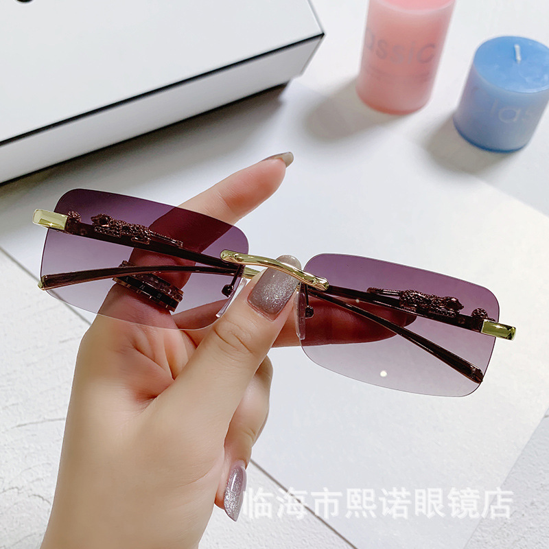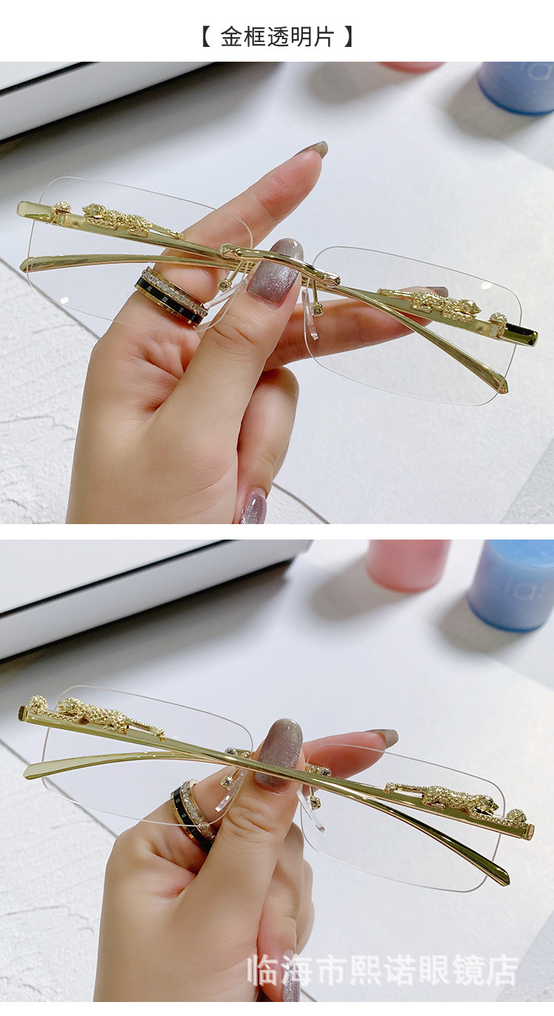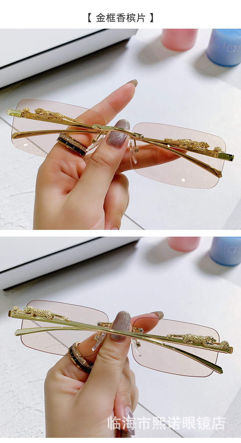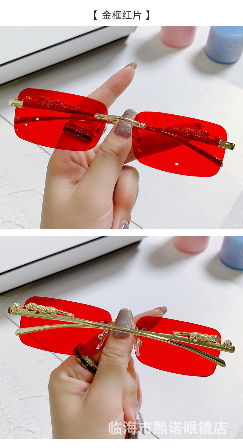 국경 간 치타 장식 프레임없는 사각형 선글라스 컬러 남성과 여성 복고풍 표범 머리 금속 선글라스 국경 도매스토어 가기