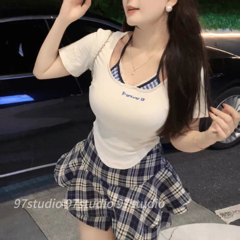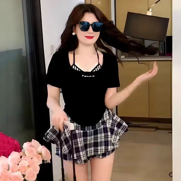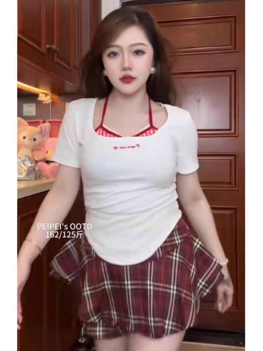 플러스 사이즈 통통한 순수 세트 여성 여름 통통녀 슬리밍 가짜 투피스 탑 격자 무늬 레드 스커트 투피스 세트스토어 가기