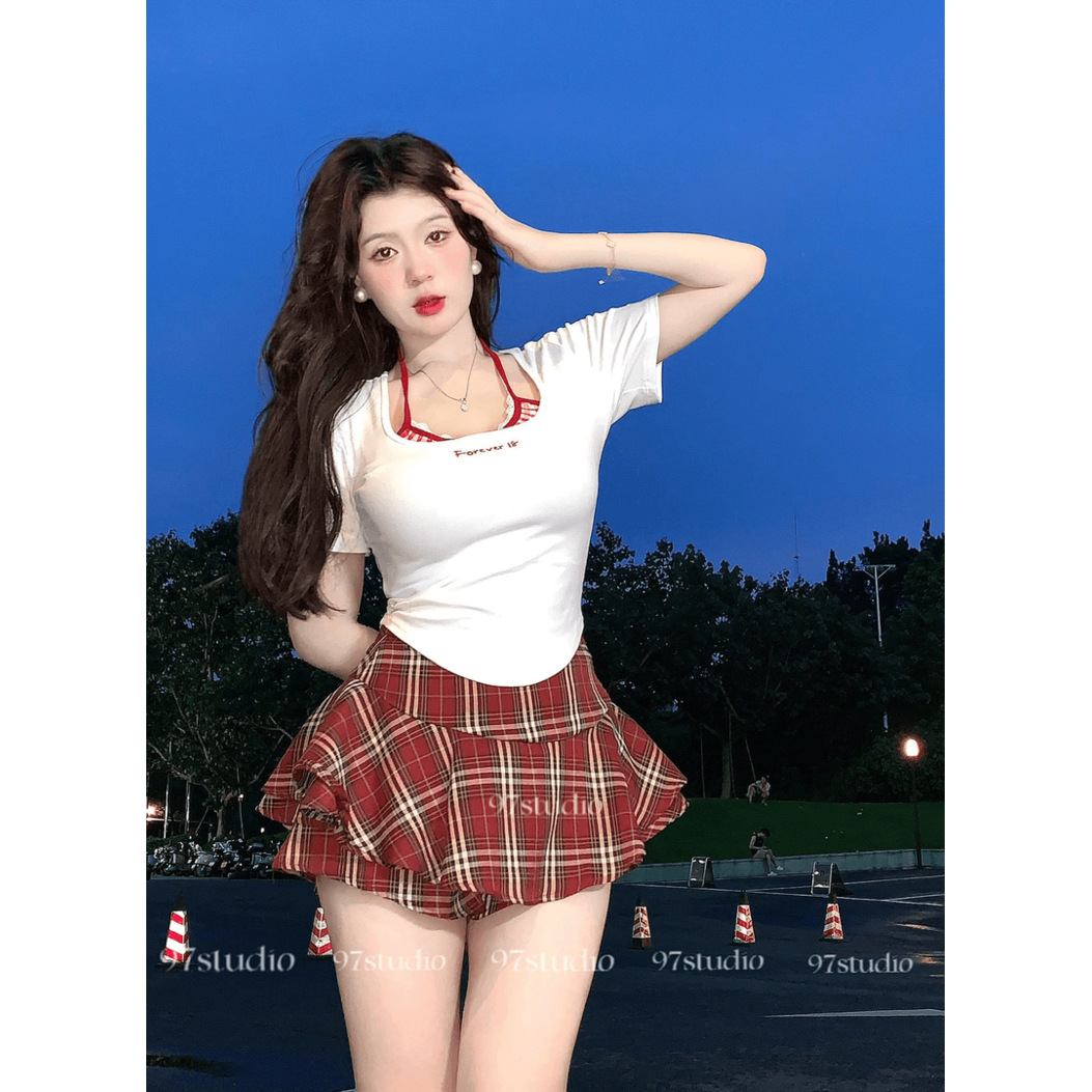 • 빨간색 체크 무늬 탑 + 빨간색 체크 무늬 스커트