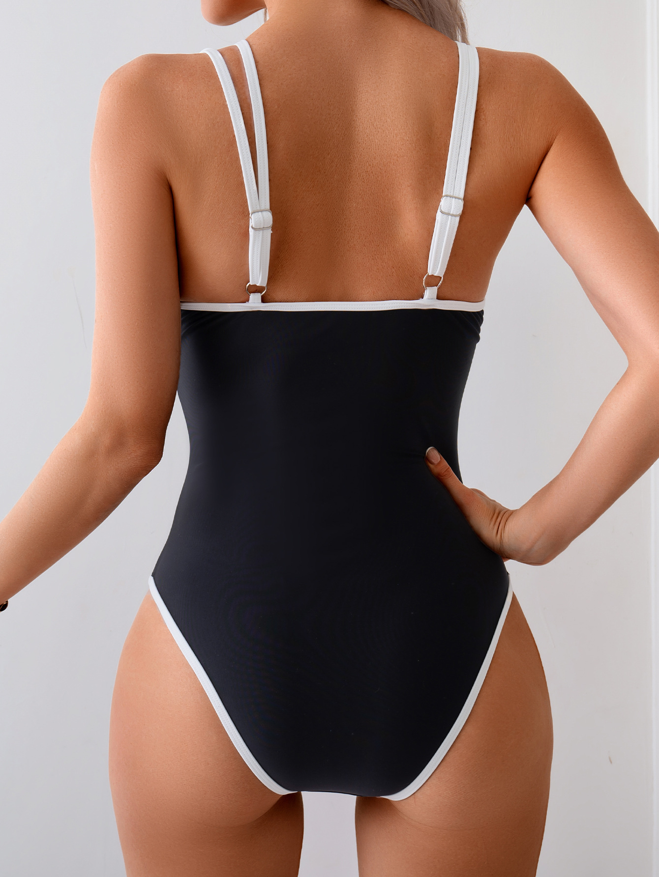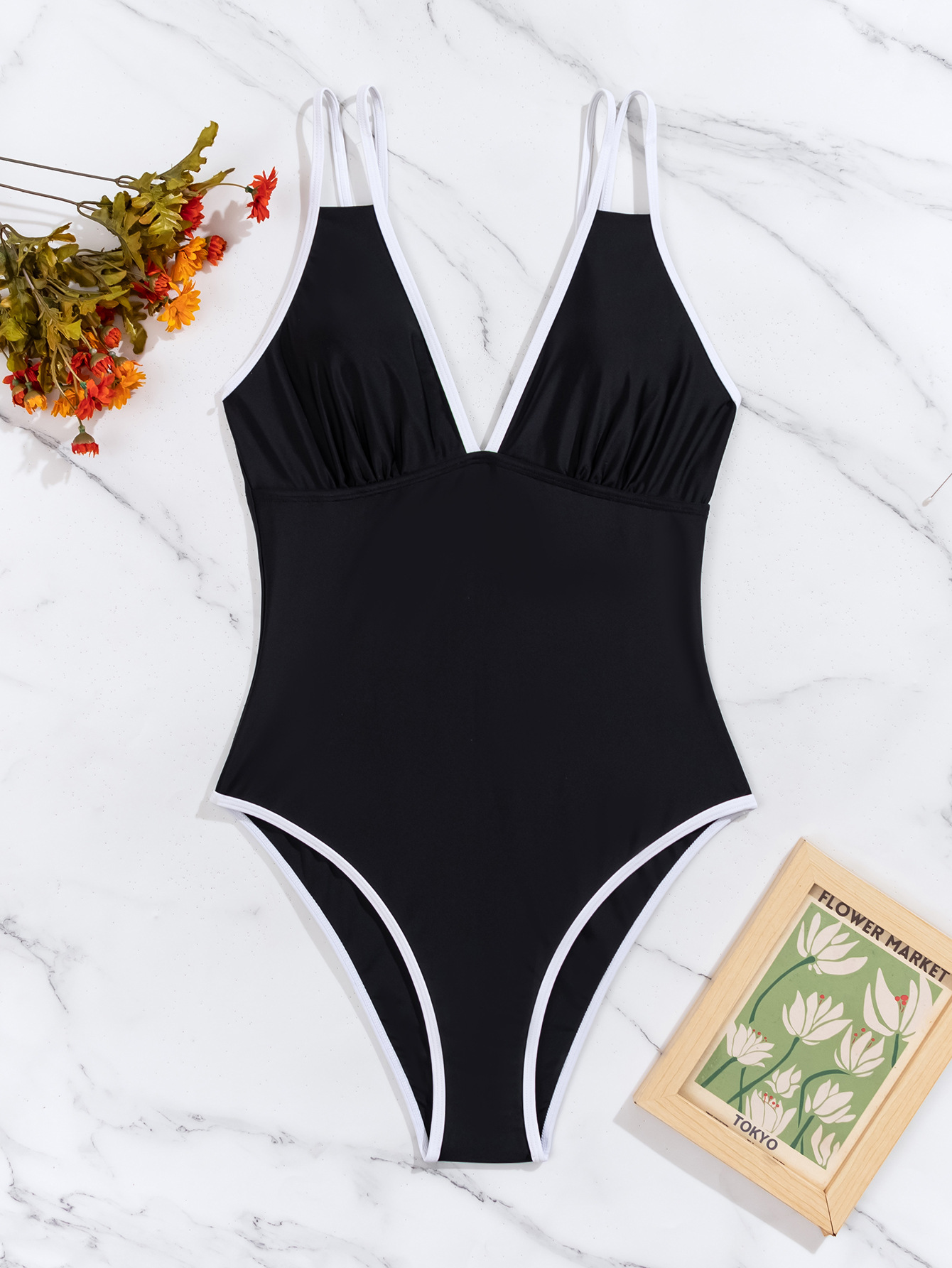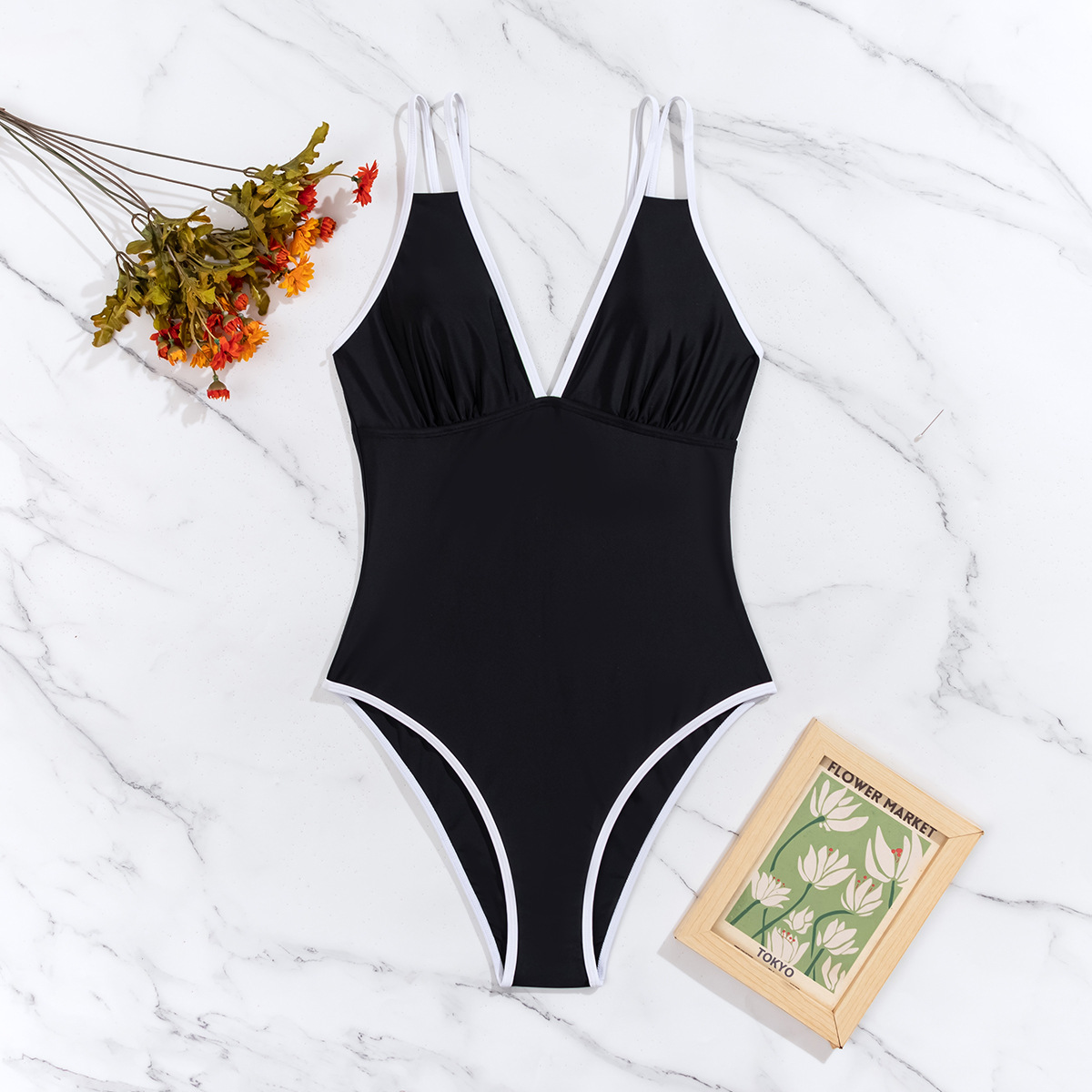 유럽과 미국의 국경을 넘나드는 새로운 스타일의 여성 흑백 대비 섹시한 V 넥 배 커버 슬리밍 팬티 비키니 원피스 수영복