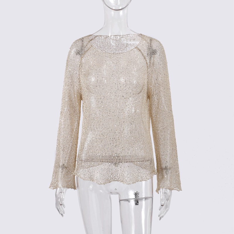 봄과 여름 2025 국경 대외 무역 새로운 솔리드 컬러 우아한 스quin 할로우 긴 소매 풀오버 스웨터스토어 가기