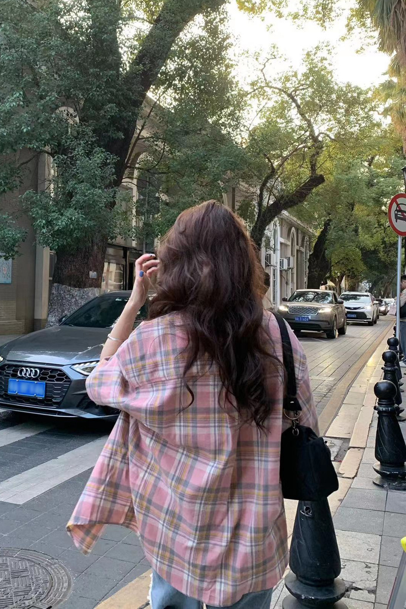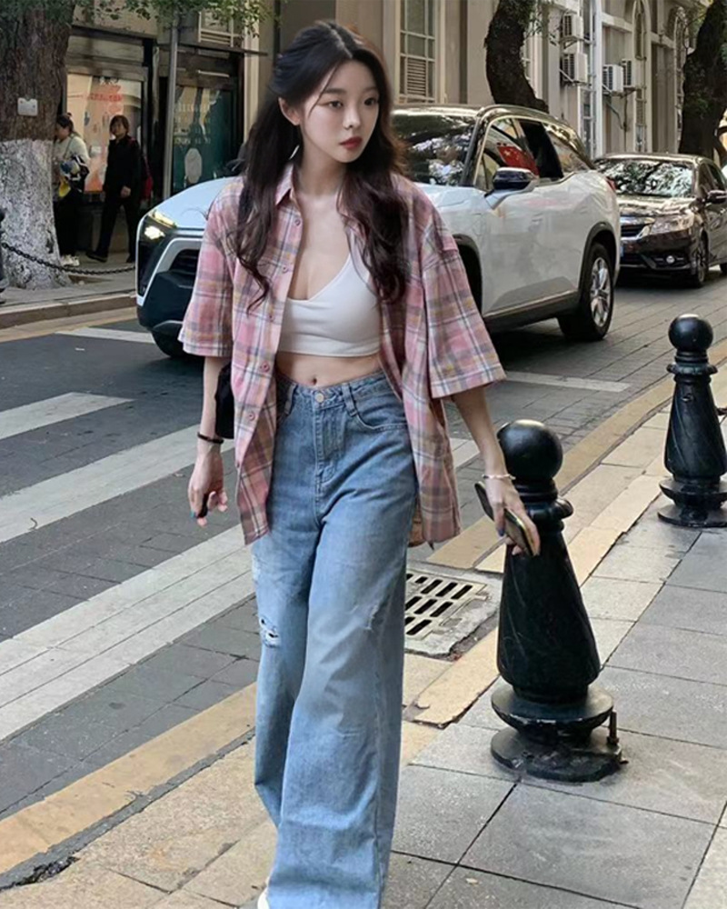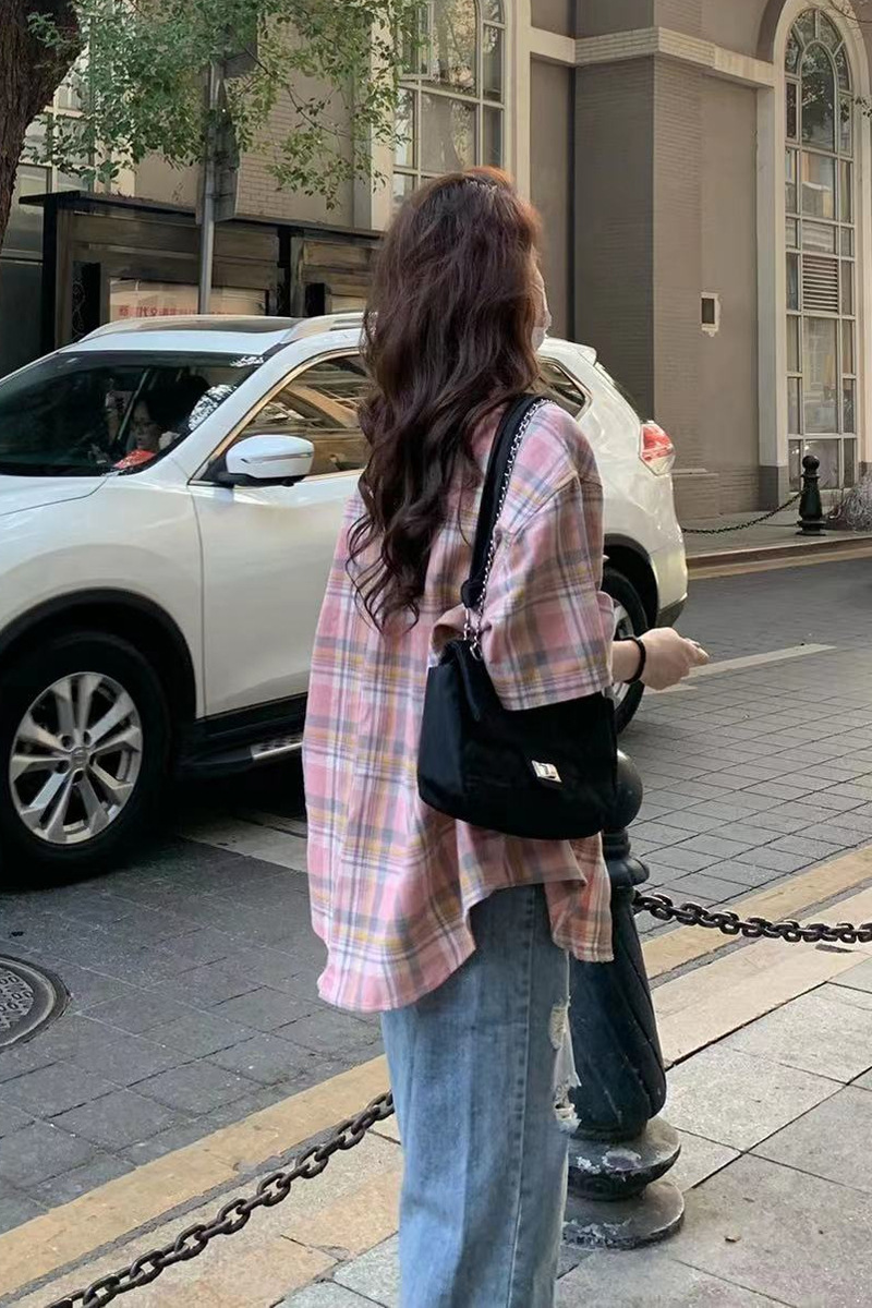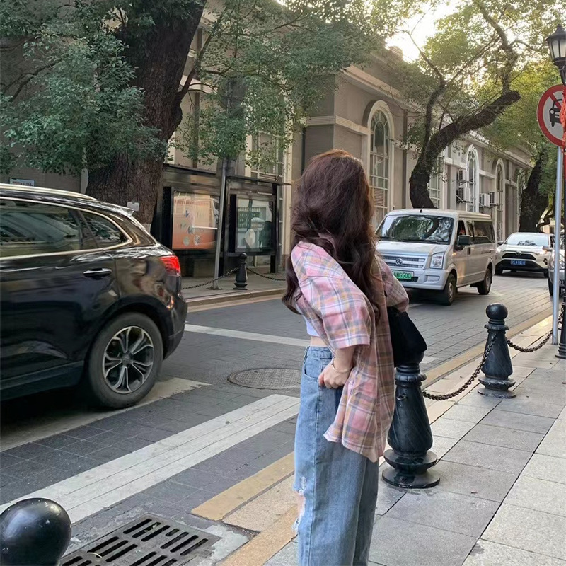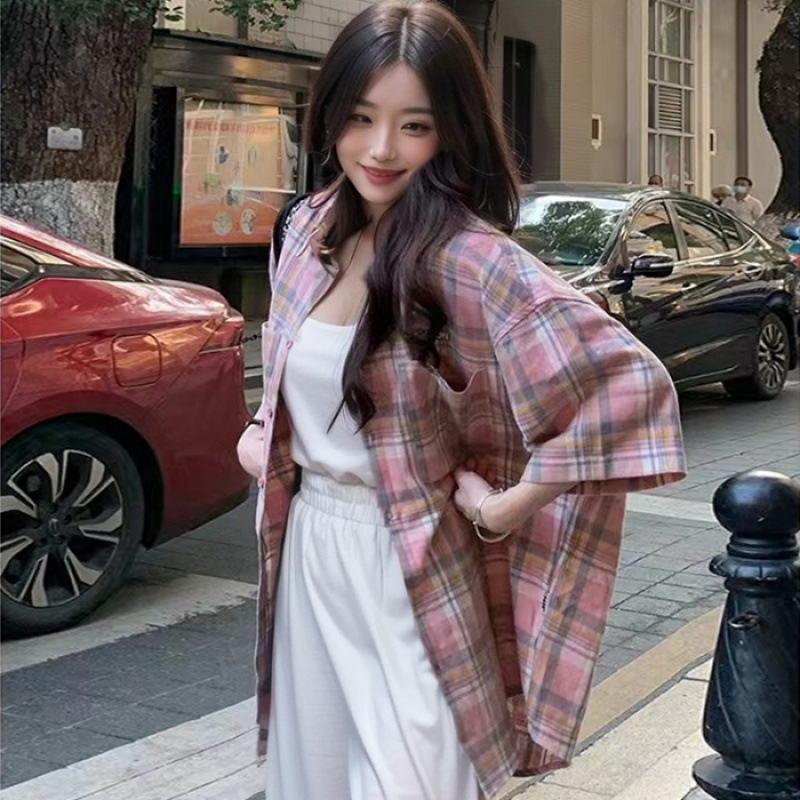 格子衬衫女春夏装宽松慵懒风洋气薄外套别致衬衣中长款短袖防晒衫스토어 가기