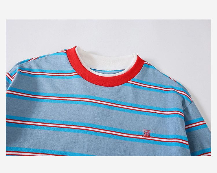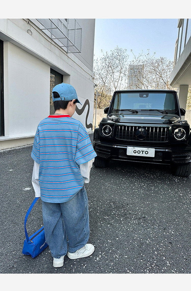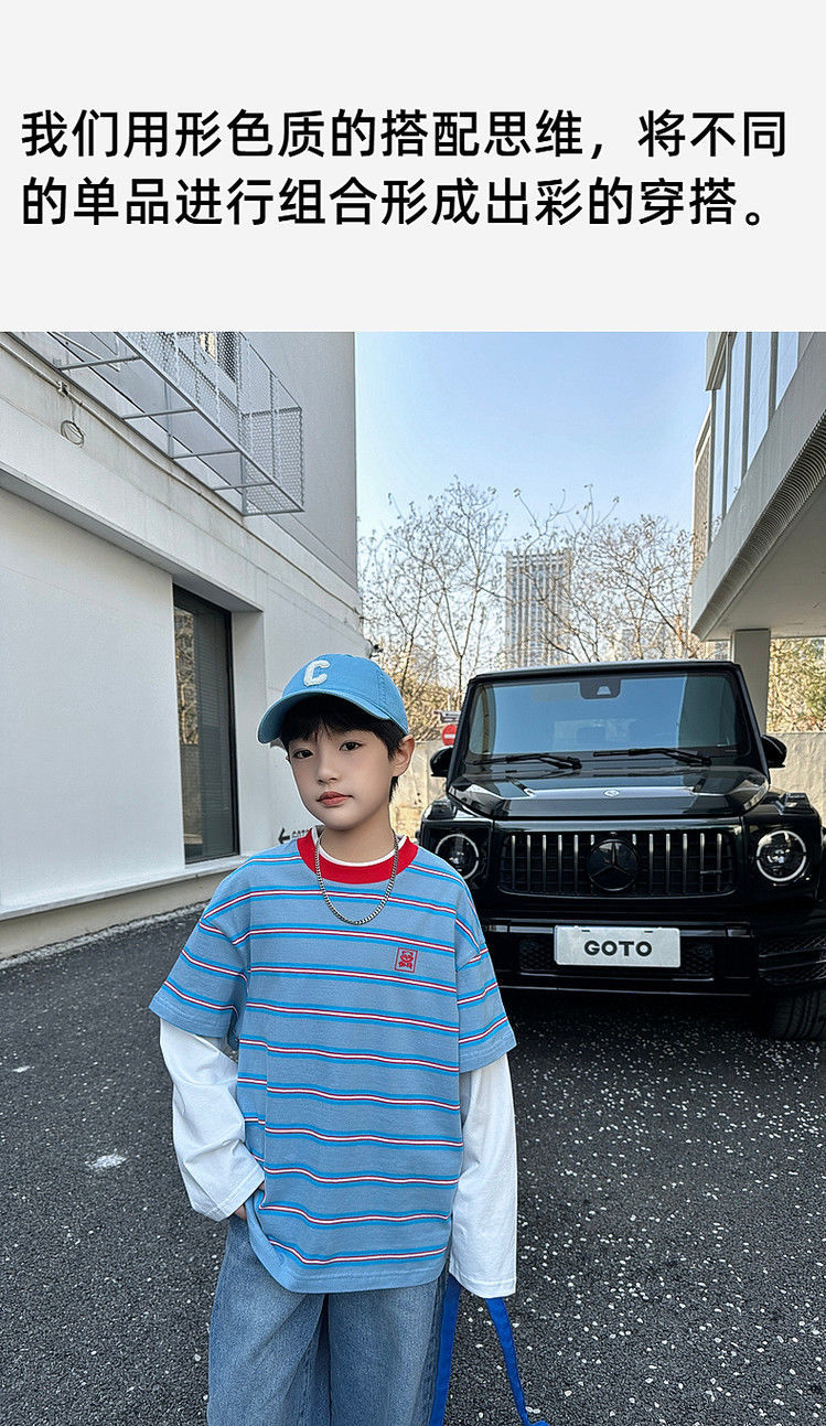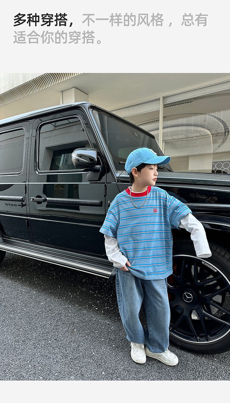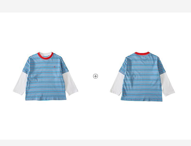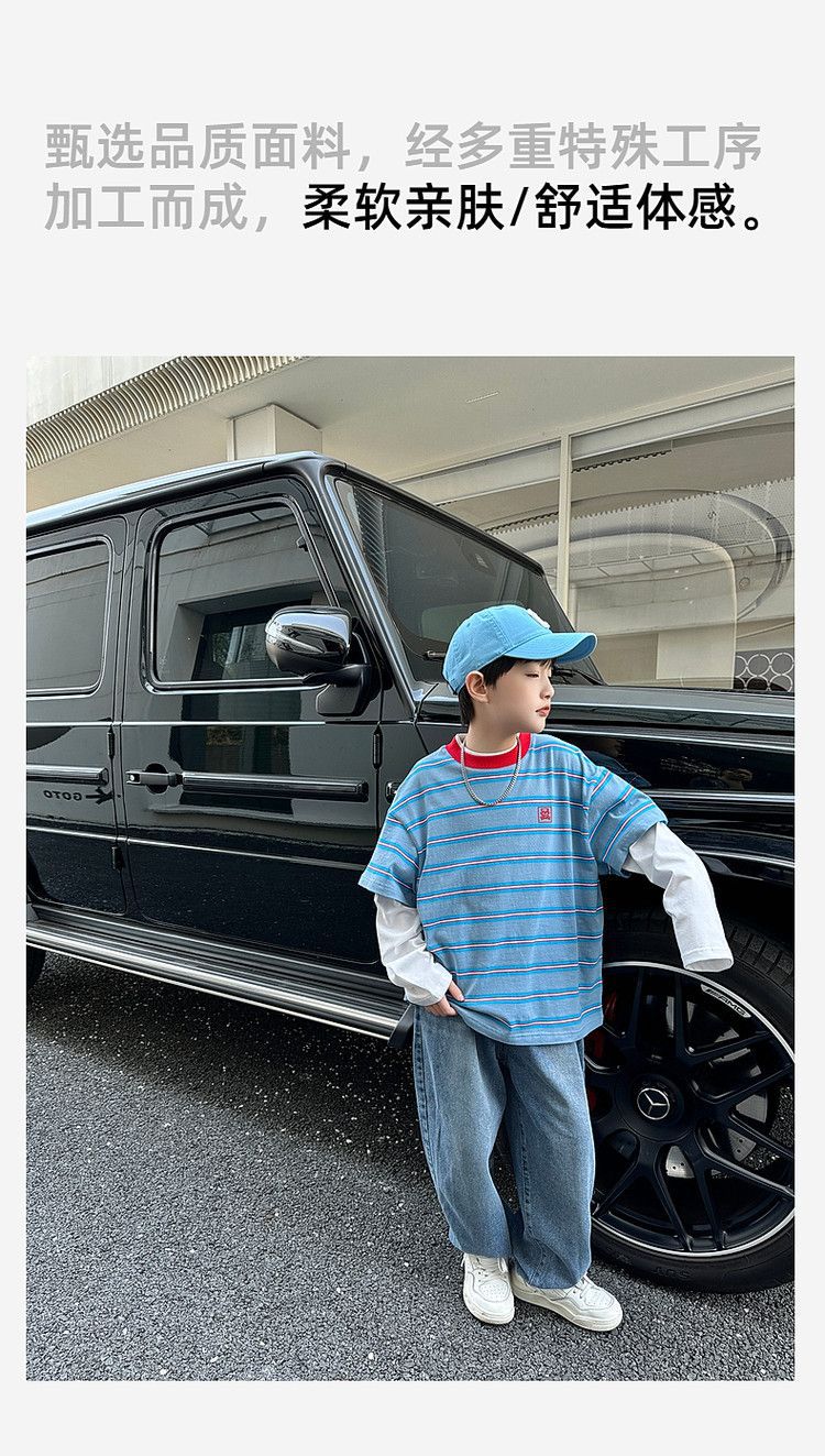 소년 줄무늬 면 티셔츠 긴 소매 어린이 봄 2025 새로운 소년 봄 서양식 가짜 투피스베이스 셔츠스토어 가기