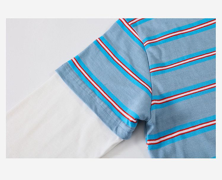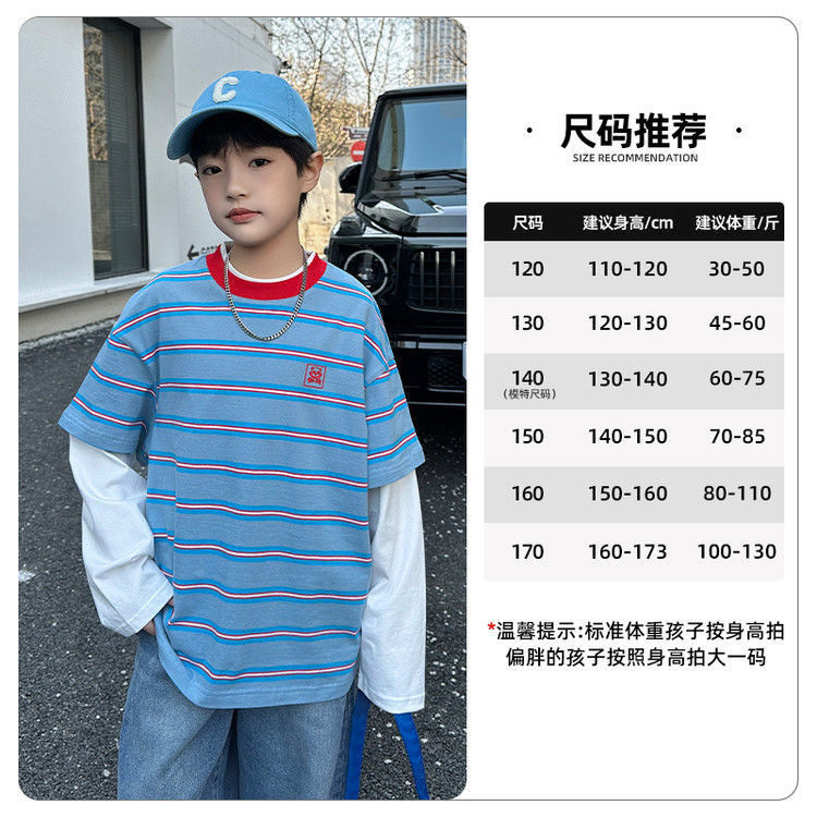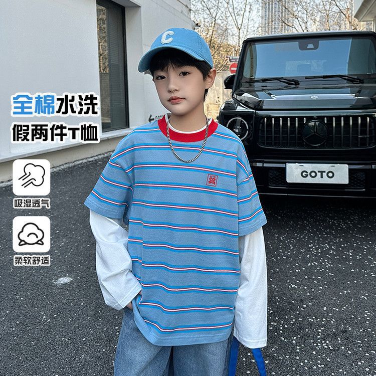 소년 줄무늬 면 티셔츠 긴 소매 어린이 봄 2025 새로운 소년 봄 서양식 가짜 투피스베이스 셔츠