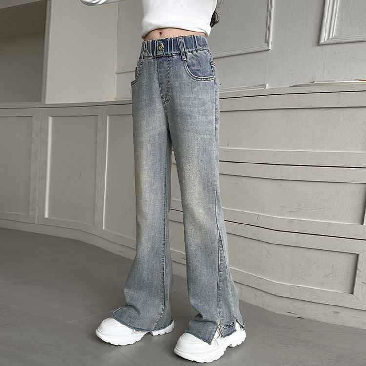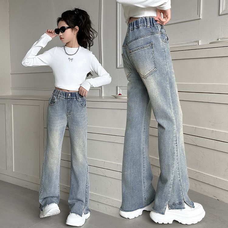 소녀 넓은 다리 바지 봄과 가을 2024 새로운 서양 스타일 큰 어린이 유행 가을 어린이 자수 사랑 청바지스토어 가기