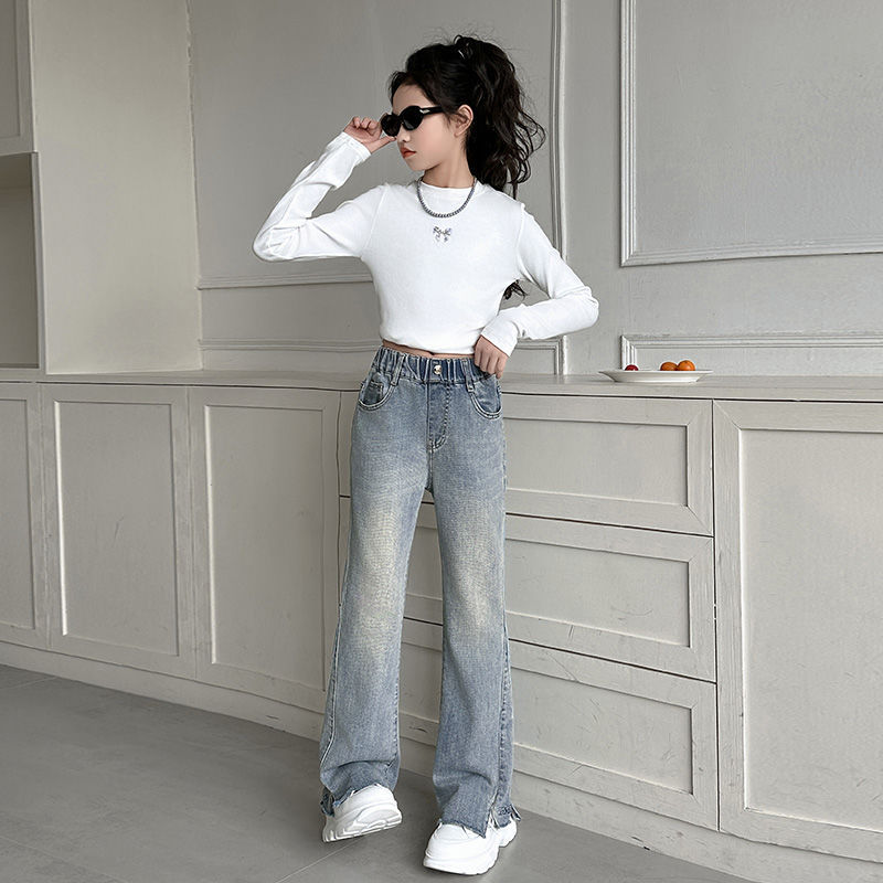 소녀 넓은 다리 바지 봄과 가을 2024 새로운 서양 스타일 큰 어린이 유행 가을 어린이 자수 사랑 청바지