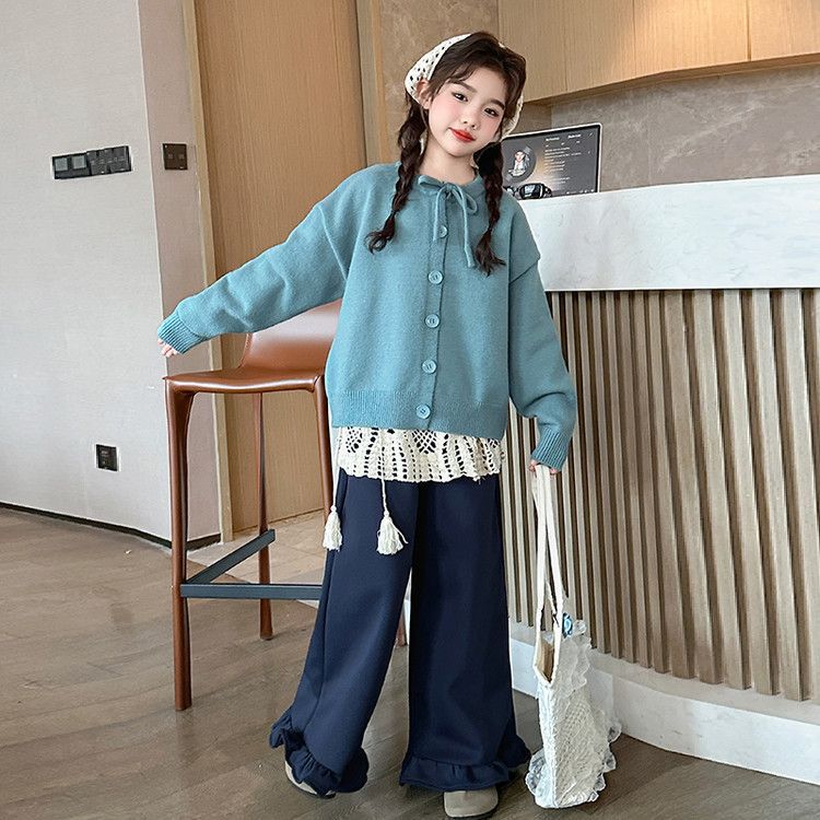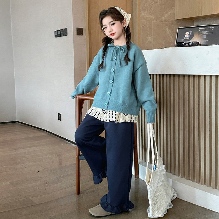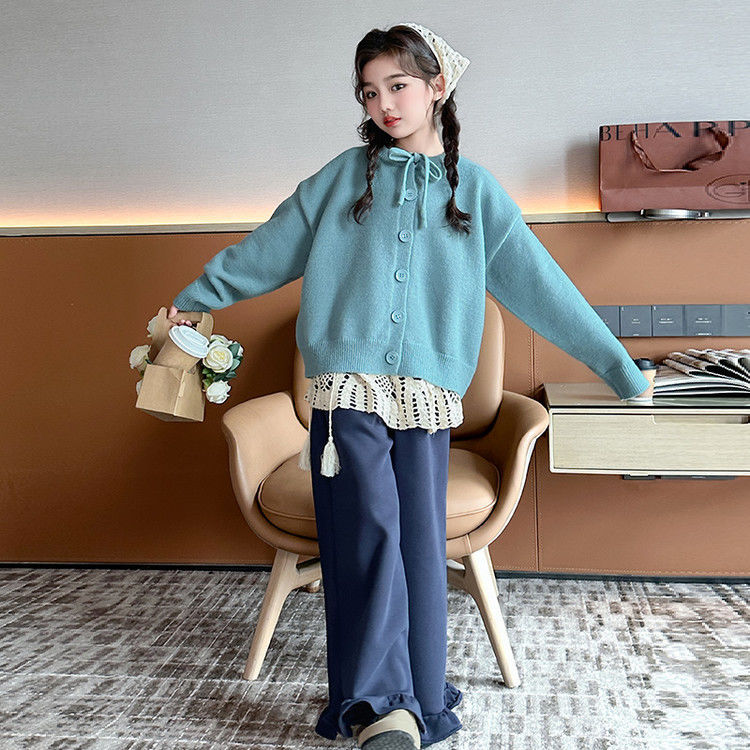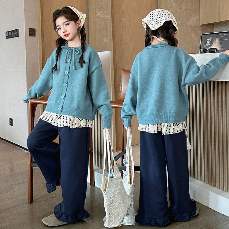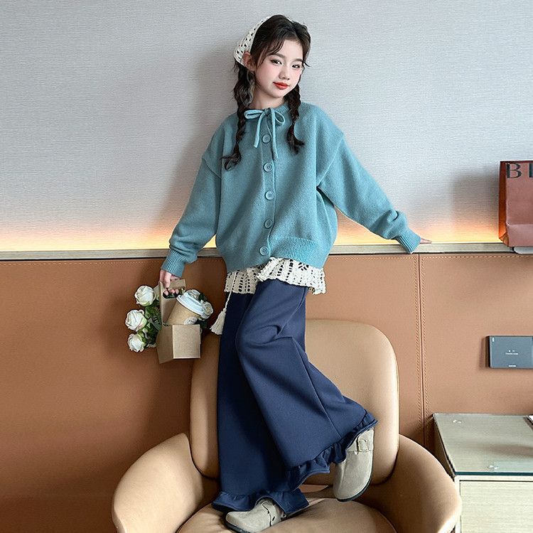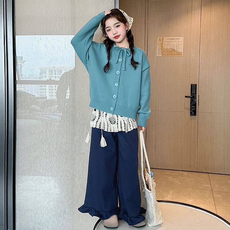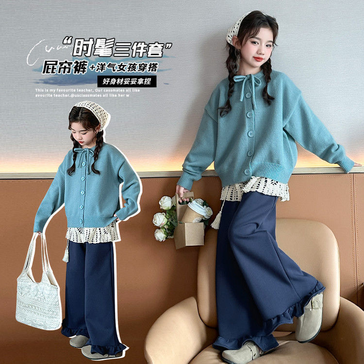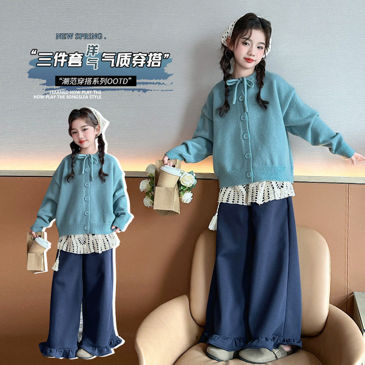 여자 스웨터 바지 3 피스 세트 2025 봄 새로운 부드러운 탑 니트 카디건 스웨터 코트 여성의 봄과 가을