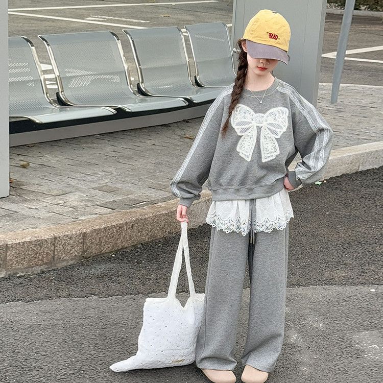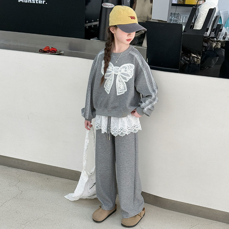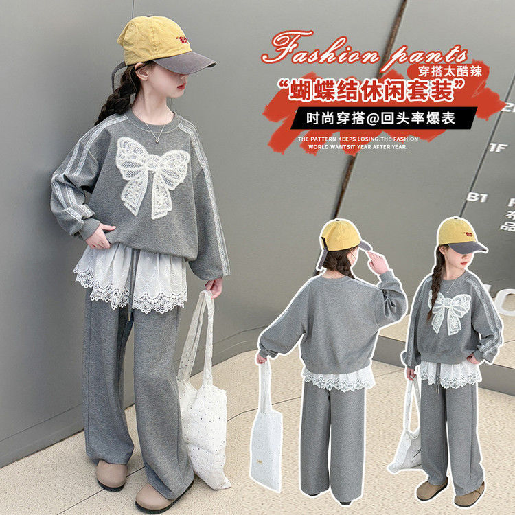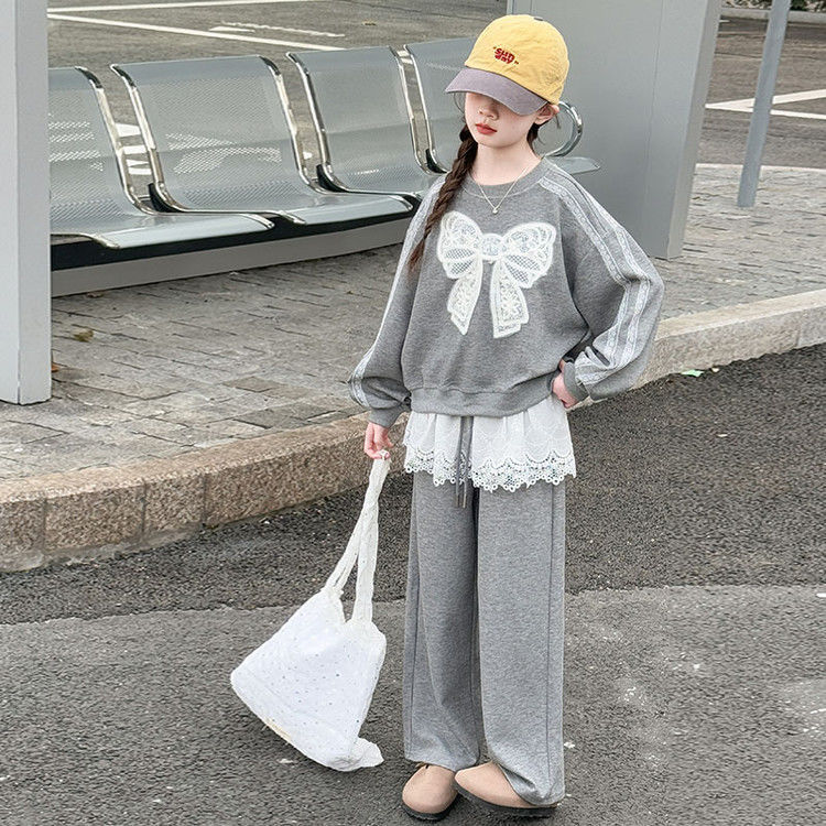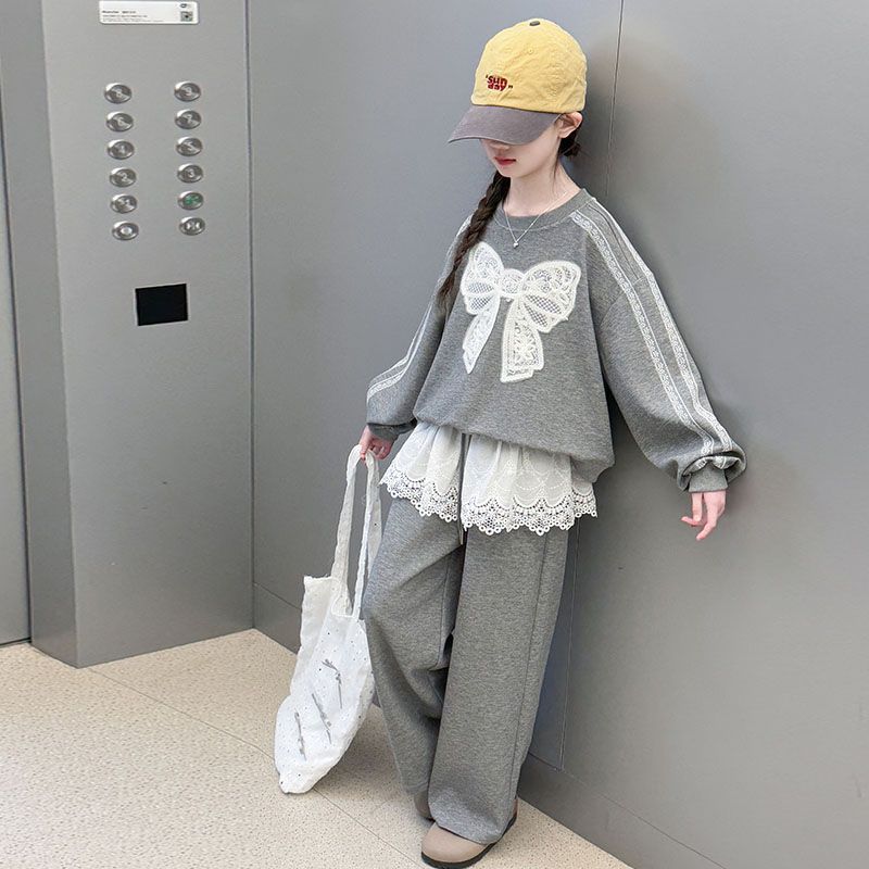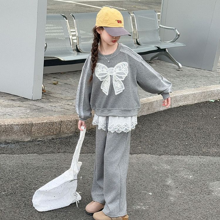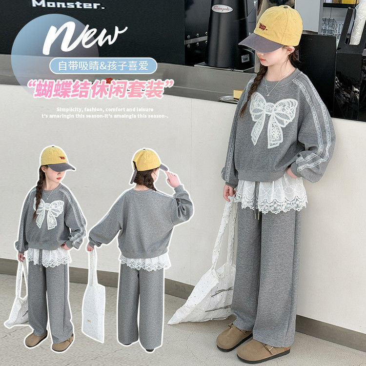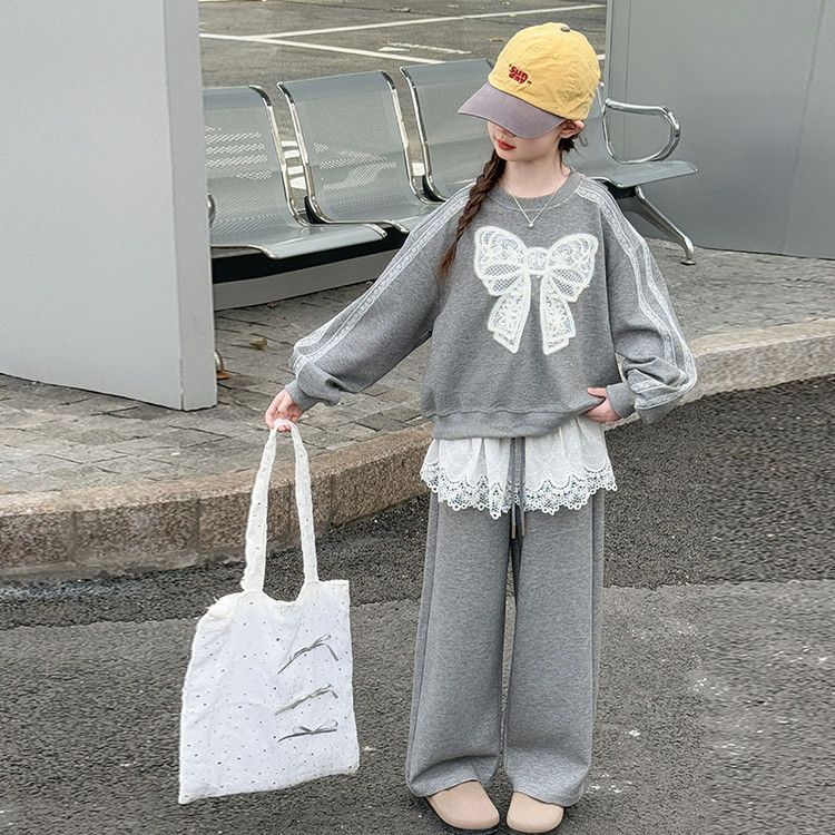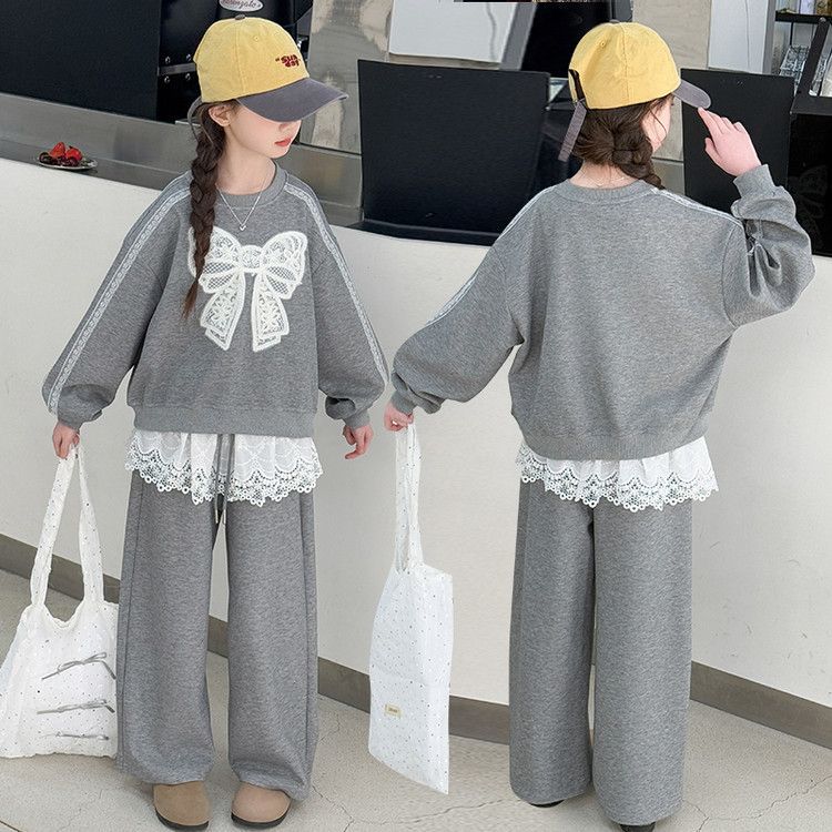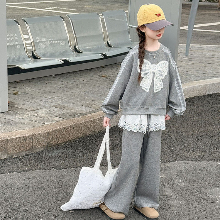 소녀 가을 스웨터 세트 2025 새로운 캐주얼 서양식 활 어린이 레이스 배치 커튼 스웨터 투피스 세트스토어 가기