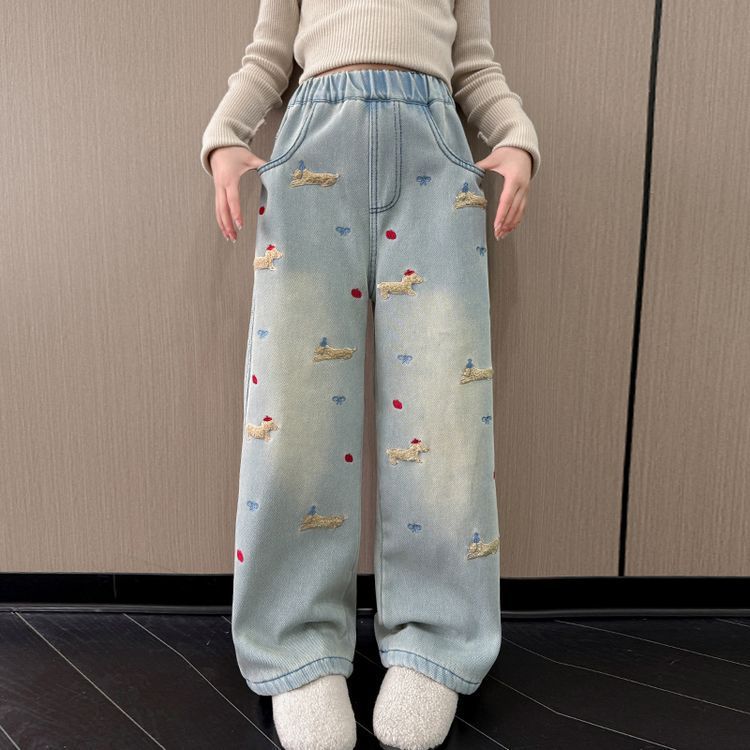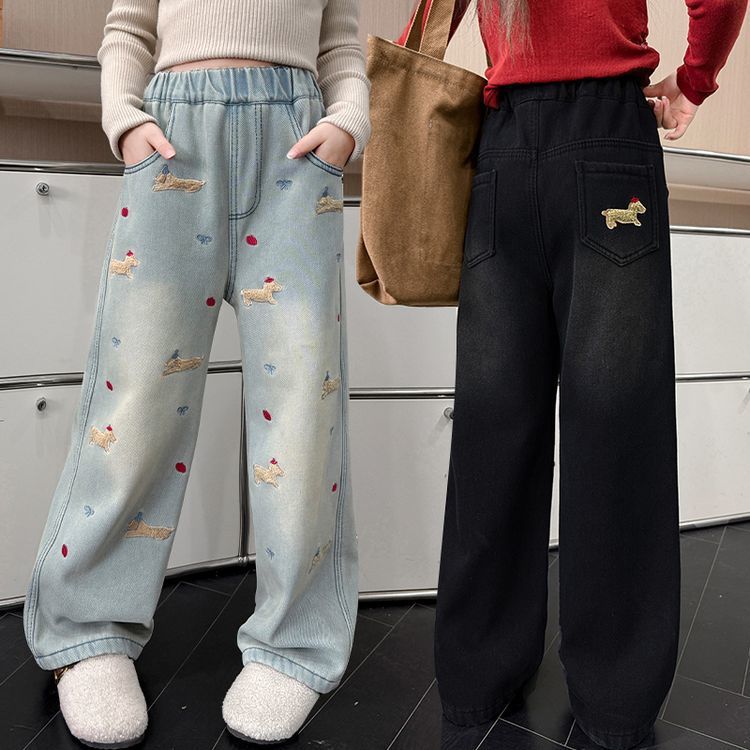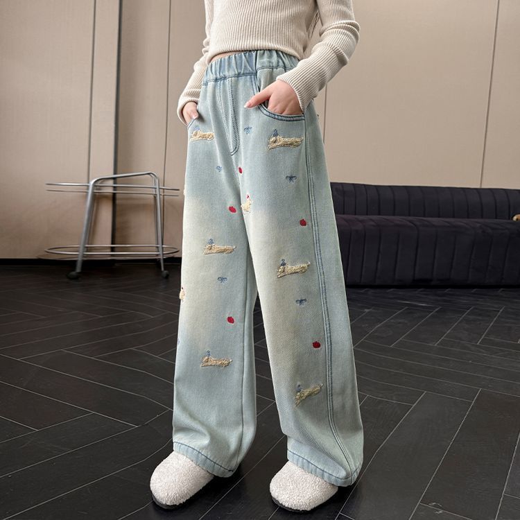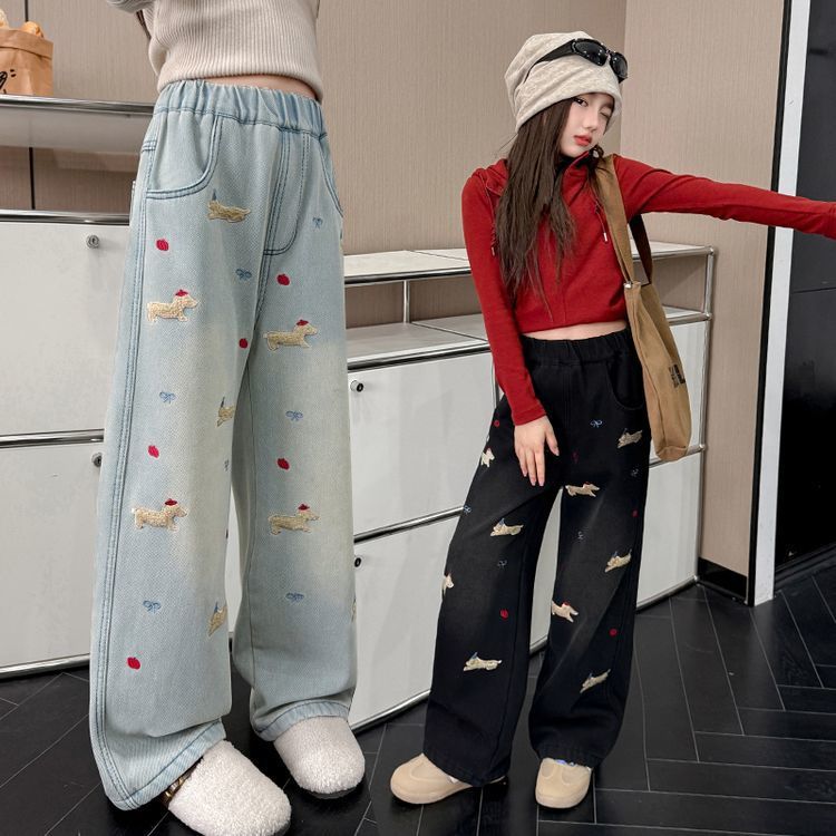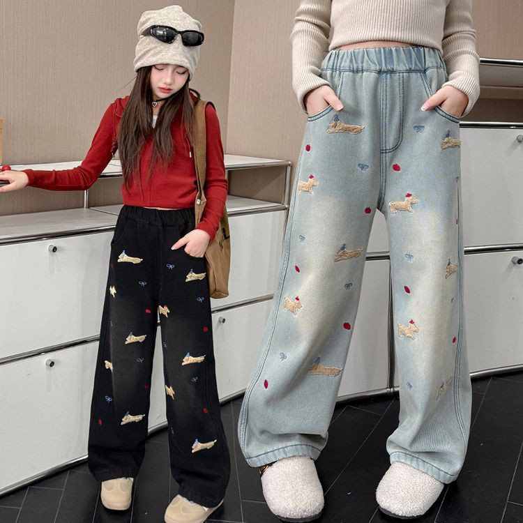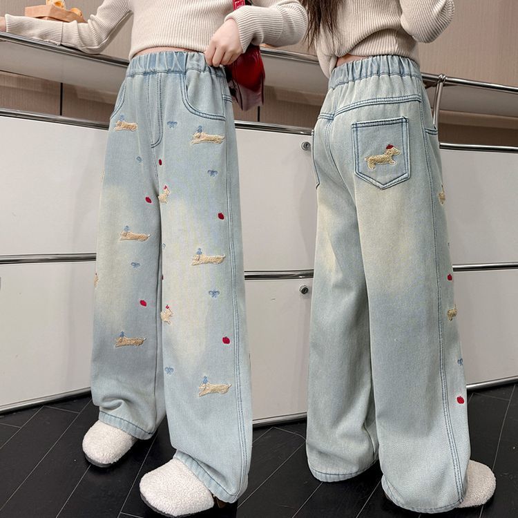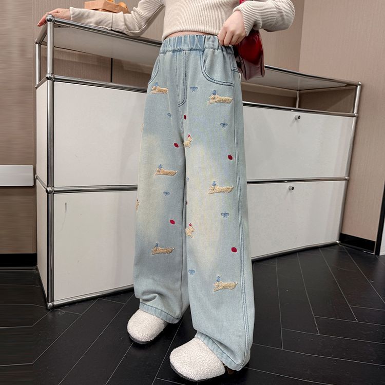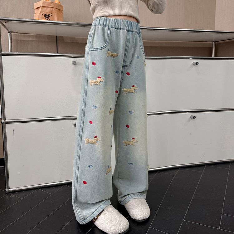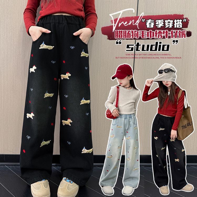 소녀 바지 봄과 가을 2025 새로운 봄 원피스 소녀 온라인 인기있는 외국 스타일 자수 스트레이트 바지 어린이 봄 청바지스토어 가기