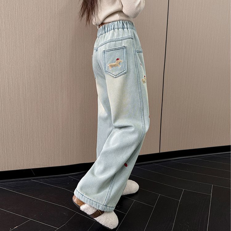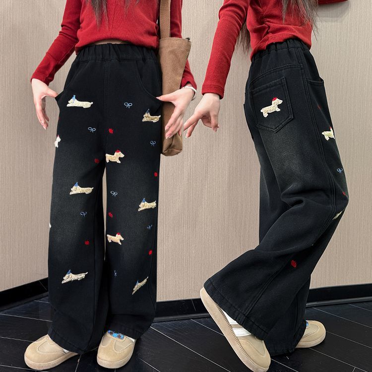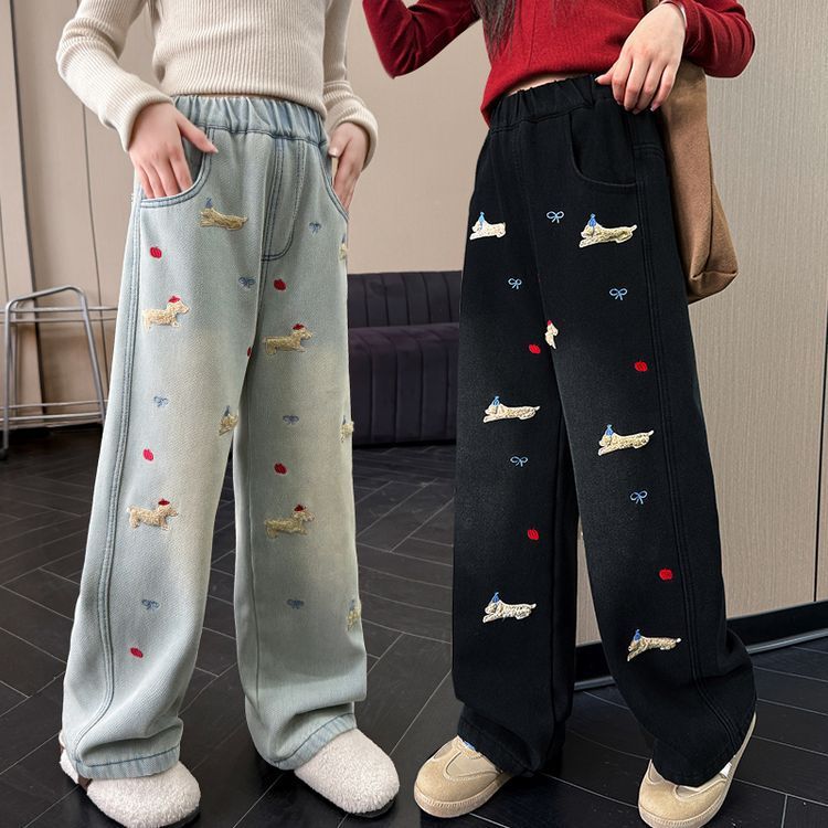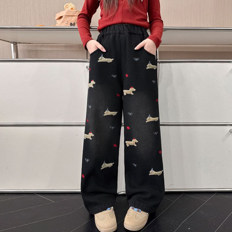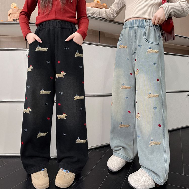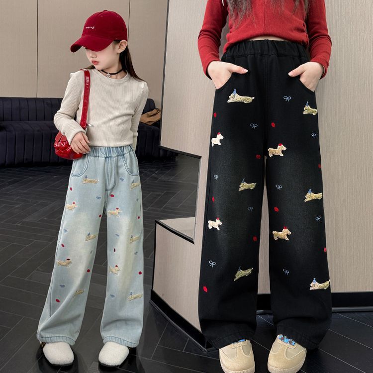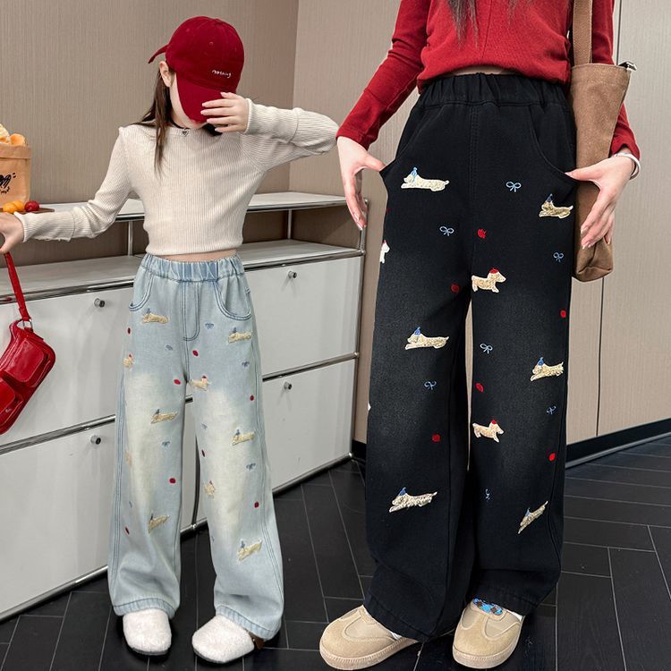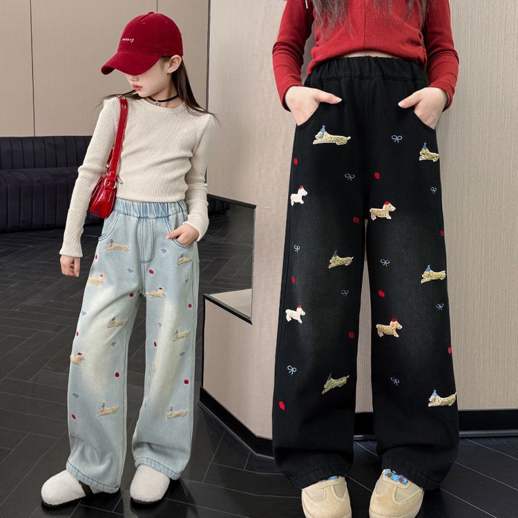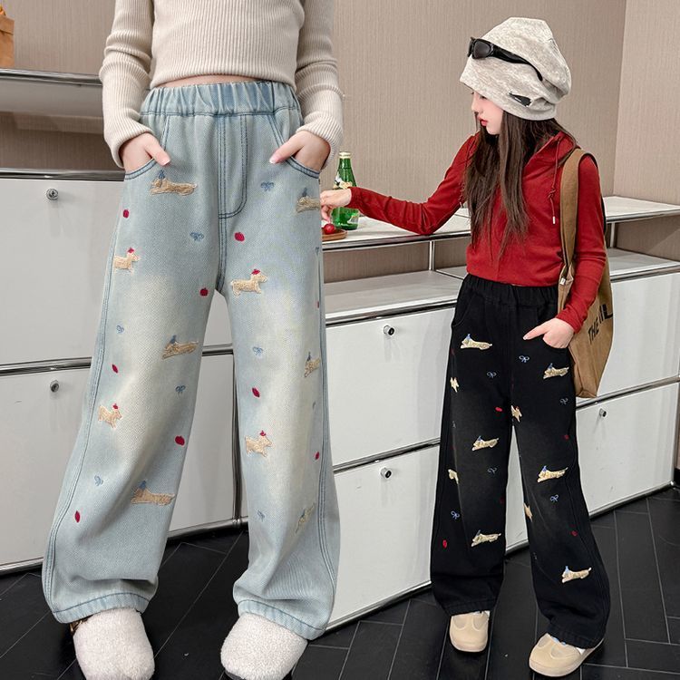 소녀 바지 봄과 가을 2025 새로운 봄 원피스 소녀 온라인 인기있는 외국 스타일 자수 스트레이트 바지 어린이 봄 청바지스토어 가기
