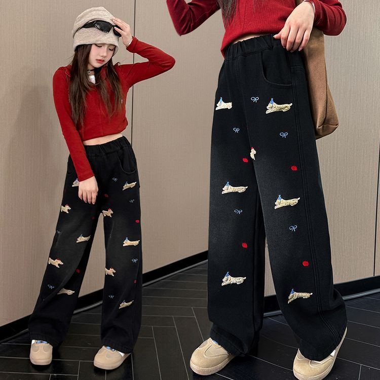 소녀 바지 봄과 가을 2025 새로운 봄 원피스 소녀 온라인 인기있는 외국 스타일 자수 스트레이트 바지 어린이 봄 청바지