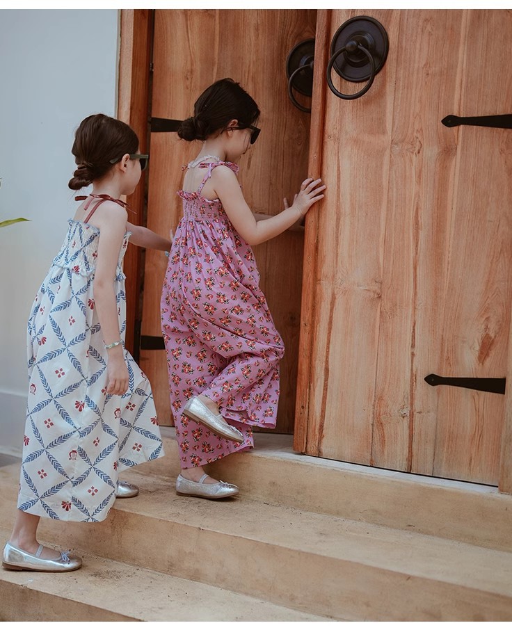 한국 아동복 소녀의 빈티지 화이트 플로럴 스트랩 서스펜더 여름 점프 수트 서스펜더 느슨한 넓은 다리 바지
