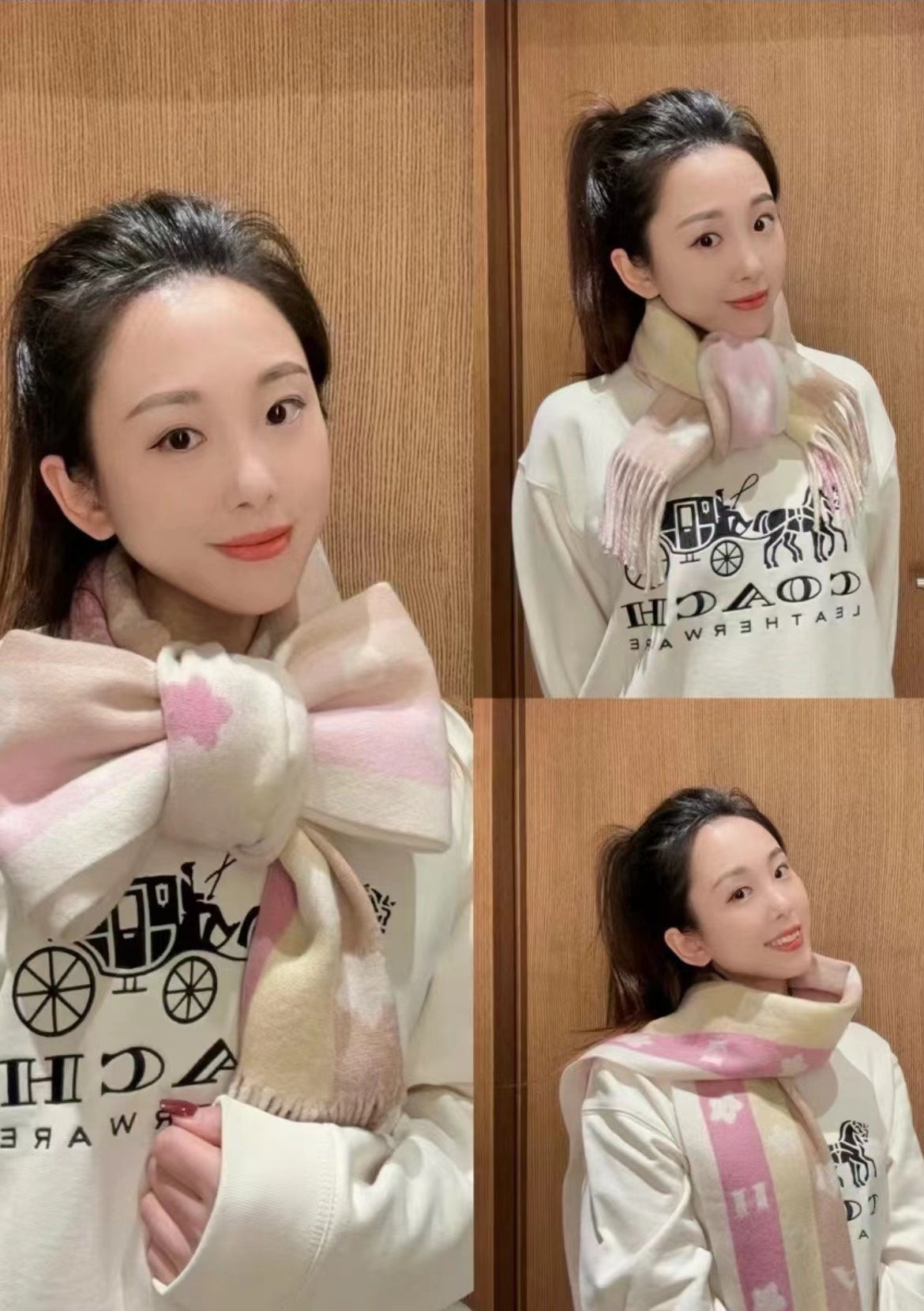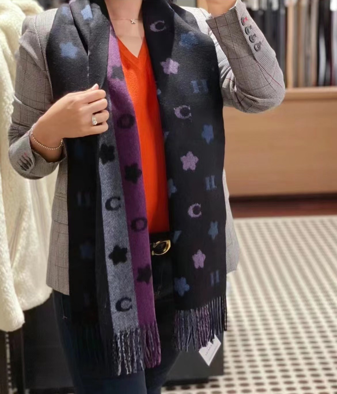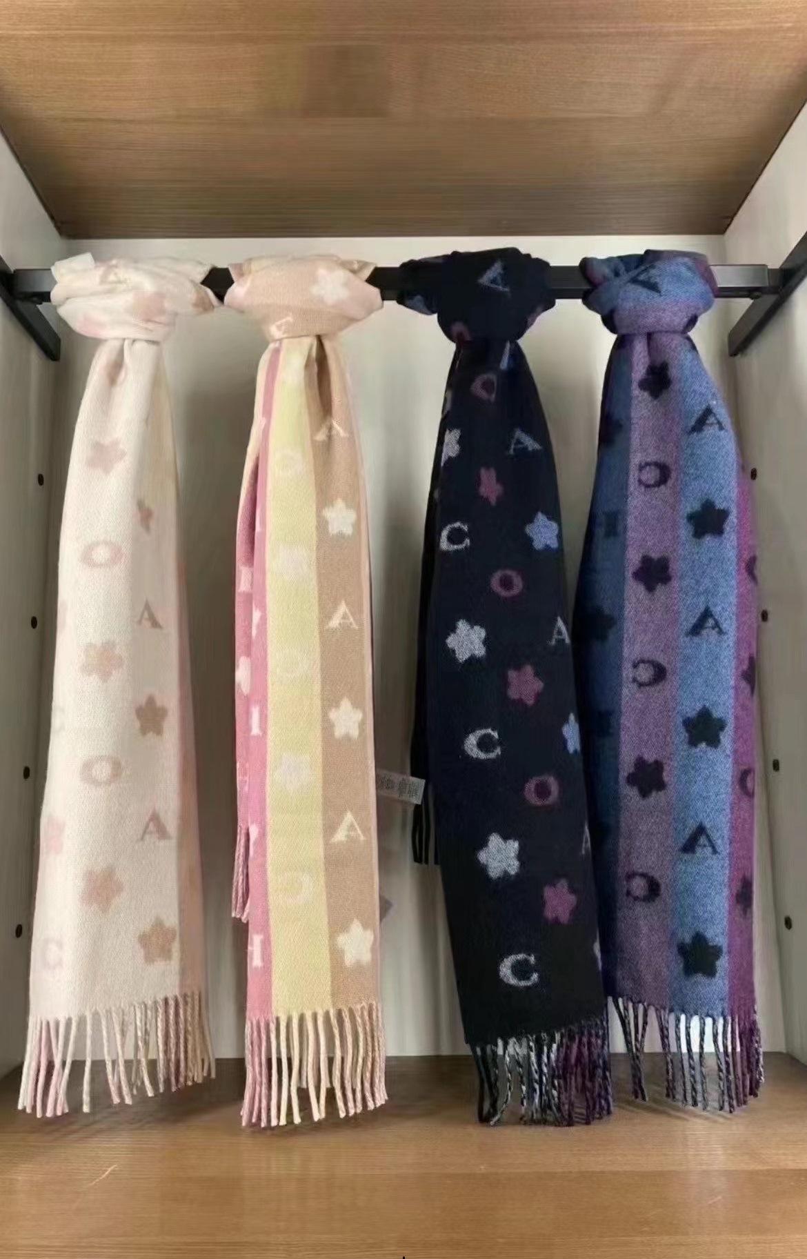 双面双色,不仅有颜值还有品质!羊毛的材质手感超级软糯火和舒服!整体宽度还可以,算是小披肩,正反面做的互补色,一面是深色搭配浅色底,另一面是相反色。新款花朵星星款真的很美,上身效果绝绝子!字母款经典的红色,气质的灰色,优雅的黑色,还有温温柔柔的奶茶色,一定要冲这一条~~