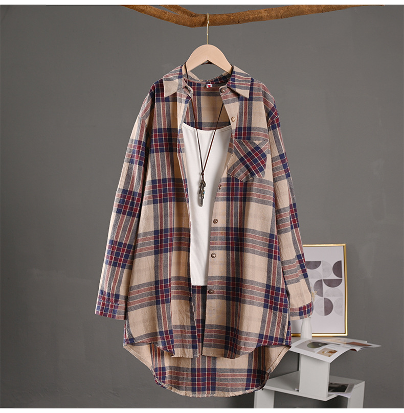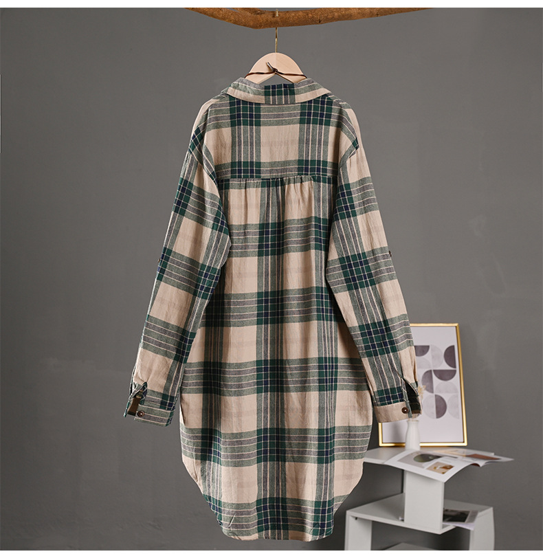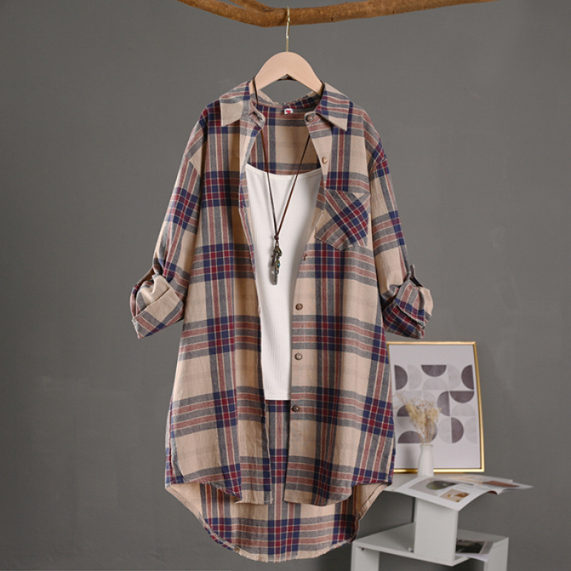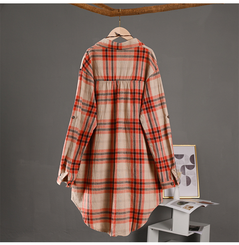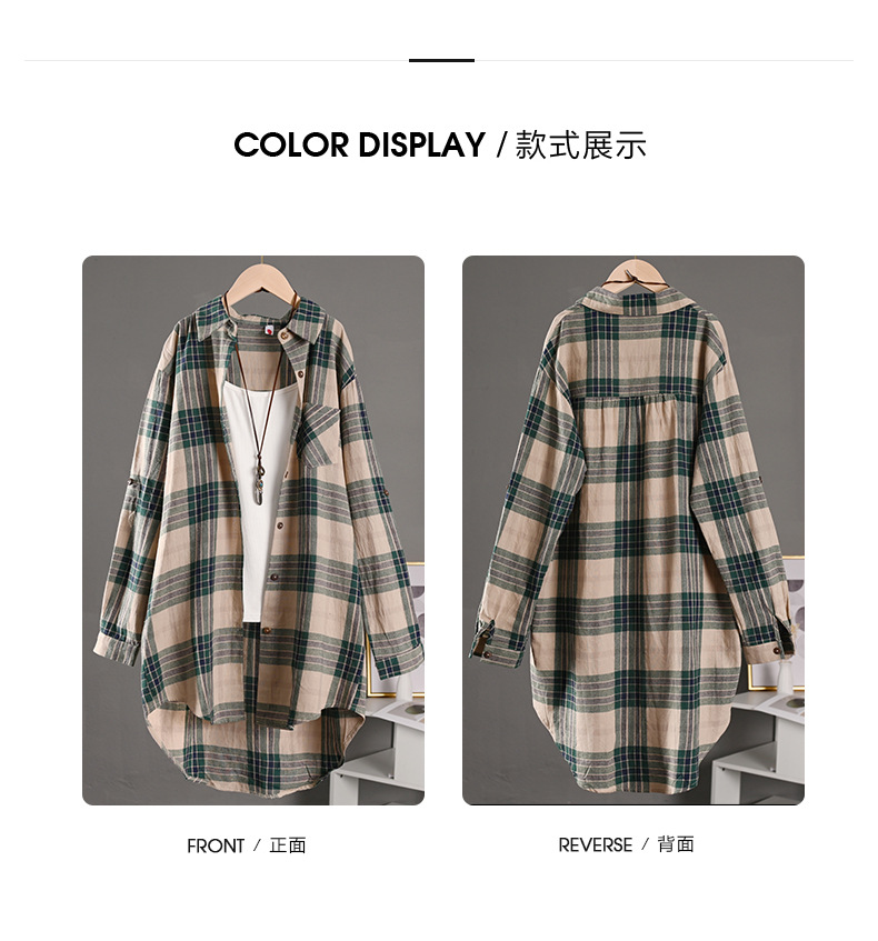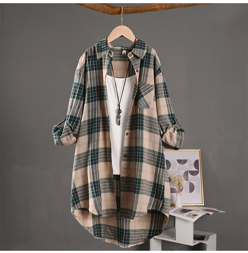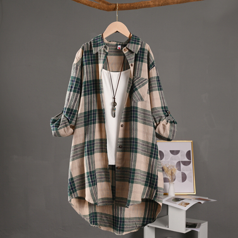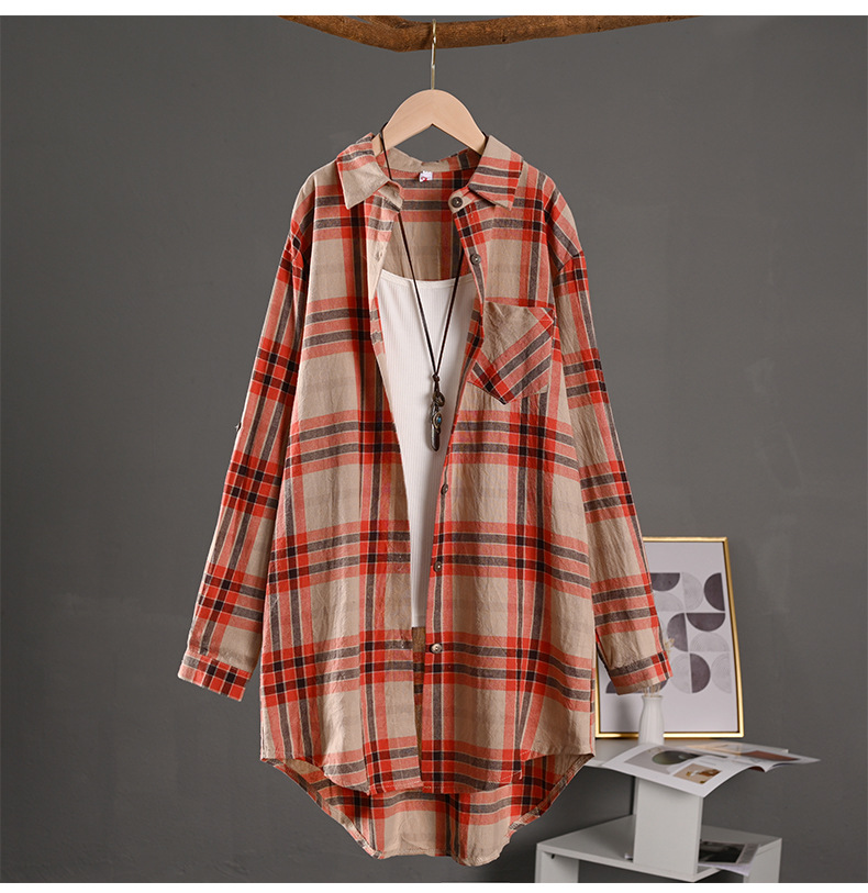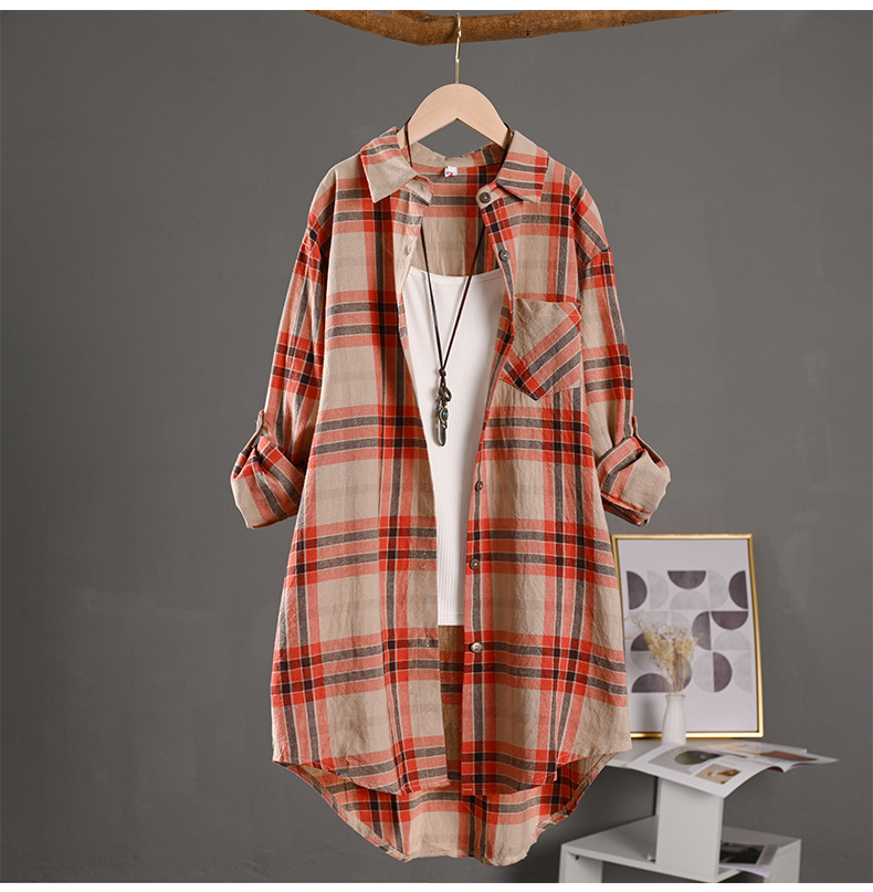 국경 간 여성 면 및 린넨 셔츠 중간 길이 복고풍 봄, 여름, 가을 자외선 차단 셔츠 카디건 얇은 코트 긴팔 격자 무늬 셔츠스토어 가기