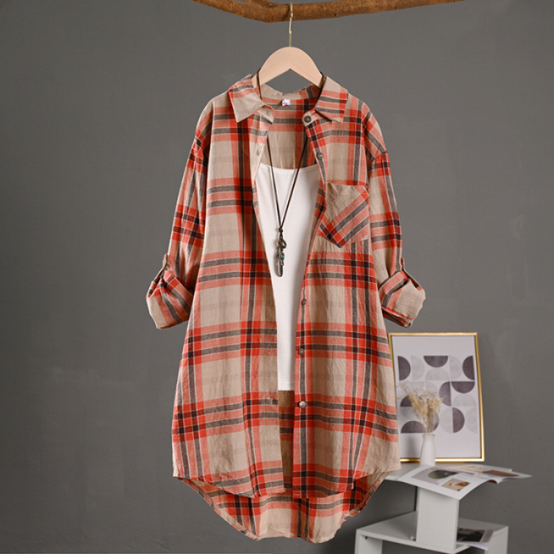 국경 간 여성 면 및 린넨 셔츠 중간 길이 복고풍 봄, 여름, 가을 자외선 차단 셔츠 카디건 얇은 코트 긴팔 격자 무늬 셔츠