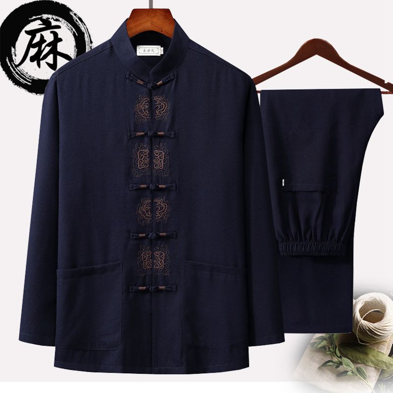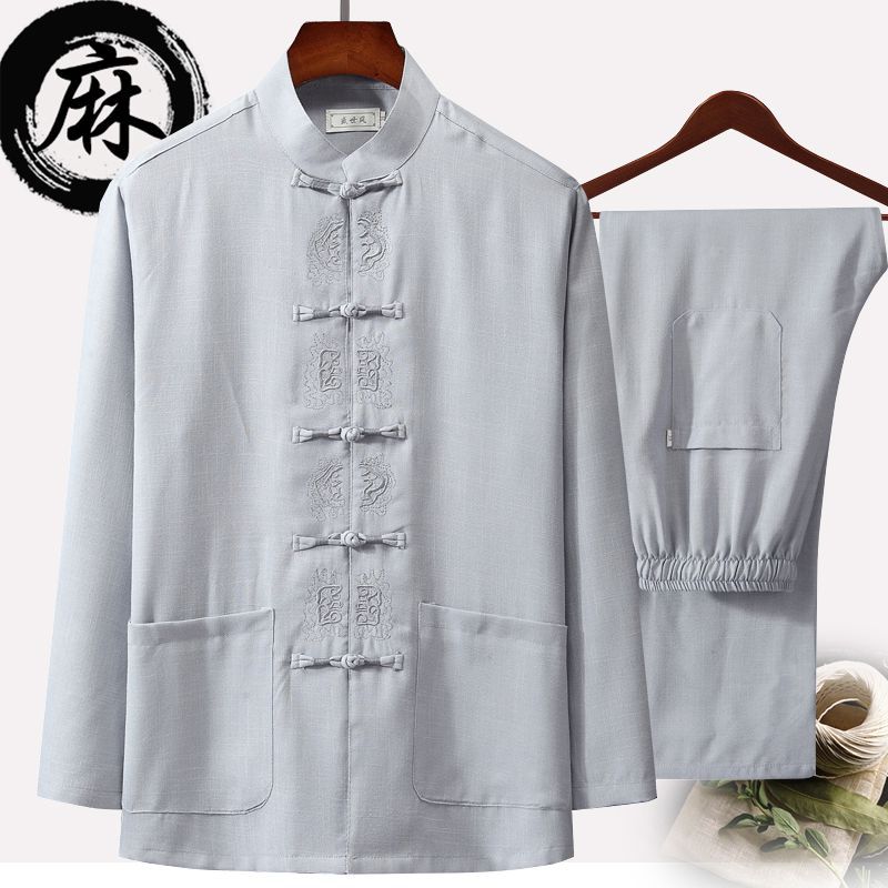 中国风男装亚麻中老年唐装男长袖套装棉麻爷爷秋季衣服秋装爸爸装