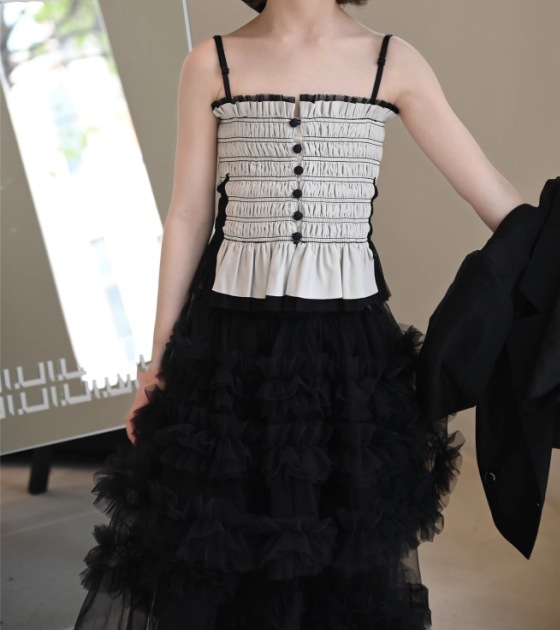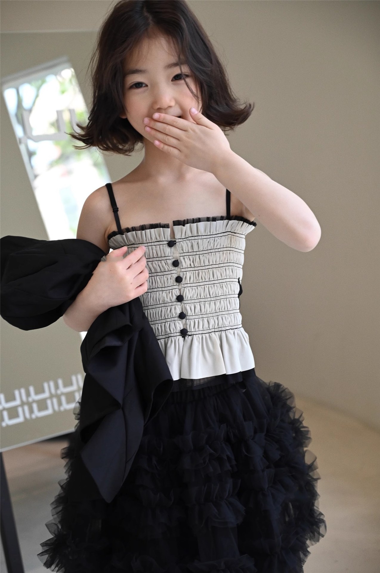 한국 아동복 여름 여아 세트, 세련된 배색 멜빵 상의와 트렌디한 아동용 메쉬 스커트