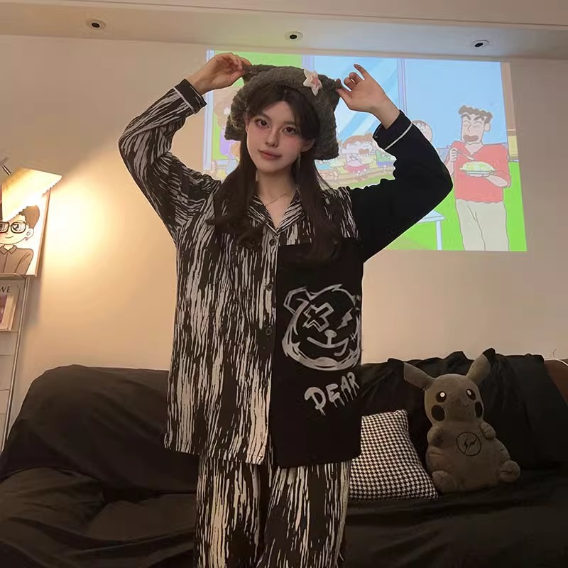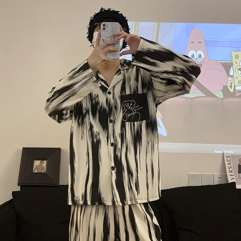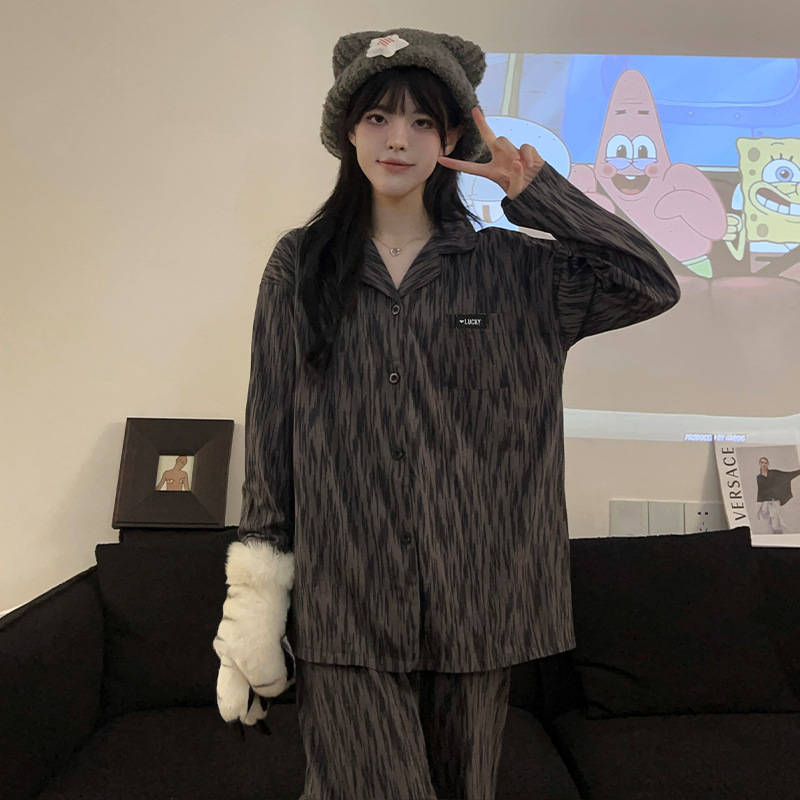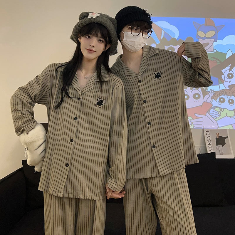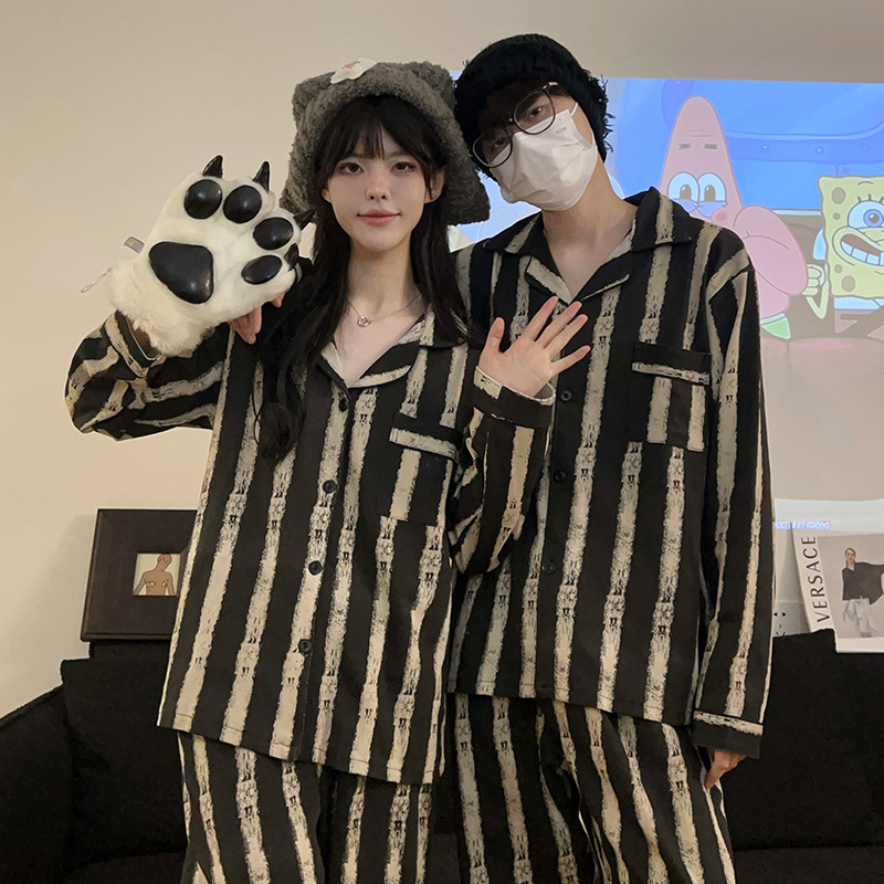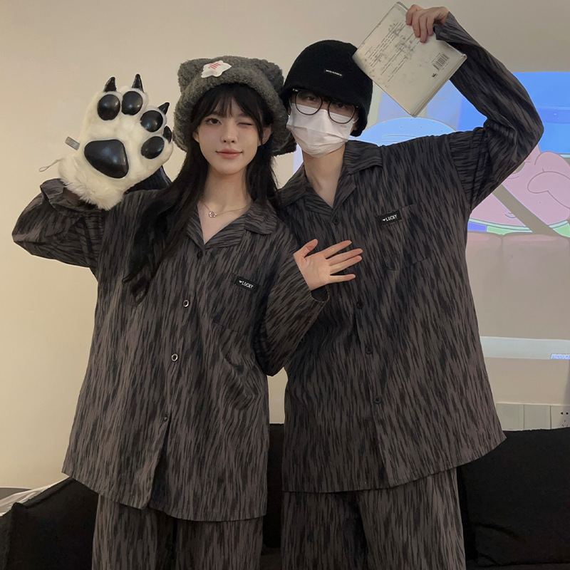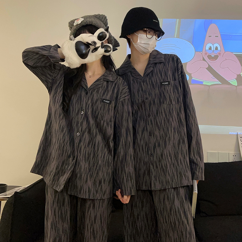 잉크 간단한 스타일 편지 커플 잠옷 여성의 봄과 가을 둥근 목 두 조각 세트 긴 소매 남성 플러스 사이즈 홈 옷스토어 가기